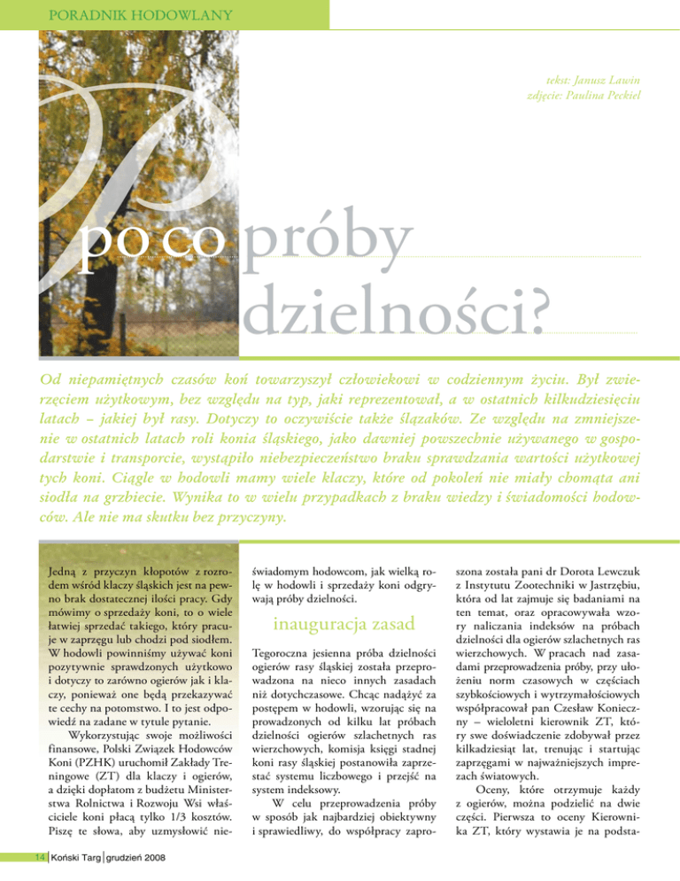 P poradnik hodowlany tekst: Janusz Lawin zdjęcie: Paulina Peckiel po co próby dzielności? Od niepamiętnych czasów koń towarzyszył człowiekowi w codziennym życiu. Był zwierzęciem użytkowym, bez względu na typ, jaki reprezentował, a w ostatnich kilkudziesięciu latach – jakiej był rasy. Dotyczy to oczywiście także ślązaków. Ze względu na zmniejszenie w ostatnich latach roli konia śląskiego, jako dawniej powszechnie używanego w gospodarstwie i transporcie, wystąpiło niebezpieczeństwo braku sprawdzania wartości użytkowej tych koni. Ciągle w hodowli mamy wiele klaczy, które od pokoleń nie miały chomąta ani siodła na grzbiecie. Wynika to w wielu przypadkach z braku wiedzy i świadomości hodowców. Ale nie ma skutku bez przyczyny. Jedną z przyczyn kłopotów z rozrodem wśród klaczy śląskich jest na pewno brak dostatecznej ilości pracy. Gdy mówimy o sprzedaży koni, to o wiele łatwiej sprzedać takiego, który pracuje w zaprzęgu lub chodzi pod siodłem. W hodowli powinniśmy używać koni pozytywnie sprawdzonych użytkowo i dotyczy to zarówno ogierów jak i klaczy, ponieważ one będą przekazywać te cechy na potomstwo. I to jest odpowiedź na zadane w tytule pytanie. Wykorzystując swoje możliwości finansowe, Polski Związek Hodowców Koni (PZHK) uruchomił Zakłady Treningowe (ZT) dla klaczy i ogierów, a dzięki dopłatom z budżetu Ministerstwa Rolnictwa i Rozwoju Wsi właściciele koni płacą tylko 1/3 kosztów. Piszę te słowa, aby uzmysłowić nie14 Koński Targ grudzień 2008 świadomym hodowcom, jak wielką rolę w hodowli i sprzedaży koni odgrywają próby dzielności. inauguracja zasad Tegoroczna jesienna próba dzielności ogierów rasy śląskiej została przeprowadzona na nieco innych zasadach niż dotychczasowe. Chcąc nadążyć za postępem w hodowli, wzorując się na prowadzonych od kilku lat próbach dzielności ogierów szlachetnych ras wierzchowych, komisja księgi stadnej koni rasy śląskiej postanowiła zaprzestać systemu liczbowego i przejść na system indeksowy. W celu przeprowadzenia próby w sposób jak najbardziej obiektywny i sprawiedliwy, do współpracy zapro- szona została pani dr Dorota Lewczuk z Instytutu Zootechniki w Jastrzębiu, która od lat zajmuje się badaniami na ten temat, oraz opracowywała wzory naliczania indeksów na próbach dzielności dla ogierów szlachetnych ras wierzchowych. W pracach nad zasadami przeprowadzenia próby, przy ułożeniu norm czasowych w częściach szybkościowych i wytrzymałościowych współpracował pan Czesław Konieczny – wieloletni kierownik ZT, który swe doświadczenie zdobywał przez kilkadziesiąt lat, trenując i startując zaprzęgami w najważniejszych imprezach światowych. Oceny, które otrzymuje każdy z ogierów, można podzielić na dwie części. Pierwsza to oceny Kierownika ZT, który wystawia je na podsta- Elewado wie obserwacji przez 60 dni treningu. Są to oceny za: charakter i zachowanie, przydatność zaprzęgową, zdrowie i wykorzystanie paszy, stęp w zaprzęgu oraz kłus w zaprzęgu. Druga część, to oceny komisji wystawiane w dniach próby dzielności. Z wyjątkiem ocen na czworoboku, pozostałe są ocenami otrzymanymi z odczytu czasu na stoperze. Głównymi zasadami próby dla ogierów śląskich było przeprowadzenie jej w taki sposób, aby stawiane koniom wymagania były adekwatne do ich młodego wieku, a system ocen był jak najbardziej obiektywny. W ocenie komisji sędziowskiej oraz członków komisji księgi stadnej koni rasy śląskiej, założenia tej próby zostały spełnione. Tym bardziej, że fe- notyp stawki ogierów był zróżnicowany. Daje się zauważyć, że coraz więcej koni śląskich „staje się” bardziej szlachetna, lekka i tym samym łatwiej im uporać się z wymogami próby. Ale nie jest to przecież główny cel hodowli koni tej rasy, aby w krótkim czasie zmienić je na lekkie konie półkrwi. Jeżeli ktoś z hodowców chce wyhodować takiego konia, to klacz śląską można pokryć ogierem pełnej krwi angielskiej, która to rasa jako jedyna obca jest w tej chwili dopuszczona do hodowli ślązaków. Poza tym, mamy dostatecznie dużo ogierów śląskich w lżejszym typie, których użycie pozwoli osiągnąć obrany cel. Nasze stałe obawy dotyczą konia śląskiego w starym typie, który uczestnicząc w próbach dzielności nie bę- dzie potrafił poradzić sobie z ich wymaganiami. Okazało się, że wymagania próby dotyczące części szybkościowej i wytrzymałościowej były doskonale dobrane. Kłus na dystansie 3 km konie pokonywały w przedziale czasowym od 11’20” do 12’. Na 36 ogierów startujących w próbie, 32 otrzymały maksymalną liczbę 10 punktów. Podobnie wyglądała sytuacja w próbie stępa na 500 m. Tak więc nie ma potrzeby obawiać się o te części próby. Chcemy hodować konia z dobrym stępem i kłusem, chętnie współpracującego z człowiekiem w zaprzęgu, z żywym impulsem w ruchu do przodu. Dążąc do ideału nie należy zapominać o charakterze, zdrowiu i dobrym wykorzystaniu paszy. grudzień 2008 Koński Targ 15 poradnik hodowlany Tegoroczną próbę dzielności będziemy wspominać jako tę, gdzie wielkiego figla spłatała nam pogoda. Dwa dni nieustających opadów zamieniły niezłe w ubiegłych latach podłoże w błotnistą maź, w której poruszały się ubłocone ogiery w bryczkach maratonowych. Biorąc pod uwagę te bardzo niekorzystne warunki, komisja obniżyła o 10% obowiązujące normy czasowe. tegoroczne osiągnięcia Przyjrzyjmy się teraz ogierom, które zajęły czołowe miejsca w próbie. Wygrał ją kary ogier o tajemniczym imieniu IX. We wszystkich częściach próby otrzymał maksymalne w tym dniu oceny. Koń pięknie prezentujący się na czworoboku, o bardzo ładnej sylwetce, aktywny, który wyraźnie zaznaczył różnice w rodzajach stępa i kłusa. Jest on synem ogiera LOKAN, jedynego w Stadzie Ogierów Książ syna niezapomnianego LARGISA. M