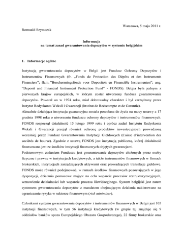 Warszawa, 5 maja 2011 r. Romuald Szymczak Informacja na temat zasad gwarantowania depozytów w systemie belgijskim 1. Informacje ogólne Instytucją gwarantowania depozytów w Belgii jest Fundusz Ochrony Depozytów i Instrumentów Finansowych (fr. „Fonds de Protection des Dépôts et des Instruments Financiers”; flam. ”Beschermingsfonds voor Deposito's en Financiële Instrumenten”; ang. “Deposit and Financial Instrument Protection Fund” - FONDS). Belgia była jednym z pierwszych krajów europejskich, w którym został utworzony fundusz gwarantowania depozytów. Powstał on w 1974 roku, miał dobrowolny charakter i był zarządzany przez Instytut Redyskonta Weksli i Gwarancji (Institut de Reéscompte et de Garantie). Aktualnie działająca instytucja gwarancyjna została powołana do Ŝycia na mocy ustawy z 17 grudnia 1998 roku o utworzeniu funduszu ochrony depozytów i instrumentów finansowych. FONDS rozpoczął działalność 15 lutego 1999 roku i oprócz zadań Instytutu Redyskonta Weksli i Gwarancji przejął równieŜ ochronę produktów inwestycyjnych prowadzoną wcześniej przez Fundusz Gwarantowania Instytucji Giełdowych (Caisse d’intervention des sociétés de bourse). Zgodnie z ustawą FONDS jest instytucją publiczną, której działalność finansowana jest ze środków instytucji finansowych objętych gwarancjami. Podstawowym zadaniem Funduszu jest gwarantowanie depozytów złoŜonych przez osoby fizyczne i prawne w instytucjach kredytowych, a takŜe instrumentów finansowych w firmach brokerskich, instytucjach zarządzających aktywami oraz prowadzących transakcje giełdowe. FONDS moŜe równieŜ podejmować, w ramach środków finansowych pozostających w jego dyspozycji, działania pomocowe mające na celu wsparcie procesów restrukturyzacyjnych, wznowienie działalności lub wsparcie procesu likwidacyjnego. System belgijski jest zatem systemem gwarantowania depozytów z mandatem obejmującym działania nakierowane na ograniczanie ryzyka w sektorze finansowym (risk minimizer). Członkami systemu gwarantowania depozytów i instrumentów finansowych w Belgii jest 105 instytucji finansowych, w tym 56 instytucji kredytowych (w grupie tej znajduje się 9 oddziałów banków spoza Europejskiego Obszaru Gospodarczego), 22 firmy brokerskie oraz 27 innych instytucji finansowych (np. instytucje zarządzające aktywami, towarzystwa wspólnego inwestowania). Członkostwo w systemie jest obowiązkowe. W Polsce nie działają oddziały banków belgijskich, które naleŜałyby do FONDS. Fundusz jest członkiem Europejskiego Forum Gwarantów Depozytów (EFDI) oraz Międzynarodowego Stowarzyszenia Gwarantów Depozytów (IADI). 2. Organy decyzyjne Organem decyzyjnym FONDS jest Komitet Zarządzający (Management Committee). Komitet składa się z przewodniczącego oraz 11 członków. Przewodniczący oraz pięciu członków mianowanych jest przez króla Belgów spośród kandydatów reprezentujących sektor publiczny. Pozostałych sześciu członków Komitetu Zarządzającego reprezentuje instytucje członkowskie. Czterech z nich wskazanych jest przez stowarzyszenia instytucji kredytowych, a pozostałych dwóch przez stowarzyszenia innych instytucji finansowych. Kandydatów tych równieŜ zatwierdza król. Listy przedkładane królowi muszą zawierać po trzy nazwiska na kaŜdy wakujący mandat członka Komitetu Zarządzającego. Kadencja przewodniczącego i członków trwa sześć lat. Kadencje te mogą być odnawiane. W posiedzeniach Komitetu uczestniczy ponadto, bez prawa głosu, przedstawiciel Władzy Nadzorczej nad Usługami Finansowymi i Rynkami (Financial Services and Markets Authority – FSMA). Instytucja ta zastąpiła od 1 kwietnia 2011 roku Komisję Bankowości, Finansów i Ubezpieczeń (Banking, Financial and Insurance Commission) i jest jedną z dwóch działających w Belgii instytucji nadzorczych nad rynkiem finansowym (drugą z nich jest Narodowy Bank Belgii). Fundusz Ochrony Depozytów i Instrumentów Finansowych nie ma własnej siedziby i korzysta z powierzchni biurowej w budynku Narodowego Banku Belgii. Organem wykonawczym Funduszu jest Sekretarz Generalny (Secretary General). Jest on powoływany przez Komitet Zarządzający. Przewodniczącym FONDS jest obecnie Jean-Pierre Arnoldi. Sekretarzem Generalnym i jednocześnie reprezentantem Funduszu w relacjach ze światem zewnętrznym jest Herman Debremaeker. 3. Zakres gwarancji depozytów i zasady wypłaty środków gwarantowanych 2 Z prawnego punktu widzenia belgijski system gwarantowania depozytów został w pełni dostosowany do przepisów Dyrektywy 2009/14/WE z 11 marca 2009 r. nowelizującej Dyrektywę 94/19/WE w sprawie systemów gwarancji depozytów. FONDS gwarantuje wkłady na rachunkach w bankach i w innych instytucjach finansowych osobom fizycznym oraz prawnym, uprawnionym do sporządzania uproszczonych sprawozdań finansowych. W całości gwarantowane są depozyty do wysokości 100.000 EUR, zarówno w euro, jak i w pozostałych walutach Europejskiego Obszaru Gospodarczego. Gwarancjami nie są natomiast objęte depozyty w innych walutach. W przypadku wspólnych rachunków dwóch lub więcej osób, kaŜda z nich uprawniona jest do zwrotu środków w wysokości do równowartości limitu gwarancyjnego. Obok depozytów w bankach FONDS gwarantuje równieŜ instrumenty finansowe nabyte w instytucjach członkowskich Funduszu. W tym przypadku limit gwarancji wynosi 20.000 EUR na właściciela i na instytucję finansową. Od 1 stycznia 2011 roku gwarancjami objęte są takŜe polisy ubezpieczeniowe na Ŝycie wykupione w towarzystwach ubezpieczeniowych. System belgijski stosuje wyłączenia podmiotowe, które są dopuszczalne na mocy obowiązującej Dyrektywy UE. Gwarancjami nie są objęte depozyty instytucji finansowych oraz firm ubezpieczeniowych, funduszy emerytalnych i towarzystw funduszy wzajemnych. Do wypłaty sum gwarantowanych nie są takŜe uprawnieni wyŜsi menedŜerowie likwidowanego banku i ich kr