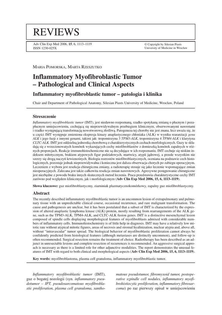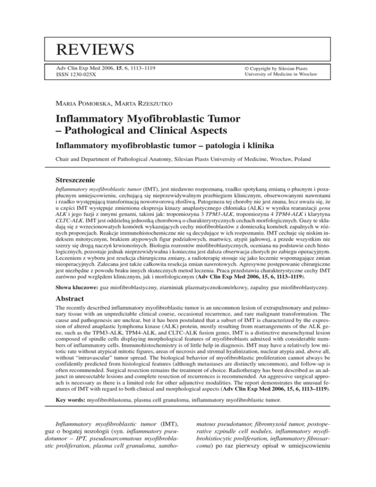 REVIEWS Adv Clin Exp Med 2006, 15, 6, 1113–1119 ISSN 1230−025X © Copyright by Silesian Piasts University of Medicine in Wrocław MARIA POMORSKA, MARTA RZESZUTKO Inflammatory Myofibroblastic Tumor – Pathological and Clinical Aspects Inflammatory myofibroblastic tumor – patologia i klinika Chair and Department of Pathological Anatomy, Silesian Piasts University of Medicine, Wrocław, Poland Streszczenie Inflammatory myofibroblastic tumor (IMT), jest niedawno rozpoznaną, rzadko spotykaną zmianą o płucnym i poza− płucnym umiejscowieniu, cechującą się nieprzewidywalnym przebiegiem klinicznym, obserwowanymi nawrotami i rzadko występującą transformacją nowotworową złośliwą. Patogeneza tej choroby nie jest znana, lecz uważa się, że u części IMT występuje zmieniona ekspresja kinazy anaplastycznego chłoniaka (ALK) w wyniku rearanżacji genu ALK i jego fuzji z innymi genami, takimi jak: tropomiozyna 3 TPM3−ALK, tropomiozyna 4 TPM4−ALK i klarytyna CLTC−ALK. IMT jest oddzielną jednostką chorobową o charakterystycznych cechach morfologicznych. Guzy te skła− dają się z wrzecionowatych komórek wykazujących cechy miofibroblastów z domieszką komórek zapalnych w róż− nych proporcjach. Reakcje immunohistochemiczne nie są decydujące w ich rozpoznaniu. IMT cechuje się niskim in− deksem mitotycznym, brakiem atypowych figur podziałowych, martwicy, atypii jądrowej, a przede wszystkim nie szerzy się drogą naczyń krwionośnych. Biologia rozrostów miofibroblastycznych, oceniana na podstawie cech histo− logicznych, pozostaje jednak nieprzewidywalna i konieczna jest dalsza obserwacja chorych po zabiegu operacyjnym. Leczeniem z wyboru jest resekcja chirurgiczna zmiany, a radioterapię stosuje się jako leczenie wspomagające zmian nieoperacyjnych. Zalecana jest także całkowita resekcja zmian nawrotowych. Agresywne postępowanie chirurgiczne jest niezbędne z powodu braku innych skutecznych metod leczenia. Praca przedstawia charakterystyczne cechy IMT zarówno pod względem klinicznym, jak i morfologicznym (Adv Clin Exp Med 2006, 15, 6, 1113–1119). Słowa kluczowe: guz miofibroblastyczny, ziarniniak plazmatycznokomórkowy, zapalny guz miofibroblastyczny. Abstract The recently described inflammatory myofibroblastic tumor is an uncommon lesion of extrapulmonary and pulmo− nary tissue with an unpredictable clinical course, occasional recurrence, and rare malignant transformation. The cause and pathogenesis are unclear, but it has been postulated that a subset of IMT is characterized by the expres− sion of altered anaplastic lymphoma kinase (ALK) protein, mostly resulting from rearrangements of the ALK ge− ne, such as the TPM3−ALK, TPM4−ALK, and CLTC−ALK fusion genes. IMT is a distinctive mesenchymal lesion composed of spindle cells displaying morphological features of myofibroblasts admixed with considerable num− bers of inflammatory cells. Immunohistochemistry is of little help in diagnosis. IMT may have a relatively low mi− totic rate without atypical mitotic figures, areas of necrosis and stromal hyalinization, nuclear atypia and, above all, without “intravascular” tumor spread. The biological behavior of myofibroblastic proliferation cannot always be confidently predicted from histological features (although metastases are distinctly uncommon), and follow−up is often recommended. Surgical resection remains the treatment of choice. Radiotherapy has been described as an ad− junct in unresectable lesions and complete resection of recurrences is recommended. An aggressive surgical appro− ach is necessary as there is a limited role for other adjunctive modalities. The report demonstrates the unusual fe− atures of IMT with regard to both clinical and morphological aspects (Adv Clin Exp Med 2006, 15, 6, 1113–1119). Key words: myofibroblastoma, plasma cell granuloma, inflammatory myofibroblastic tumor. Inflammatory myofibroblastic tumor (IMT), guz o bogatej nozologii (syn. inflammatory pseu− dotumor – IPT, pseudosarcomatous myofibrobla− stic proliferation, plasma cell granuloma, xantho− matous pseudotumor, fibromyxoid tumor, postope− rative szpindle cell nodules, inflammatory myofi− brohistiocytic proliferation, inflammatory fibrosar− coma) po raz pierwszy opisał w umiejscowieniu 1114 płucnym Brunn w 1937 roku [1]. Termin inflam− matory myofibroblastic tumor został zaproponowa− ny w 1990 r. przez Pettinato [2]. Jest to zmiana o nieznanej etiologii, rzadko występująca u dzieci i młodych dorosłych, nieco częściej u kobiet [3, 4]. U dorosłych IMT występują najczęściej w płucach, u dzieci przeważa umiejscowienie pozapłucne, naj− częściej w układzie moczowym, przewodzie po− karmowym i krezce. W badaniach Coffin et al. [5] (47 przypadków) 75% IMT u dzieci pochodziło z jamy otrzewnej, miednicy i przestrzeni zaotrzew− nowej, a 20% z płuc. Opisano także guzy o rzad− szym umiejscowieniu (żyła czcza dolna, rdzeń krę− gowy, pośladki, gruczoł piersiowy, gałka oczna, ślinianki (Kutner tumor), śledziona, wątroba), co potwierdza, że mogą one wystąpić w każdym na− rządzie [6, 7]. Również włóknienie pozaotrzewno− we (choroba Ormonda) oraz choroba Riedla wyka− zują wspólne cechy z IMT. Pod względem histologicznym jest to zmiana zbudowana z wrzecionowatych miofibroblastów i nacieku zapalnego, złożonego z plazmocytów, limfocytów oraz czasem z histiocytów. Wciąż trwa dyskusja, czy u podłoża zmiany leży reaktywna proliferacja, czy jest to nowotwór. Mimo łagodnej natury histologicznej, występują przypadki o miej− scowej złośliwości i tendencji do nawrotów. Opi− sywane przez niektórych badaczy zaburzenia chromosomalne mogą potwierdzić teorię, że przy− namniej niektóre z tych guzów są nowotworami. Podobnie nieokreślone są: częstość występowania guzów wieloogniskowych, częstość guzów dają− cych przerzuty oraz prognostyczna w