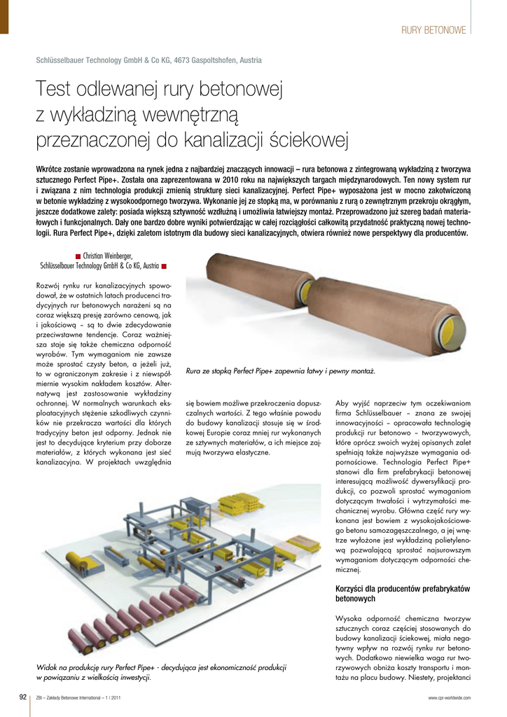 RURY BETONOWE Schlüsselbauer Technology GmbH & Co KG, 4673 Gaspoltshofen, Austria Test odlewanej rury betonowej z wykładziną wewnętrzną przeznaczonej do kanalizacji ściekowej Wkrótce zostanie wprowadzona na rynek jedna z najbardziej znaczących innowacji – rura betonowa z zintegrowaną wykładziną z tworzywa sztucznego Perfect Pipe+. Została ona zaprezentowana w 2010 roku na największych targach międzynarodowych. Ten nowy system rur i związana z nim technologia produkcji zmienią strukturę sieci kanalizacyjnej. Perfect Pipe+ wyposażona jest w mocno zakotwiczoną w betonie wykładzinę z wysokoodpornego tworzywa. Wykonanie jej ze stopką ma, w porównaniu z rurą o zewnętrznym przekroju okrągłym, jeszcze dodatkowe zalety: posiada większą sztywność wzdłużną i umożliwia łatwiejszy montaż. Przeprowadzono już szereg badań materiałowych i funkcjonalnych. Dały one bardzo dobre wyniki potwierdzając w całej rozciągłości całkowitą przydatność praktyczną nowej technologii. Rura Perfect Pipe+, dzięki zaletom istotnym dla budowy sieci kanalizacyjnych, otwiera również nowe perspektywy dla producentów. Christian Weinberger, Schlüsselbauer Technology GmbH & Co KG, Austria Rozwój rynku rur kanalizacyjnych spowodował, że w ostatnich latach producenci tradycyjnych rur betonowych narażeni są na coraz większą presję zarówno cenową, jak i jakościową – są to dwie zdecydowanie przeciwstawne tendencje. Coraz ważniejsza staje się także chemiczna odporność wyrobów. Tym wymaganiom nie zawsze może sprostać czysty beton, a jeżeli już, to w ograniczonym zakresie i z niewspółmiernie wysokim nakładem kosztów. Alternatywą jest zastosowanie wykładziny ochronnej. W normalnych warunkach eksploatacyjnych stężenie szkodliwych czynników nie przekracza wartości dla których tradycyjny beton jest odporny. Jednak nie jest to decydujące kryterium przy doborze materiałów, z których wykonana jest sieć kanalizacyjna. W projektach uwzględnia Rura ze stopką Perfect Pipe+ zapewnia łatwy i pewny montaż. się bowiem możliwe przekroczenia dopuszczalnych wartości. Z tego właśnie powodu do budowy kanalizacji stosuje się w środkowej Europie coraz mniej rur wykonanych ze sztywnych materiałów, a ich miejsce zajmują tworzywa elastyczne. Aby wyjść naprzeciw tym oczekiwaniom firma Schlüsselbauer – znana ze swojej innowacyjności – opracowała technologię produkcji rur betonowo – tworzywowych, które oprócz swoich wyżej opisanych zalet spełniają także najwyższe wymagania odpornościowe. Technologia Perfect Pipe+ stanowi dla firm prefabrykacji betonowej interesującą możliwość dywersyfikacji produkcji, co pozwoli sprostać wymaganiom dotyczącym trwałości i wytrzymałości mechanicznej wyrobu. Główna część rury wykonana jest bowiem z wysokojakościowego betonu samozagęszczalnego, a jej wnętrze wyłożone jest wykładziną polietylenową pozwalającą sprostać najsurowszym wymaganiom dotyczącym odporności chemicznej. Korzyści dla producentów prefabrykatów betonowych Widok na produkcję rury Perfect Pipe+ - decydująca jest ekonomiczność produkcji w powiązaniu z wielkością inwestycji. 92 ZBI – Zakłady Betonowe International – 1 | 2011 Wysoka odporność chemiczna tworzyw sztucznych coraz częściej stosowanych do budowy kanalizacji ściekowej, miała negatywny wpływ na rozwój rynku rur betonowych. Dodatkowo niewielka waga rur tworzywowych obniża koszty transportu i montażu na placu budowy. Niestety, projektanci www.cpi-worldwide.com RURY BETONOWE Nowy system rur o średnicach od DN 200 do DN 600 zaprezentowany został na targach IFAT 2010 w Monachium. Widok rury betonowo-tworzywowej Perfect Pipe+. i wykonawcy za mało uwagi poświęcają coraz częściej podnoszonym wnioskom inwestorów o udzielenie gwarancji wytrzymałości statycznej i mechanicznej oraz zapewnienie pewności montażu, stabilnego posadowienia i długowieczności sieci kanalizacyjnej. Betonowo-tworzywowa rura Perfect Pipe+ spełnia wszystkie te postulaty. Jak dotąd żaden typ rury stosowany do budowy sieci kanalizacyjnej nie spełniał w dostatecznej mierze wszystkich tych wymagań. Fakt ten był inspiracją do opracowania nowego systemu rur Perfect Pipe+. Zaprezentowana na targach IFAT 2010 rura betonowo-tworzywowa charakteryzuje się bardzo mocnym i trwałym połączeniem wewnętrznej wykładziny polietylenowej. Jest ona osadzana w betonie już w trakcie produkcji w zakładzie prefabrykacji. Innowacja polega z jednej strony na optymalizacji zakotwiczenia wykładziny w betonie, a z drugiej na zastosowaniu betonu samozagęszczalnego. Wielka ilość wypustek kotwiących wykładzinę zapewnia stabilne połączenie z masywnym betonem. Odlewane rury betonowe z wykładziną polietylenową stanowią nowy typ wyrobu na potrzeby kanalizacji. Ich produkcja może przebiegać zupełnie niezależnie od istniejących już w zakładzie linii produkcyjnych. W przypadku, gdy stosowana jest już technologia odlewania betonu, można ją wkomponować w pracujące już rozwiązania. Rury betonowo-tworzywowe znajdą zastosowanie nie tylko w normalnych sieciach kanalizacyjnych, ale także w tych segmentach rynku, które są do tej pory niedostępne dla zwykłych rur betonowych. Pozwoli to producentom rozszerzyć udział ich wyrobów na nowe sektory rynku. Trwałe połączenie materiałów nawet przy zmiennych temperaturach. Najważniejsze nie jest widoczne w gotowej rurze – opracowana specjalnie na potrzeby tej rury wykładzina z wieloma wypustkami kotwiącymi na jej zewnętrznej powierzchni. Jeżeli rura betonowo-tworzywowa Perfect Pipe+ nie zostanie mechanicznie uszkodzona podczas montażu na budowie, to połączeniu wykładziny polietylenowej z betonem Nowy system rur jest przeznaczony zarówno do technologii wykopowej jak i mikrotunelingu. www.cpi-worldwide.com ZBI – Zakłady Betonowe International – 1 | 2011 RURY BETONOWE nie zagraża już żadne 