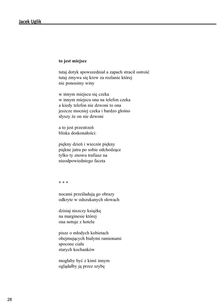 Jacek Uglik to jest miejsce tutaj dotyk spowszedniał a zapach stracił ostrość tutaj zmywa się krew za rozlanie której nie ponosimy winy w innym miejscu się czeka w innym miejscu ona na telefon czeka a kiedy telefon nie dzwoni to ona jeszcze mocniej czeka i bardzo głośno słyszy że on nie dzwoni a to jest przestrzeń bliska doskonałości: piękny dzień i wieczór piękny piękne jutra po sobie odchodzące tylko ty znowu trafiasz na nieodpowiedniego faceta *** nocami prześladują go obrazy odkryte w odszukanych słowach dzisiaj niszczy książkę na marginesie której ona notuje z hotelu pisze o młodych kobietach obejmujących białymi ramionami spocone ciała starych kochanków mogłaby być z kimś innym oglądałby ją przez szybę 28 Jacek Uglik *** cze tato, nie odbierał ja telefonu by był na rekolekcjach w zakopcu w nocy pił a w dzień paciorki zmawiał i zanosił prośby błagalne aby szwedzkie stiuardesy przyjechały. nie przyjechały. *** ta, tato, wiem że świetlik nie jest już taki jak przed pierwszą wojną, którą przegrał, że skończył się na kill`em all, jak to mówią, mimo to jestem mu wierny, wierny jak pies za ścianą (jak to nocą za ścianą) tynk zbijają. zaraz zejdzie do sąsiadki mój kolega a jej kochanek, jeden z tych, o których jestem przekonany, że są dobrzy. nie to co ty. jest już alkoholikiem – już chyba go nie zobaczymy w żadnym serialu. przesiaduję na półpiętrze, na krześle zostawionym przez włocha. kopcę faje, patrzę w okno, a tam albo piją, albo się pieprzą. 29