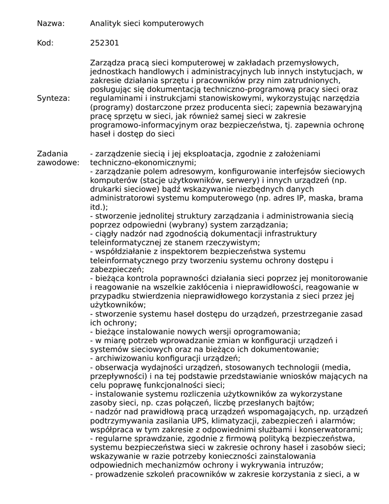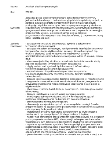Nazwa: Analityk sieci komputerowych Kod: 252301 Synteza: Zarządza pracą sieci komputerowej w zakładach przemysłowych, jednostkach handlowych i administracyjnych lub innych instytucjach, w zakresie działania sprzętu i pracowników przy nim zatrudnionych, posługując się dokumentacją techniczno-programową pracy sieci oraz regulaminami i instrukcjami stanowiskowymi, wykorzystując narzędzia (programy) dostarczone przez producenta sieci; zapewnia bezawaryjną pracę sprzętu w sieci, jak również samej sieci w zakresie programowo-informacyjnym oraz bezpieczeństwa, tj. zapewnia ochronę haseł i dostęp do sieci Zadania zawodowe: - zarządzenie siecią i jej eksploatacja, zgodnie z założeniami techniczno-ekonomicznymi; - zarządzanie polem adresowym, konfigurowanie interfejsów sieciowych komputerów (stacje użytkowników, serwery) i innych urządzeń (np. drukarki sieciowe) bądź wskazywanie niezbędnych danych administratorowi systemu komputerowego (np. adres IP, maska, brama itd.); - stworzenie jednolitej struktury zarządzania i administrowania siecią poprzez odpowiedni (wybrany) system zarządzania; - ciągły nadzór nad zgodnością dokumentacji infrastruktury teleinformatycznej ze stanem rzeczywistym; - współdziałanie z inspektorem bezpieczeństwa systemu teleinformatycznego przy tworzeniu systemu ochrony dostępu i zabezpieczeń; - bieżąca kontrola poprawności działania sieci poprzez jej monitorowanie i reagowanie na wszelkie zakłócenia i nieprawidłowości, reagowanie w przypadku stwierdzenia nieprawidłowego korzystania z sieci przez jej użytkowników; - stworzenie systemu haseł dostępu do urządzeń, przestrzeganie zasad ich ochrony; - bieżące instalowanie nowych wersji oprogramowania; - w miarę potrzeb wprowadzanie zmian w konfiguracji urządzeń i systemów sieciowych oraz na bieżąco ich dokumentowanie; - archiwizowaniu konfiguracji urządzeń; - obserwacja wydajności urządzeń, stosowanych technologii (media, przepływności) i na tej podstawie przedstawianie wniosków mających na celu poprawę funkcjonalności sieci; - instalowanie systemu rozliczenia użytkowników za wykorzystane zasoby sieci, np. czas połączeń, liczbę przesłanych bajtów; - nadzór nad prawidłową pracą urządzeń wspomagających, np. urządzeń podtrzymywania zasilania UPS, klimatyzacji, zabezpieczeń i alarmów; współpraca w tym zakresie z odpowiednimi służbami i konserwatorami; - regularne sprawdzanie, zgodnie z firmową polityką bezpieczeństwa, systemu bezpieczeństwa sieci w zakresie ochrony haseł i zasobów sieci; wskazywanie w razie potrzeby konieczności zainstalowania odpowiednich mechanizmów ochrony i wykrywania intruzów; - prowadzenie szkoleń pracowników w zakresie korzystania z sieci, a w szczególności informowanie o dostępnych usługach i ich możliwościach; - wykonywanie zadań związanych z podanymi wyżej; - nadzorowanie innych pracowników. Dodatkowe zadania zawodowe: - wykonywanie czynności i zadań administratora systemu komputerowego.