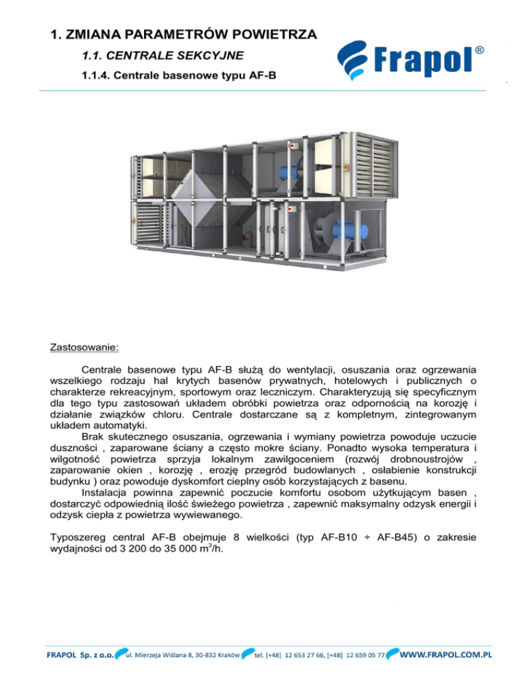 1. ZMIANA PARAMETRÓW POWIETRZA 1.1. CENTRALE SEKCYJNE 1.1.4. Centrale basenowe typu AF-B Zastosowanie: Centrale basenowe typu AF-B służą do wentylacji, osuszania oraz ogrzewania wszelkiego rodzaju hal krytych basenów prywatnych, hotelowych i publicznych o charakterze rekreacyjnym, sportowym oraz leczniczym. Charakteryzują się specyficznym dla tego typu zastosowań układem obróbki powietrza oraz odpornością na korozję i działanie związków chloru. Centrale dostarczane są z kompletnym, zintegrowanym układem automatyki. Brak skutecznego osuszania, ogrzewania i wymiany powietrza powoduje uczucie duszności , zaparowane ściany a często mokre ściany. Ponadto wysoka temperatura i wilgotność powietrza sprzyja lokalnym zawilgoceniem (rozwój drobnoustrojów , zaparowanie okien , korozję , erozję przegród budowlanych , osłabienie konstrukcji budynku ) oraz powoduje dyskomfort cieplny osób korzystających z basenu. Instalacja powinna zapewnić poczucie komfortu osobom użytkującym basen , dostarczyć odpowiednią ilość świeżego powietrza , zapewnić maksymalny odzysk energii i odzysk ciepła z powietrza wywiewanego. Typoszereg central AF-B obejmuje 8 wielkości (typ AF-B10 ÷ AF-B45) o zakresie wydajności od 3 200 do 35 000 m3/h. 1. ZMIANA PARAMETRÓW POWIETRZA 1.1. CENTRALE SEKCYJNE 1.1.4. Centrale basenowe typu AF-B Zasada działania : • Odzysk ciepła Najlepszym rozwiązaniem dla wentylacji krytych basenów jest zastosowanie centrali wentylacyjnej z odzyskiem ciepła . W tym celu firma FRAPOL stworzyła gamę urządzeń pozwalających na kompleksowe rozwiązania problemów wentylacji , klimatyzacji i osuszania hal krytych pływalni. Centrale basenowe FRAPOL zostały wyposażone w jedno- , dwu- lub trójstopniowe systemy odzysku ciepła wykorzystujące w zależności od potrzeb , recyrkulację powietrza , odzyskiwanie ciepła w zainstalowanych wymiennikach krzyżowych i rurkach ciepła , lub za pomocą pompy ciepła oraz obejmujących inne procesy uzdatniania powietrza dzięki zespołom i urządzeniom funkcjonalnym stanowiącym standardowe wyposażenie central ( chłodnice , nagrzewnice , filtry powietrza , przepustnice regulacyjne itp.) . Centrale basenowe FRAPOL charakteryzują się zwiększoną odpornością na korozję i działanie związków chloru. • Osuszanie powietrza W środowisku jakim jest kryta pływalnia , system osuszania musi być dobrze zaprojektowany i zapewnić duże bezpieczeństwo eksploatacji. Sterowanie funkcją osuszania i temperaturą jest dostosowane do pory roku. Osuszanie powietrza odbywa się poprzez doprowadzenie do pomieszczenia hali basenowej określonej ilości powietrza świeżego , które jest w stanie zasymilować zyski wilgoci . Recyrkulacja powietrza wyciąganego oraz zastosowanie wymienników odzysku ciepła powoduje , że centrale są energooszczędne. 1. ZMIANA PARAMETRÓW POWIETRZA 1.1. CENTRALE SEKCYJNE 1.1.4. Centrale basenowe typu AF-B Konfiguracje central basenowych: • Centrala basenowa typ R Centrala typu R jest centrala basenową z jednostopniowym odzyskiem ciepła z zastosowaniem recyrkulacji. Przeznaczona jest do wentylacji , osuszania i ogrzewania krytych basenów rekreacyjnych , publicznych oraz sportowych . W skład centrali wchodzi komora mieszania , nagrzewnica wodna oraz filtry kieszeniowe . Nagrzewnica wodna umożliwia podgrzanie powietrza nawiewanego do 45°C przy najniższej temperaturze zewnętrznej , dzięki czemu centrala może być wykorzystywana do pokrycia całkowitych lub częściowych strat ciepła obiektu. • Centrala basenowa typ R-WKR Centrala typu R-WKR jest centralą basenową z dwustopniowym odzyskiem ciepła z zastosowaniem recyrkulacji i wymiennika krzyżowego. Przeznaczona jest do wentylacji , osuszania i ogrzewania krytych basenów rekreacyjnych , publicznych oraz sportowych . Odzysk ciepła w wymienniku krzyżowym zapewnia istotne obniżenie kosztów eksploatacyjnych . W skład centrali wchodzi rekuperacyjny wymiennik krzyżowy, komora mieszania, wentylator nawiewny i wyciągowy, nagrzewnica wodna oraz filtry kieszeniowe . Nagrzewnica wodna umożliwia podgrzanie powietrza nawiewanego do 45°C przy najniższej temperaturze zewnętrznej , dzięki czemu centrala może być wykorzystywana do ogrzewania obiektu. 1. ZMIANA PARAMETRÓW POWIETRZA 1.1. CENTRALE SEKCYJNE 1.1.4. Centrale basenowe typu AF-B • Centrala basenowa typ R-WRO Centrala typu R-WRO jest centralą basenową z dwustopniowym odzyskiem ciepła z zastosowaniem recyrkulacji i wymiennika typu „rurka ciepła”. Przeznaczona jest do wentylacji , osuszania i ogrzewania krytych basenów rekreacyjnych , publicznych oraz sportowych. Odzysk ciepła w wymienniku typu „ rurka ciepła” zapewnia znaczne obniżenie kosztów eksploatacyjnych . W skład centrali wchodzi rekuperacyjny wymiennik typu „rurka ciepła”, komora mieszania, wentylator nawiewny i wyciągowy, nagrzewnica wodna oraz filtry kieszeniowe. Nagrzewnica wodna umożliwia podgrzanie powietrza nawiewanego do 45°C przy najniższej temperaturze zewnętrznej , dzięki czemu centrala może być wykorzystana do ogrzewania obiektu. • Centrala basenowa typ R-WKR-HP Centrala typu R-WKR-HP jest centralą basenową z trójstopniowym odzyskiem ciepła z zastosowaniem recyrkulacji , wymiennika krzyżowego i pompy ciepła. Przeznaczona jest do wentylacji , osuszania i ogrzewania krytych basenów rekreacyjnych , publicznych oraz sportowych. W skład centrali wchodzi rekuperacyjny wymiennik krzyżowy , pompa ciepła , komora mieszania , wentylator nawiewny i wyciągowy , nagrzewnica wodna oraz filtry kieszeniowe . W większości przypadków moc grzewcza centrali jest wystarczająca do pokrycia strat ciepła obiektu , dzięki czemu stosowanie innego rodzaju ogrzewania nie jest wymagane . Zaletą zastosowania pompy ciepła jest zwiększenie sprawności odzysku ciepła oraz wydajności osuszania. Opcjonalnie centrala może zostać wyposażona w dodatkowy skraplacz płytowy , umo