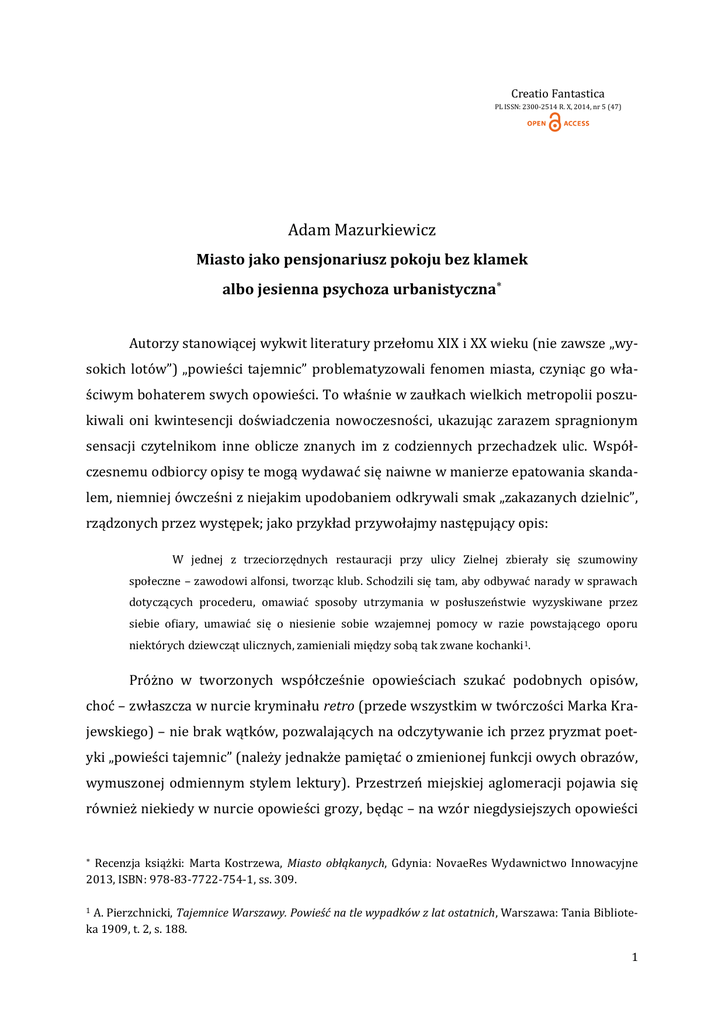 Creatio Fantastica PL ISSN: 2300-2514 R. X, 2014, nr 5 (47) Adam Mazurkiewicz Miasto jako pensjonariusz pokoju bez klamek albo jesienna psychoza urbanistyczna Autorzy stanowiącej wykwit literatury przełomu XIX i XX wieku (nie zawsze „wysokich lotów”) „powieści tajemnic” problematyzowali fenomen miasta, czyniąc go właściwym bohaterem swych opowieści. To właśnie w zaułkach wielkich metropolii poszukiwali oni kwintesencji doświadczenia nowoczesności, ukazując zarazem spragnionym sensacji czytelnikom inne oblicze znanych im z codziennych przechadzek ulic. Współczesnemu odbiorcy opisy te mogą wydawać się naiwne w manierze epatowania skandalem, niemniej ówcześni z niejakim upodobaniem odkrywali smak „zakazanych dzielnic”, rządzonych przez występek; jako przykład przywołajmy następujący opis: W jednej z trzeciorzędnych restauracji przy ulicy Zielnej zbierały się szumowiny społeczne – zawodowi alfonsi, tworząc klub. Schodzili się tam, aby odbywać narady w sprawach dotyczących procederu, omawiać sposoby utrzymania w posłuszeństwie wyzyskiwane przez siebie ofiary, umawiać się o niesienie sobie wzajemnej pomocy w razie powstającego oporu niektórych dziewcząt ulicznych, zamieniali między sobą tak zwane kochanki 1. Próżno w tworzonych współcześnie opowieściach szukać podobnych opisów, choć – zwłaszcza w nurcie kryminału retro (przede wszystkim w twórczości Marka Krajewskiego) – nie brak wątków, pozwalających na odczytywanie ich przez pryzmat poetyki „powieści tajemnic” (należy jednakże pamiętać o zmienionej funkcji owych obrazów, wymuszonej odmiennym stylem lektury). Przestrzeń miejskiej aglomeracji pojawia się również niekiedy w nurcie opowieści grozy, będąc – na wzór niegdysiejszych opowieści Recenzja książki: Marta Kostrzewa, Miasto obłąkanych, Gdynia: NovaeRes Wydawnictwo Innowacyjne 2013, ISBN: 978-83-7722-754-1, ss. 309. A. Pierzchnicki, Tajemnice Warszawy. Powieść na tle wypadków z lat ostatnich, Warszawa: Tania Biblioteka 1909, t. 2, s. 188. 1 1 – zarówno scenerią fabularnych zdarzeń, jak i ich niemym bohaterem; niedoścignionym pod tym względem projektem jest seria „City” Wydawnictwa FORMA, w ramach której ukazały się dotychczas m.in. dwie antologie, tematyzujące mroczne oblicza (po)nowoczesnego miasta. Oczywiście trudno wymagać, by tak śmiała koncepcyjnie i dopracowana artystycznie inicjatywa wydawnicza, jaką na rodzimym rynku zaproponowała owa szczecińska oficyna, mogła znaleźć masowego odbiorcę; adresowana jest ona do wąskiego kręgu czytelników, zainteresowanych literaturą nastrojową, w której to, co się wydarza, jest sekundarne wobec sposobów opowiadania. Nawet jednak mając tę świadomość i – mówiąc językiem bohatera Aleksandra Fredry – „znając proporcją”, trudno zgodzić się na lekturową propozycję, jaką przygotowała dla miłośników miejskich opowieści Marta Kostrzewa. Jej Miasto obłąkanych – debiutancką powieść – trudno zaliczyć bowiem nie tylko do utworów reprezentujących poziom artystyczny opowieści publikowanych przez FORMĘ, ale też jakiejkolwiek literatury, którą można byłoby określić mianem poprawnej. Zarazem – paradoksalnie – nie jest to powieść na tyle zła literacko, by mogła, z jednej strony, przeminąć niezauważona; z drugiej zaś – zyskać status kultowej. Aby zadość uczynić precyzji przywoła terminologicznych, należy zresztą zauważyć, iż termin „powieść” jest w odniesieniu do rzeczonego utworu nieadekwatny; posługiwać się nim jednakże będziemy na mocy przyzwyczajenia. Jest to bowiem raczej zbiór impresji, z wątkiem imitującym przewodni tak, by czytelnik w finale znalazł odpowiedzi na większość pytań zadawanych sobie podczas lektury (może z wyjątkiem jednego: dlaczego autorka odwołuje się do rozwiązania deus ex machine, zamiast przemyśleć ponownie całość opowieści tak, by ją uspójnić). Tym zresztą, co najbardziej przeszkadza w delektowaniu się opowiedzianą historią, nie są zresztą błędy konstrukcyjne. Czy – ukazując sesję terapeutyczną —istotnie tak trudno zajrzeć do kompendium dla psychiatrów klinicznych2, by uchronić własną bohaterkę przed popełnieniem elementarnych błędów, z których autorka nie zdaje sobie sprawy? Trudno przecież – nawet biorąc pod uwagę możliwość odmiennej konstrukcji psychicznej bohaterów od znanej odbiorcy z doświadczenia pozatekstowego – nie za- Niepotrzebna w tym względzie jest zresztą lektura wyspecjalizowanych podręczników, adresowanych do studentów psychologii; wystarczyłoby popularnonaukowe opracowanie, np. opracowanie Anny Chanik i in. Psychoterapia po ludzku (Wrocław: Stowarzyszenie INTRO 2011). Więcej potknięć w tym zakresie wyszczególnia autorka jednej z recenzji powieści; zob.: Miasto obłąkanych – Marta Kostrzewa, w: MoznaPrzeczytac.pl, http://moznaprzeczytac.pl/miasto-oblakanych-marta-kostrzewa/ [dostęp: 15 września 2014]. 2 2 stanowić się, dlaczego podczas sesji (czyli w sytuacji intymnej, mającej na celu nawiązanie kontaktu lekarza z pacjentem) w rozmowie uczestniczą osoby postronne? Nadmiar wątków rozmaitej natury – kryminalnego, związanego z domniemanym zabójstwem rodziny przez pacjenta, socjologicznego (w anonimowym mieście, będącym scenerią fabularnych zdarzeń narastają niepokoje społeczne), filozoficznego (protagonistka rozważa kwestie determinizmu ludzkich zachowań) – nie tyle ubogaca opowieść Kostrzewy, co wprowadza nieuzasadniony konstrukcją chaos; w tej sytuacji jedyną metodą rozwiązania owego fabularnego „węzła gordyjskiego” zdaje się odwołanie (z oczywistą szkodą dla artyzmu utworu) do sygnalizowanego uprzednio sposobu antycznych dramaturgów. Chaosowi opowieści towarzyszy mało przemyślany język relacjonowania fabularnych zdarzeń. Co więcej – zdarzają się lapsusy wynikające z nadmiaru dobry