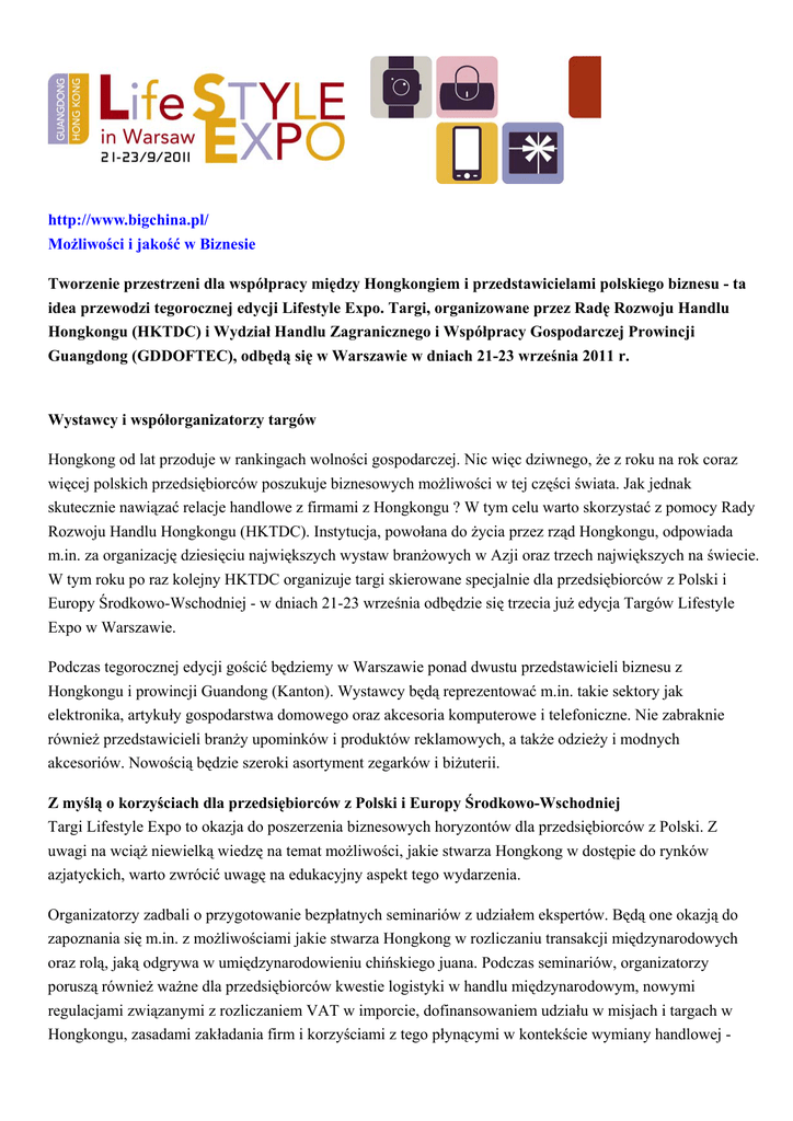 http://www.bigchina.pl/ Możliwości i jakość w Biznesie Tworzenie przestrzeni dla współpracy między Hongkongiem i przedstawicielami polskiego biznesu - ta idea przewodzi tegorocznej edycji Lifestyle Expo. Targi, organizowane przez Radę Rozwoju Handlu Hongkongu (HKTDC) i Wydział Handlu Zagranicznego i Współpracy Gospodarczej Prowincji Guangdong (GDDOFTEC), odbędą się w Warszawie w dniach 21-23 września 2011 r. Wystawcy i współorganizatorzy targów Hongkong od lat przoduje w rankingach wolności gospodarczej. Nic więc dziwnego, że z roku na rok coraz więcej polskich przedsiębiorców poszukuje biznesowych możliwości w tej części świata. Jak jednak skutecznie nawiązać relacje handlowe z firmami z Hongkongu ? W tym celu warto skorzystać z pomocy Rady Rozwoju Handlu Hongkongu (HKTDC). Instytucja, powołana do życia przez rząd Hongkongu, odpowiada m.in. za organizację dziesięciu największych wystaw branżowych w Azji oraz trzech największych na świecie. W tym roku po raz kolejny HKTDC organizuje targi skierowane specjalnie dla przedsiębiorców z Polski i Europy Środkowo-Wschodniej - w dniach 21-23 września odbędzie się trzecia już edycja Targów Lifestyle Expo w Warszawie. Podczas tegorocznej edycji gościć będziemy w Warszawie ponad dwustu przedstawicieli biznesu z Hongkongu i prowincji Guandong (Kanton). Wystawcy będą reprezentować m.in. takie sektory jak elektronika, artykuły gospodarstwa domowego oraz akcesoria komputerowe i telefoniczne. Nie zabraknie również przedstawicieli branży upominków i produktów reklamowych, a także odzieży i modnych akcesoriów. Nowością będzie szeroki asortyment zegarków i biżuterii. Z myślą o korzyściach dla przedsiębiorców z Polski i Europy Środkowo-Wschodniej Targi Lifestyle Expo to okazja do poszerzenia biznesowych horyzontów dla przedsiębiorców z Polski. Z uwagi na wciąż niewielką wiedzę na temat możliwości, jakie stwarza Hongkong w dostępie do rynków azjatyckich, warto zwrócić uwagę na edukacyjny aspekt tego wydarzenia. Organizatorzy zadbali o przygotowanie bezpłatnych seminariów z udziałem ekspertów. Będą one okazją do zapoznania się m.in. z możliwościami jakie stwarza Hongkong w rozliczaniu transakcji międzynarodowych oraz rolą, jaką odgrywa w umiędzynarodowieniu chińskiego juana. Podczas seminariów, organizatorzy poruszą również ważne dla przedsiębiorców kwestie logistyki w handlu międzynarodowym, nowymi regulacjami związanymi z rozliczaniem VAT w imporcie, dofinansowaniem udziału w misjach i targach w Hongkongu, zasadami zakładania firm i korzyściami z tego płynącymi w kontekście wymiany handlowej - zwłaszcza w przypadku chęci dostępu do ogromnego rynku chińskiego w zakresie zarówno importu jak i eksportu towarów. Istotnym celem organizatorów targów jest pokazanie Hongkongu, jako idealnego miejsca do nawiązywania kontaktów handlowych z Azją. Jako centrum offshorowe, Hongkong, który co prawda nie stosuje praktyk znanych z klasycznych rajów podatkowych, przyciąga przedsiębiorców korzystnymi warunkami inwestowania, przejrzystością przepisów oraz niezwykle wysokim poziomem wolności gospodarczej. Wiodącą pozycję w wielu rankingach gospodarczych Hongkong zawdzięcza m.in. ograniczonym do minimum formalnościom związanym z zakładaniem i prowadzeniem firmy (od niedawna można zarejestrować firmę przez Internet i już w tym samym dniu rozpocząć działalność) oraz niskim podatkom (CIT max 16,5%, podatek dochodowy max 15%). W tym specjalnym regionie administracyjnym obowiązuje również prosty i przejrzysty system podatkowy. Znakomita infrastruktura, dostęp do największych banków, powszechna znajomość angielskiego wśród ludzi biznesu, otwarta gospodarka i dobre relacje handlowe z Chinami, potwierdzone m.in. preferencyjnym dostępem do chińskiego rynku dzięki umowie o wolnym handlu - CEPA, zapewniają inwestorom zagranicznym maksimum korzyści podatkowych, wysoki poziom usług oraz elastyczną formułę prowadzenia działalności, przy zachowaniu minimum obowiązków administracyjnych. Bezpośrednie spotkania z producentami, eksporterami i przedsiębiorcami z Hongkongu Reprezentanci biznesu tego regionu wykazują dużą chęć współpracy z rynkami zewnętrznymi. W odpowiedzi na to Rada Rozwoju Handlu Hongkongu, z sukcesami organizowała wcześniejsze edycje targów Lifestyle Expo m.in. w Dubaju, Budapeszcie i Moskwie. Targi Lifestyle Expo są więc przede wszystkim okazją do bezpośrednich spotkań z przedsiębiorcami z Hongkongu i Kantonu. Daje to możliwość poznania nie tylko ich oferty, ale co równie istotne dla przyszłej współpracy, specyfiki kultury i stylu prowadzenia rozmów handlowych. W znacznej mierze ułatwia to nawiązanie długotrwałych relacji biznesowych i zwiększa szansę odniesienia sukcesu. Targi Lifestyle Expo, odbędą się w dniach 21-23 września 2011r. na terenie Warszawskiego Centrum EXPO XXI, przy ul. Prądzyńskiego 12/14. Zapraszamy wszystkich przedsiębiorców na stronę www.lifestyleexpowarsaw.pl , gdzie można znaleźć szczegółowe informacje oraz zarejestrować się w celu uzyskania bezpłatnej wejściówki. Formularz rejestracyjny HKTDC Założona w 1966 roku Rada Rozwoju Handlu Hongkongu (HKTDC) zajmuje się międzynarodową promocją producentów oraz firm handlowych i usługowych z Hongkongu. Poprzez sieć ponad 40 biur na całym świecie, w tym 11 w Chinach kontynentalnych HKTDC promuje Hongkong jako platformę współpracy handlowej z Chinami oraz innymi krajami azjatyckimi. Poprzez organizowane imprezy targowe, misje gospodarcze, internetową platformę handlową www.hktdc.com, pisma branżowe, HKTDC łączy miliony kupców i producentów z całego świata. Więcej informacji o HKTDC na stronie www.hktdc.com. GD/DOFTEC Wydział Handlu Zagranicznego i Współpracy Gospodarczej Prowincji Guangdong prowadzi politykę w zakresie handlu zagranicznego, współpracy gospodar