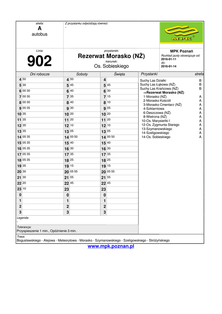 strefa: A Z przystanku odjeżdżają również: - autobus Linia: przystanek: 902 4 50 5 30 Dni robocze 6 00 30 7 00 30 8 00 30 9 00 35 10 35 11 35 12 35 13 35 14 05 35 15 05 35 16 05 35 17 05 35 18 05 35 19 35 20 30 21 30 22 20 23 10 0 1 2 3 Rezerwat Morasko (NŻ) kierunek: Os. Sobieskiego 4 5 6 7 8 9 10 11 12 13 14 15 16 17 18 19 20 21 22 23 0 1 2 3 50 Soboty 45 40 35 40 30 20 20 10 05 00 50 40 30 35 25 15 05 55 55 45 4 5 6 7 8 9 10 11 12 13 14 15 16 17 18 19 20 21 22 23 0 1 2 3 Święta 45 30 15 10 05 20 20 10 05 00 50 Przystanki Suchy Las Działki Suchy Las Łąkowa (NŻ) Suchy Las Krańcowa (NŻ) →Rezerwat Morasko (NŻ) 1-Morasko (NŻ) 2-Morasko Kościół 3-Morasko Cmentarz (NŻ) 4-Szklarniowa 6-Deszczowa (NŻ) 8-Wietrzna (NŻ) 10-Os. Marysieńki I 12-Os. Zygmunta Starego 13-Szymanowskiego 14-Szeligowskiego 14-Os. Sobieskiego 40 30 35 25 15 05 55 55 45 Legenda: - Tolerancja: Przyspieszenie 1 min., Opóźnienie 3 min. Trasa: Bogusławskiego - Alejowa - Meteorytowa - Morasko - Szymanowskiego - Szeligowskiego - Stróżyńskiego www.mpk.poznan.pl MPK Poznań Rozkład jazdy obowiązuje od: 2016-01-11 do: 2016-01-14 strefa B B B A A A A A A A A A A A