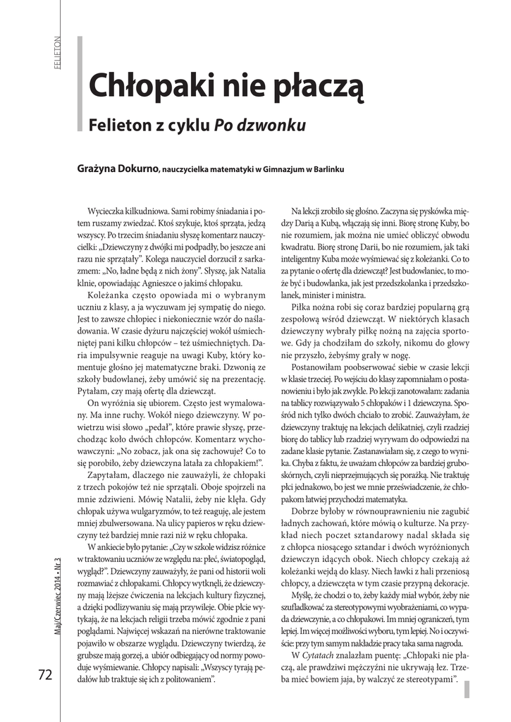 FELIETON Chłopaki nie płaczą Felieton z cyklu Po dzwonku Maj/Czerwiec 2014 • Nr 3 Grażyna Dokurno, nauczycielka matematyki w Gimnazjum w Barlinku 72 Wycieczka kilkudniowa. Sami robimy śniadania i potem ruszamy zwiedzać. Ktoś szykuje, ktoś sprząta, jedzą wszyscy. Po trzecim śniadaniu słyszę komentarz nauczycielki: „Dziewczyny z dwójki mi podpadły, bo jeszcze ani razu nie sprzątały”. Kolega nauczyciel dorzucił z sarkazmem: „No, ładne będą z nich żony”. Słyszę, jak Natalia klnie, opowiadając Agnieszce o jakimś chłopaku. Koleżanka często opowiada mi o wybranym uczniu z klasy, a ja wyczuwam jej sympatię do niego. Jest to zawsze chłopiec i niekoniecznie wzór do naśladowania. W czasie dyżuru najczęściej wokół uśmiechniętej pani kilku chłopców – też uśmiechniętych. Daria impulsywnie reaguje na uwagi Kuby, który komentuje głośno jej matematyczne braki. Dzwonią ze szkoły budowlanej, żeby umówić się na prezentację. Pytałam, czy mają ofertę dla dziewcząt. On wyróżnia się ubiorem. Często jest wymalowany. Ma inne ruchy. Wokół niego dziewczyny. W powietrzu wisi słowo „pedał”, które prawie słyszę, przechodząc koło dwóch chłopców. Komentarz wychowawczyni: „No zobacz, jak ona się zachowuje? Co to się porobiło, żeby dziewczyna latała za chłopakiem!”. Zapytałam, dlaczego nie zauważyli, że chłopaki z trzech pokojów też nie sprzątali. Oboje spojrzeli na mnie zdziwieni. Mówię Natalii, żeby nie klęła. Gdy chłopak używa wulgaryzmów, to też reaguję, ale jestem mniej zbulwersowana. Na ulicy papieros w ręku dziewczyny też bardziej mnie razi niż w ręku chłopaka. W ankiecie było pytanie: „Czy w szkole widzisz różnice w traktowaniu uczniów ze względu na: płeć, światopogląd, wygląd?”. Dziewczyny zauważyły, że pani od historii woli rozmawiać z chłopakami. Chłopcy wytknęli, że dziewczyny mają lżejsze ćwiczenia na lekcjach kultury fizycznej, a dzięki podlizywaniu się mają przywileje. Obie płcie wytykają, że na lekcjach religii trzeba mówić zgodnie z pani poglądami. Najwięcej wskazań na nierówne traktowanie pojawiło w obszarze wyglądu. Dziewczyny twierdzą, że grubsze mają gorzej, a ubiór odbiegający od normy powoduje wyśmiewanie. Chłopcy napisali: „Wszyscy tyrają pedałów lub traktuje się ich z politowaniem”. Na lekcji zrobiło się głośno. Zaczyna się pyskówka między Darią a Kubą, włączają się inni. Biorę stronę Kuby, bo nie rozumiem, jak można nie umieć obliczyć obwodu kwadratu. Biorę stronę Darii, bo nie rozumiem, jak taki inteligentny Kuba może wyśmiewać się z koleżanki. Co to za pytanie o ofertę dla dziewcząt? Jest budowlaniec, to może być i budowlanka, jak jest przedszkolanka i przedszkolanek, minister i ministra. Piłka nożna robi się coraz bardziej popularną grą zespołową wśród dziewcząt. W niektórych klasach dziewczyny wybrały piłkę nożną na zajęcia sportowe. Gdy ja chodziłam do szkoły, nikomu do głowy nie przyszło, żebyśmy grały w nogę. Postanowiłam poobserwować siebie w czasie lekcji w klasie trzeciej. Po wejściu do klasy zapomniałam o postanowieniu i było jak zwykle. Po lekcji zanotowałam: zadania na tablicy rozwiązywało 5 chłopaków i 1 dziewczyna. Spośród nich tylko dwóch chciało to zrobić. Zauważyłam, że dziewczyny traktuję na lekcjach delikatniej, czyli rzadziej biorę do tablicy lub rzadziej wyrywam do odpowiedzi na zadane klasie pytanie. Zastanawiałam się, z czego to wynika. Chyba z faktu, że uważam chłopców za bardziej gruboskórnych, czyli nieprzejmujących się porażką. Nie traktuję płci jednakowo, bo jest we mnie przeświadczenie, że chłopakom łatwiej przychodzi matematyka. Dobrze byłoby w równouprawnieniu nie zagubić ładnych zachowań, które mówią o kulturze. Na przykład niech poczet sztandarowy nadal składa się z chłopca niosącego sztandar i dwóch wyróżnionych dziewczyn idących obok. Niech chłopcy czekają aż koleżanki wejdą do klasy. Niech ławki z hali przeniosą chłopcy, a dziewczęta w tym czasie przypną dekoracje. Myślę, że chodzi o to, żeby każdy miał wybór, żeby nie szufladkować za stereotypowymi wyobrażeniami, co wypada dziewczynie, a co chłopakowi. Im mniej ograniczeń, tym lepiej. Im więcej możliwości wyboru, tym lepiej. No i oczywiście: przy tym samym nakładzie pracy taka sama nagroda. W Cytatach znalazłam puentę: „Chłopaki nie płaczą, ale prawdziwi mężczyźni nie ukrywają łez. Trzeba mieć bowiem jaja, by walczyć ze stereotypami”.