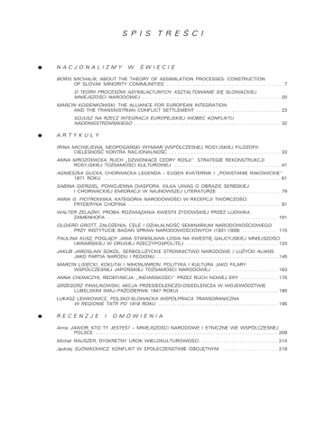 S p i s t r e ś c i • NACJONALIZMY W Ś W IECIE Boris Michalík, About the Theory of Assimilation Processes: Construction of Slovak Minority Communities . . . . . . . . . . . . . . . . . . . . . . . . . . . . . . . . . . . . . . . . . . . 7 O teorii procesów asymilacyjnych: kształtowanie się słowackiej mniejszości narodowej . . . . . . . . . . . . . . . . . . . . . . . . . . . . . . . . . . . . . . . . . . . . . . . . . . . . 20 Marcin Kosienkowski, The Alliance for European Integration and the Transnistrian conflict settlement . . . . . . . . . . . . . . . . . . . . . . . . . . . . . . . 23 • Sojusz na rzecz Integracji Europejskiej Wobec konfliktu naddniestrzańskiego . . . . . . . . . . . . . . . . . . . . . . . . . . . . . . . . . . . . . . . . . . . . . . . . . . . . . . 32 A RT Y KUŁ Y Irina Michiejewa, Neopogański wymiar współczesnej Rosyjskiej filozofii: cielesność kontra racjonalność . . . . . . . . . . . . . . . . . . . . . . . . . . . . . . . . . . . . . . . . . 33 Anna MrozowiCka, Ruch „Dzwoniące Cedry Rosji”. Strategie rekonstrukcji rosyjskiej tożsamości kulturowej . . . . . . . . . . . . . . . . . . . . . . . . . . . . . . . . . . . . . . . . 41 Agnieszka Gucka, Chorwacka legenda – Eugen Kvaternik i „powstanie rakowickie” 1871 roku . . . . . . . . . . . . . . . . . . . . . . . . . . . . . . . . . . . . . . . . . . . . . . . . . . . . . . . . . . . . . . . . . . 61 Sabina Giergiel, Powojenna diaspora. Kilka uwag o obrazie serbskiej i chorwackiej emigracji w najnowszej literaturze . . . . . . . . . . . . . . . . . . . . . . . 79 Anna G. Piotrowska, Kategoria narodowości w recepcji twórczości Fryderyka Chopina . . . . . . . . . . . . . . . . . . . . . . . . . . . . . . . . . . . . . . . . . . . . . . . . . . . . . . . . 91 Walter Żelazny, Próba rozwiązania kwestii żydowskiej przez Ludwika Zamenhofa . . . . . . . . . . . . . . . . . . . . . . . . . . . . . . . . . . . . . . . . . . . . . . . . . . . . . . . . . . . . . . . . 101 Olgierd Grott, Założenia, cele i działalność Seminarium Narodowościowego przy Instytucie Badań Spraw Narodowościowych (1931-1939) . . . . . . . . . . . . . 115 Paulina Kusz, Poglądy Jana Stanisława Łosia na kwestię galicyjskiej mniejszości ukraińskiej w Drugiej Rzeczypospolitej . . . . . . . . . . . . . . . . . . . . . . . . . . . . . . . . . . . 133 Jakub Jarosław Sokół, Serbołużyckie Stronnictwo Narodowe / Łużycki Alians jako partia narodu i regionu . . . . . . . . . . . . . . . . . . . . . . . . . . . . . . . . . . . . . . . . . . . . . . . 145 Marcin Lisiecki, Kokutai i nihonjinron. Polityka i kultura jako filary współczesnej japońskiej tożsamości narodowej . . . . . . . . . . . . . . . . . . . . . . . . 163 Anna Chomczyk, Redefinicja „indiańskości” przez ruch Nowej Ery . . . . . . . . . . . . . . . 175 Grzegorz Pawlikowski, Akcja przesiedleńczo-osiedleńcza w województwie lubelskim (maj–październik 1947 roku) . . . . . . . . . . . . . . . . . . . . . . . . . . . . . . . . . . . . . 185 Łukasz Lewkowicz, polsko-słowacka współpraca transgraniczna w regionie tatr po 1918 roku . . . . . . . . . . . . . . . . . . . . . . . . . . . . . . . . . . . . . . . . . . . . 195 • RECE N Z J E I O M Ó W IE N I A Anna Jawor, Kto ty jesteś? – mniejszości narodowe i etniczne we współczesnej Polsce . . . . . . . . . . . . . . . . . . . . . . . . . . . . . . . . . . . . . . . . . . . . . . . . . . . . . . . . . . . . . . . . . . . 209 Michał Rauszer, Dyskretny urok wielokulturowości . . . . . . . . . . . . . . . . . . . . . . . . . . . . 214 Jędrzej Sudnikowicz, Konflikt w społeczeństwie obojętnym . . . . . . . . . . . . . . . . . . . . . 219 C O N T E N T s • S PECIFIC N A TI O N A L I S M S Boris Michalík, About the Theory of Assimilation Processes: Construction of Slovak Minority Communities . . . . . . . . . . . . . . . . . . . . . . . . . . . . . . . . . . . . . . . . . . . 7 O teorii procesów asymilacyjnych: kształtowanie się słowackiej mniejszości narodowej . . . . . . . . . . . . . . . . . . . . . . . . . . . . . . . . . . . . . . . . . . . . . . . . . . . . 20 Marcin Kosienkowski, The Alliance for European Integration and the Transnistrian conflict settlement . . . . . . . . . . . . . . . . . . . . . . . . . . . . . . . 23 • Sojusz na rzecz Integracji Europejskiej Wobec konfliktu naddniestrzańskiego . . . . . . . . . . . . . . . . . . . . . . . . . . . . . . . . . . . . . . . . . . . . . . . . . . . . . . . 32 A RTIC L E S Irina Michiejewa, Neo-pagan Dimension of Modern Russian Philosophy: Corporality vs. Rationality . . . . . . . . . . . . . . . . . . . . . . . . . . . . . . . . . . . . . . . . . . . . . . . 33 Anna MrozowiCka, The Ringing Cedars of Russia movement. Reconstructions of Russian cultural identity . . . . . . . . . . . . . . . . . . . . . . . . . . . . 41 Agnieszka Gucka, a croatian legend: Eugen Kvaternik and The Rakovica Revolt of 1871 . . . . . . . . . . . . . . . . . . . . . . . . . . . . . . . . . . . . . . . . . . . . . . . . . . . . . . . . . . . . . 61 Sabina Giergiel, The Postwar Diaspora. Some remarks on the depiction of Serbian and Croatian emigrants in recent literature . . . . . . . . . . . . . . . . . 79 Anna G. Piotrowska, The category of nationality in the reception of Frederic Chopin’s music . . . . . . . . . . . . . . . . . . . . . . . . . . . . . . . . . . . . . . . . . . . . . . . . 91 Walter Żelazny, Ludwik Zamenhof’s attempt at solving the Jewish question . . 101 Olgierd Grott, Aims and goals of the Seminar for the Study of Nationalities in Warsaw, 1931-1939 . . . . . . . . . . . . . . . . . . . . . . . . . . . . . . . . . . . . . . . . . . . . . . . . . . . . . . 115 Paulina Kusz, Jan Stanisław Łoś’s Views on the Ukrainian Minority in the Second Polish Republic . . . . . . . . . . . . . . . . . . . . . . . . . . . . . . . . . . . . . . . . . . . . 133 Jakub Jarosław Sokół, Sorbian National Party / Lusatian Al