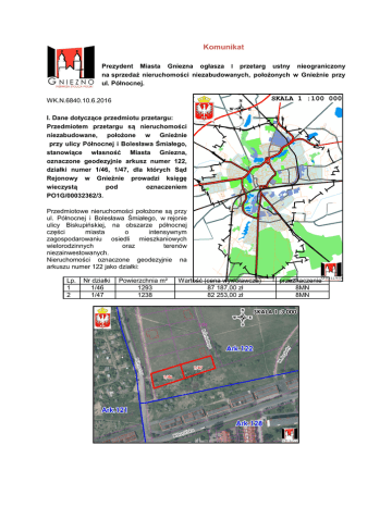 Komunikat Prezydent Miasta Gniezna ogłasza I przetarg ustny nieograniczony na sprzedaż nieruchomości niezabudowanych, położonych w Gnieźnie przy ul. Północnej. WK.N.6840.10.6.2016 I. Dane dotyczące przedmiotu przetargu: Przedmiotem przetargu są nieruchomości niezabudowane, położone w Gnieźnie przy ulicy Północnej i Bolesława Śmiałego, stanowiące własność Miasta Gniezna, oznaczone geodezyjnie arkusz numer 122, działki numer 1/46, 1/47, dla których Sąd Rejonowy w Gnieźnie prowadzi księgę wieczystą pod oznaczeniem PO1G/00032362/3. Przedmiotowe nieruchomości położone są przy ul. Północnej i Bolesława Śmiałego, w rejonie ulicy Biskupińskiej, na obszarze północnej części miasta o intensywnym zagospodarowaniu osiedli mieszkaniowych wielorodzinnych oraz terenów niezainwestowanych. Nieruchomości oznaczone geodezyjnie na arkuszu numer 122 jako działki: Lp. 1 2 Nr działki 1/46 1/47 Powierzchnia m² 1293 1238 Wartość (cena wywoławcza) 87 187,00 zł 82 253,00 zł przeznaczenie 8MN 8MN Działki są niezabudowane i niezagospodarowane. Dojazd do działki numer 1/46 następować będzie od strony ulicy Północnej, natomiast dojazd do działki numer 1/47 możliwy będzie od strony ulicy Bolesława Śmiałego. Na działkach będących przedmiotem przetargu znajduje się linia energetyczna średniego napięcia wraz z obszarem oddziaływania, co wymaga uregulowania prawnego w postaci służebności. W przypadku zaistnienia kolizji projektowanej zabudowy z istniejącymi urządzeniami zabudowę należy projektować po wcześniejszym uzgodnieniu z gestorem sieci. Działki są nieuzbrojone. W najbliższym sąsiedztwie znajduje się sieć elektryczna i wodociągowa. Infrastrukturę niezbędną do funkcjonowania planowanego obiektu nabywca wykona we własnym zakresie i na własny koszt na warunkach określonych przez dysponentów poszczególnych sieci. Przedmiotowe nieruchomości zlokalizowane są na obszarze objętym aktualnym miejscowym planem zagospodarowania przestrzennego, zatwierdzonym uchwałą Rady Miejskiej w Gnieźnie nr XLII/449/2005 z dnia 18.11.2005 r. w sprawie miejscowego planu zagospodarowania przestrzennego terenu zabudowy mieszkaniowej wielorodzinnej i usługowej Osiedla Winiary Północ w Gnieźnie. Zgodnie z ustaleniami m. p. z. p nieruchomości leżą na terenie przeznaczonym pod zabudowę mieszkaniową jednorodzinną – symbol planu „8 MN”. W dziale III księgi wieczystej (obciążenia i ograniczenia) i dziale IV (hipoteki) brak jest jakichkolwiek wpisów, na przedmiotowej nieruchomości nie ciążą żadne ograniczenia, służebności ani inne ograniczone prawa rzeczowe ustanowione na rzecz osób trzecich. II. Miejsce i termin przetargu: Przetarg odbędzie się w dniu 23 marca 2017 roku o godz. 10.00 w budynku Urzędu Miejskiego w Gnieźnie, ul. Lecha 6, parter, sala nr 9. III. Cena wywoławcza, wadium : Cena wywoławcza jest równa wartości działek. Do ceny sprzedaży doliczony będzie obowiązujący podatek VAT. Wysokość wadium stanowi 20% ceny wywoławczej i wynosi odpowiednio: 1/46 – 17 437,40 zł 1/47 – 16 450,60 zł Wadium należy wpłacić na rachunek bankowy Urzędu Miejskiego w Gnieźnie, nr: 07 9065 0006 0000 0000 6956 0009, w Banku Spółdzielczym w Gnieźnie z takim wyprzedzeniem, aby w dniu 20 marca 2017 roku środki znajdowały się na tym koncie. Na przelewie należy wpisać „Wadium - sprzedaż ul. Północna, działka nr …”. Wadium wniesione przez uczestnika, który przetarg wygrał, zalicza się na poczet ceny nabycia. Pozostałym uczestnikom zwraca się wadium na wskazany przez uczestnika rachunek bankowy nie później niż przed upływem 3 dni od dnia zamknięcia przetargu. Wadium ulega przepadkowi w razie uchylenia się uczestnika, który przetarg wygrał od zawarcia umowy notarialnej. IV. Warunki przetargu: W przetargu mogą brać udział osoby fizyczne i prawne, które: - w terminie wpłacą wadium w pieniądzu w podanej wyżej wysokości; -przedłożą komisji przetargowej przed otwarciem przetargu: dowód wniesienia wadium, w przypadku osób fizycznych dowód tożsamości, w przypadku osób prawnych i jednostek organizacyjnych nie posiadających osobowości prawnej, a podlegających wpisowi do rejestrów aktualny wpis z właściwego rejestru sądowego, właściwych pełnomocnictw, dowodów tożsamości osób reprezentujących podmiot; -oświadczą, że dokonały wizji lokalnej w terenie oraz zdobyły konieczne informacje o przedmiocie przetargu. Szczegółowych informacji można zasięgnąć w Urzędzie Miejskim w Gnieźnie, Wydział Mienia Komunalnego, Referat Nieruchomości, pok.17, tel. 61 426 04 91.