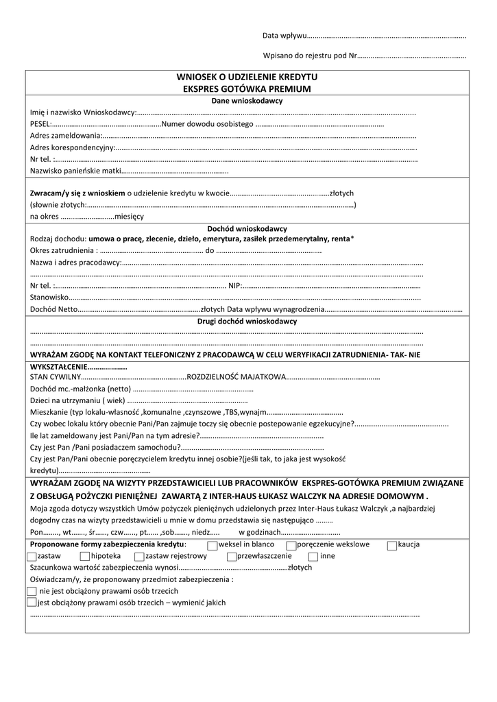 Data wpływu….……………………………………………………………………. Wpisano do rejestru pod Nr………………………………………………… WNIOSEK O UDZIELENIE KREDYTU EKSPRES GOTÓWKA PREMIUM Dane wnioskodawcy Imię i nazwisko Wnioskodawcy:…………………………………………………………………………………………………………………............... PESEL:…………………………………………………Numer dowodu osobistego …………………………………………………………. Adres zameldowania:…………………………………………………………………………………………………………………………………............... Adres korespondencyjny:…………………………………………………………………………………………………………………………………………. Nr tel. :……………………………………………………………………………………………………………………………………………………………………… Nazwisko panieńskie matki……………………………………………….. Zwracam/y się z wnioskiem o udzielenie kredytu w kwocie………………………………….…………złotych (słownie złotych:………………………………………………………………………………………………………………….………) na okres ……………………….miesięcy Dochód wnioskodawcy Rodzaj dochodu: umowa o pracę, zlecenie, dzieło, emerytura, zasiłek przedemerytalny, renta* Okres zatrudnienia : ……………………………………………… do ………………………………………………. Nazwa i adres pracodawcy:…………………………………………………………………………………………………………………………………………. ……………………………………………………………………………………………………………………………………………………………………………………. Nr tel. :…………………………………………………………………………….. NIP:………………………………………………………………………………… Stanowisko……………………………………………………………………………………………………………………………………………………………...... Dochód Netto…………………………………………………….…złotych Data wpływu wynagrodzenia……………………………………………………………… Drugi dochód wnioskodawcy ……………………………………………………………………………………………………………………………………………………………………………………. ……………………………………………………………………………………………………………………………………………………………………………………. WYRAŻAM ZGODĘ NA KONTAKT TELEFONICZNY Z PRACODAWCĄ W CELU WERYFIKACJI ZATRUDNIENIA- TAK- NIE WYKSZTAŁCENIE……………….. STAN CYWILNY……………………………………………….ROZDZIELNOŚĆ MAJATKOWA…………………………………………. Dochód mc.-małżonka (netto) ……………………………………………………… Dzieci na utrzymaniu ( wiek) ……………………………………………………… Mieszkanie (typ lokalu-własność ,komunalne ,czynszowe ,TBS,wynajm…………………………………. Czy wobec lokalu który obecnie Pani/Pan zajmuje toczy się obecnie postepowanie egzekucyjne?............................................. Ile lat zameldowany jest Pani/Pan na tym adresie?........................................................... Czy jest Pan /Pani posiadaczem samochodu?.................................................................... Czy jest Pan/Pani obecnie poręczycielem kredytu innej osobie?(jeśli tak, to jaka jest wysokość kredytu)………………………………………… WYRAŻAM ZGODĘ NA WIZYTY PRZEDSTAWICIELI LUB PRACOWNIKÓW EKSPRES-GOTÓWKA PREMIUM ZWIĄZANE Z OBSŁUGĄ POŻYCZKI PIENIĘŻNEJ ZAWARTĄ Z INTER-HAUS ŁUKASZ WALCZYK NA ADRESIE DOMOWYM . Moja zgoda dotyczy wszystkich Umów pożyczek pieniężnych udzielonych przez Inter-Haus Łukasz Walczyk ,a najbardziej dogodny czas na wizyty przedstawicieli u mnie w domu przedstawia się następująco ……… Pon…….., wt……., śr……, czw…..., pt…… ,sob……., niedz….. w godzinach…………………………. Proponowane formy zabezpieczenia kredytu: weksel in blanco poręczenie wekslowe kaucja zastaw hipoteka zastaw rejestrowy przewłaszczenie inne Szacunkowa wartość zabezpieczenia wynosi…………………………………………………złotych Oświadczam/y, że proponowany przedmiot zabezpieczenia : nie jest obciążony prawami osób trzecich jest obciążony prawami osób trzecich – wymienić jakich ………………………………………………………………………………………………………………………………………………………………………………….. Oświadczam/Oświadczamy*, że: 1) została mi/nam* przedstawiona przez Ekspres-Gotówka informacja o kosztach obsługi kredytu : Warunki kredytowania Wzroście oprocentowania , Wzroście stopy procentowej, od której zależy jego oprocentowanie w skali odpowiadającej różnicy między maksymalnym i minimalnym poziomem stopy procentowej w ciągu ostatnich 12 miesięcy. Opłacie przygotowawczej w wysokości 5% płaconej przy pierwszej racie kredytu 2) przeciwko mnie / nam * było / nie było* w okresie ostatnich 4 lat prowadzone postępowanie sądowe lub postępo