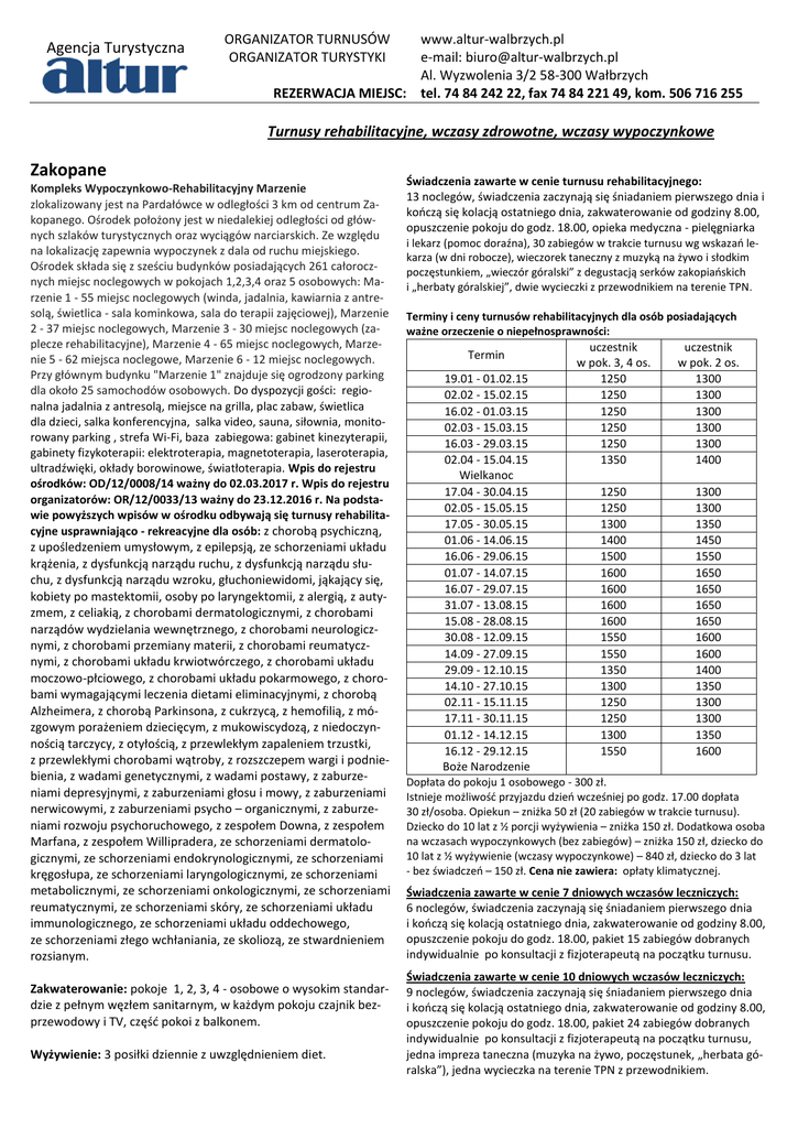 Agencja Turystyczna ORGANIZATOR TURNUSÓW ORGANIZATOR TURYSTYKI www.altur-walbrzych.pl e-mail: [email protected] Al. Wyzwolenia 3/2 58-300 Wałbrzych REZERWACJA MIEJSC: tel. 74 84 242 22, fax 74 84 221 49, kom. 506 716 255 Turnusy rehabilitacyjne, wczasy zdrowotne, wczasy wypoczynkowe Zakopane Kompleks Wypoczynkowo-Rehabilitacyjny Marzenie zlokalizowany jest na Pardałówce w odległości 3 km od centrum Zakopanego. Ośrodek położony jest w niedalekiej odległości od głównych szlaków turystycznych oraz wyciągów narciarskich. Ze względu na lokalizację zapewnia wypoczynek z dala od ruchu miejskiego. Ośrodek składa się z sześciu budynków posiadających 261 całorocznych miejsc noclegowych w pokojach 1,2,3,4 oraz 5 osobowych: Marzenie 1 - 55 miejsc noclegowych (winda, jadalnia, kawiarnia z antresolą, świetlica - sala kominkowa, sala do terapii zajęciowej), Marzenie 2 - 37 miejsc noclegowych, Marzenie 3 - 30 miejsc noclegowych (zaplecze rehabilitacyjne), Marzenie 4 - 65 miejsc noclegowych, Marzenie 5 - 62 miejsca noclegowe, Marzenie 6 - 12 miejsc noclegowych. Przy głównym budynku "Marzenie 1" znajduje się ogrodzony parking dla około 25 samochodów osobowych. Do dyspozycji gości: regionalna jadalnia z antresolą, miejsce na grilla, plac zabaw, świetlica dla dzieci, salka konferencyjna, salka video, sauna, siłownia, monitorowany parking , strefa Wi-Fi, baza zabiegowa: gabinet kinezyterapii, gabinety fizykoterapii: elektroterapia, magnetoterapia, laseroterapia, ultradźwięki, okłady borowinowe, światłoterapia. Wpis do rejestru ośrodków: OD/12/0008/14 ważny do 02.03.2017 r. Wpis do rejestru organizatorów: OR/12/0033/13 ważny do 23.12.2016 r. Na podstawie powyższych wpisów w ośrodku odbywają się turnusy rehabilitacyjne usprawniająco - rekreacyjne dla osób: z chorobą psychiczną, z upośledzeniem umysłowym, z epilepsją, ze schorzeniami układu krążenia, z dysfunkcją narządu ruchu, z dysfunkcją narządu słuchu, z dysfunkcją narządu wzroku, głuchoniewidomi, jąkający się, kobiety po mastektomii, osoby po laryngektomii, z alergią, z autyzmem, z celiakią, z chorobami dermatologicznymi, z chorobami narządów wydzielania wewnętrznego, z chorobami neurologicznymi, z chorobami przemiany materii, z chorobami reumatycznymi, z chorobami układu krwiotwórczego, z chorobami układu moczowo-płciowego, z chorobami układu pokarmowego, z chorobami wymagającymi leczenia dietami eliminacyjnymi, z chorobą Alzheimera, z chorobą Parkinsona, z cukrzycą, z hemofilią, z mózgowym porażeniem dziecięcym, z mukowiscydozą, z niedoczynnością tarczycy, z otyłością, z przewlekłym zapaleniem trzustki, z przewlekłymi chorobami wątroby, z rozszczepem wargi i podniebienia, z wadami genetycznymi, z wadami postawy, z zaburzeniami depresyjnymi, z zaburzeniami głosu i mowy, z zaburzeniami nerwicowymi, z zaburzeniami psycho – organicznymi, z zaburzeniami rozwoju psychoruchowego, z zespołem Downa, z zespołem Marfana, z zespołem Willipradera, ze schorzeniami dermatologicznymi, ze schorzeniami endokrynologicznymi, ze schorzeniami kręgosłupa, ze schorzeniami laryngologicznymi, ze schorzeniami metabolicznymi, ze schorzeniami onkologicznymi, ze schorzeniami reumatycznymi, ze schorzeniami skóry, ze schorzeniami układu immunologicznego, ze schorzeniami układu oddechowego, ze schorzeniami złego wchłaniania, ze skoliozą, ze stwardnieniem rozsianym. Zakwaterowanie: pokoje 1, 2, 3, 4 - osobowe o wysokim standardzie z pełnym węzłem sanitarnym, w każdym pokoju czajnik bezprzewodowy i TV, część pokoi z balkonem. Wyżywienie: 3 posiłki dziennie z uwzględnieniem diet. Świadczenia zawarte w cenie turnusu rehabilitacyjnego: 13 noclegów, świadczenia zaczynają się śniadaniem pierwszego dnia i kończą się kolacją ostatniego dnia, zakwaterowanie od godziny 8.00, opuszczenie pokoju do godz. 18.00, opieka medyczna - pielęgniarka i lekarz (pomoc doraźna), 30 zabiegów w trakcie turnusu wg wskazań lekarza (w dni robocze), wieczorek taneczny z muzyką na żywo i słodkim poczęstunkiem, „wieczór góralski” z degustacją serków zakopiańskich i „herbaty góralskiej”, dwie wycieczki z przewodnikiem na terenie TPN. Terminy i ceny turnusów rehabilitacyjnych dla osób posiadających ważne orzeczenie o niepełnosprawności: Termin 19.01 - 01.02.15 02.02 - 15.02.15 16.02 - 01.03.15 02.03 - 15.03.15 16.03 - 29.03.15 02.04 - 15.04.15 Wielkanoc 17.04 - 30.04.15 02.05 - 15.05.15 17.05 - 30.05.15 01.06 - 14.06.15 16.06 - 29.06.15 01.07 - 14.07.15 16.07 - 29.07.15 31.07 - 13.08.15 15.08 - 28.08.15 30.08 - 12.09.15 14.09 - 27.09.15 29.09 - 12.10.15 14.10 - 27.10.15 02.11 - 15.11.15 17.11 - 30.11.15 01.12 - 14.12.15 16.12 - 29.12.15 Boże Narodzenie uczestnik w pok. 3, 4 os. 1250 1250 1250 1250 1250 1350 uczestnik w pok. 2 os. 1300 1300 1300 1300 1300 1400 1250 1250 1300 1400 1500 1600 1600 1600 1600 1550 1550 1350 1300 1250 1250 1300 1550 1300 1300 1350 1450 1550 1650 1650 1650 1650 1600 1600 1400 1350 1300 1300 1350 1600 Dopłata do pokoju 1 osobowego - 300 zł. Istnieje możliwość przyjazdu dzień wcześniej po godz. 17.00 dopłata 30 zł/osoba. Opiekun – zniżka 50 zł (20 zabiegów w trakcie turnusu). Dziecko do 10 lat z ½ porcji wyżywienia – zniżka 150 zł. Dodatkowa osoba na wczasach wypoczynkowych (bez zabiegów) – zniżka 150 zł, dziecko do 10 lat z ½ wyżywienie (wczasy wypoczynkowe) – 840 zł, dziecko do 3 lat - bez świadczeń – 150 zł. Cena nie zawiera: opłaty klimatycznej. Świadczenia zawarte w cenie 7 dniowych wczasów leczniczych: 6 noclegów, świadczenia zaczynają się śniadaniem pierwszego dnia i kończą się kolacją ostatniego dnia, zakwaterowanie od godziny 8.00, opuszczenie pokoju do godz. 18.00, pakiet 15 zabiegów dobranych indywidualnie po konsultacji z fizjoterapeutą na początku turnusu. Świadczenia zawarte w cenie 10 dniowych wczasów leczniczych: 9 noclegów, świadczenia zaczynają się śniadaniem pier