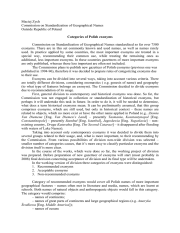 Maciej Zych Commission on Standardization of Geographical Names Outside Republic of Poland Categories of Polish exonyms Commission on Standardization of Geographical Names standardized so far over 7500 exonyms. There are in this set commonly known and used names, as well as names rarely used. In practice applied by some countries, the most important exonyms are treated in a special way, recommending their common use, while treating the remaining ones as additional, less important exonyms. In these countries gazetteers of more important exonyms are only published, whereas those less important are often not included. The Commission plans to publish new gazetteer of Polish exonyms (previous one was published in 1994-96), therefore it was decided to prepare rules of categorizing exonyms due to their use. Exonyms can be divided into several ways, taking into account various criteria. There are totally different divisions, considering onomastics ( e.g. genesis of name) and geography (to what type of features belongs an exonym). The Commission decided to divide exonyms due to recommendation of its usage. First, general division to contemporary and historical exonyms was done. So far, the Commission was not engaged in collection or standardization of historical exonyms, but perhaps it will undertake this task in future. In order to do it, it will be needed to determine, what does a term historical exonyms mean. It can be preliminarily assumed, that this group comprises exonyms, which are still used, but only in historical context – these names are related to objects, which no more exist or have the other name applied in Poland (e.g.. Ziemia Van Diemena [Eng. Van Diemen’s Land] – presently Tasmania, Konstantynopol [Eng. Constantinopole] – presently Stambuł [Eng. Istanbul], Jugosławia [Eng. Yugoslavia] – nonexisting country, Druga Katarakta [Eng. The Second Cataract] – it disappeared after flooding with waters of Lake Nasser). Taking into account only contemporary exonyms it was decided to divide them into several groups related to their usage, and, what is more important, to their recommending by the Commission. From various possibilities of division non-wide division was selected – smaller number of categories causes, that it’s more easy to classify particular exonyms and the division itself is more clear. In the course of the works, which were done so far, the working project of division was prepared. Before preparation of new gazetteer of exonyms will start (most probably in 2008) final decision concerning acceptance of division and its final type will be undertaken. In the working version of division three categories of exonyms were distinguished: 1. Recommended exonyms 2. Acceptable exonyms 3. Non-recommended exonyms Category of recommended exonyms would cover all Polish names of more important geographical features – names often met in literature and media, names, which are learnt at schools. Both names of natural objects and anthropogenic objects would fall in this category. The category would comprise: – names of continents; – names of great parts of continents and large geographical regions (e.g. Ameryka Środkowa [Eng. Middle America]); – names of oceans – names of seas – names of the most important gulfs and straits (e.g.. Zatoka Perska [Eng. Persian Gulf], Zatoka Meksykańska [Eng. Gulf of Mexico], Zatoka Genueńska [Eng. Gulf of Genoa], Cieśnina Gibraltarska [Eng. Strait of Gibraltar], Cieśnina Jukatańska [Eng. Yucatan Channel]); – names of the main geographical regions (e.g. Melanezja [Eng. Melanesia], Sahel, Zakaukazie [Eng. Transcaucasia]); – names of major physiographic regions (e.g. Andy [Eng. Andes], Sahara, Nizina Zachodniosyberyjska [Eng. West Siberian Plain], Apeniny [Eng. Apennine Mountains], Wyżyna Abisyńska [Eng. Ethiopian Highlands], Nizina Nadkaspijska [Eng. Caspian Depression]); – names of the main rivers, lakes and channels (e.g. Amazonka [Eng. Amazon River], Sekwana [Eng. Seine], Jezioro Wiktorii [Eng. Lake Victoria], Jezioro Bodeńskie [Eng. Lake Constance], Kanał Panamski [Eng. Panama Canal]); – names of major islands, archipelagos and peninsulas (e.g. Grenlandia [Eng. Greenland], Wyspa Świętej Heleny [Eng. Saint Helena Island], Archipelag Malajski [Eng. Malay Archipelago], Kuryle [Eng. Kuril Islands], Półwysep Indyjski [Eng. Indian Peninsula], Peloponez [Eng. Peloponnese]); – names of the most important mountains, passes and capes (e.g. Mount Everest, Kilimandżaro [Eng. Kilimanjaro], Wielka Przełęcz Świętego Bernarda [Eng. Great Saint Bernard Pass], Przylądek Północny [Eng. North Cape], Przylądek Dobrej Nadziei [Eng. Cape of Good Hope]); – names of all states and dependent territories; – names of major cities (e.g. Meksyk [Eng. Mexico City], Kajenna [Eng. Cayenne], Nowy Jork [Eng. New York]); – names of the most known administrative units (e.g. Katalonia [Eng. Catalonia], Bawaria [Eng. Bavaria], Nowa Południowa Walia [Eng. New South Wales]); – names of the most important undersea features (e.g. Rów Mariański [Eng. Mariana Trench], Grzbiet Północnoatlantycki [Eng. North Atlantic Ridge]); – names of the main sea currents (e.g. Prąd Zatokowy [Eng. Gulf Stream], Kuro Siwo [Eng. Japan Current]); – names of the most known other objects, including monuments and constructions (e.g. Wodospad Wiktorii [Eng. Victoria Falls], Wielka Rafa Koralowa [Eng. Great Barrier Reef], Wielki Mur Chiński [Eng. Great Wall of China], Wieża Eiffla [Eng. Eiffel Tower], Piramida Cheopsa [Eng. Pyramid of Cheops]). In this category for instance any nature reserves, transportation network, economic regions, parts of localities, bays on lakes, islands and peninsulas on rivers and lakes, caves and variant names were not considered. The category would comprise ca. 25% of all Polish exonyms, i.e. about 2000 names. The Commission would recommend common use of exonyms from this category, in particular in popular and popular-