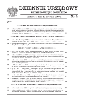 DZIENNIK URZÊDOWY WY¯SZEGO URZÊDU GÓRNICZEGO Nr 4 Katowice, dnia 29 kwietnia 2009 r. TREŚĆ: Poz.: ZARZĄDZENIE PREZESA WYŻSZEGO URZĘDU GÓRNICZEGO 24 — nr 7 z dnia 10 kwietnia 2009 r. zmieniające zarządzenie w sprawie powołania Komisji do spraw opiniowania stanu zagrożenia wodnego i zawałowego oraz podjęcia niezbędnych działań profilaktycznych dla zapewnienia bezpiecznego funkcjonowania Kopalni Soli „Wieliczka” S.A. w Wieliczce. . . . . . . . . . . . . . . . . . . . . . . . . . . . . . . . . . . . . . . . . 52 ZARZĄDZENIA DYREKTORA GENERALNEGO WYŻSZEGO URZĘDU GÓRNICZEGO: 25 — nr 1 z dnia 24 lutego 2009 r. w sprawie wdrażania w Wyższym Urzędzie Górniczym Wspólnej Metody Oceny (CAF) 2006 . . . . . . . . . . . . . . . . . . . . . . . . . . . . . . . . . . . 53 26 — nr 2 z dnia 27 marca 2009 r. w sprawie wprowadzenia w Wyższym Urzędzie Górniczym „Regulaminu porządkowego”. . . . . . . . . . . . . . . . . . . . . . . . . . . . . . . . . . . . . . . . . 54 DECYZJE PREZESA WYŻSZEGO URZĘDU GÓRNICZEGO: 27 — nr 7 z dnia 26 lutego 2009 r. w sprawie odwołania ze składu Komisji do spraw Tąpań, Obudowy i Kierowania Stropem w Podziemnych Zakładach Górniczych. . . . . . . . . . . . 54 28 — nr 8 z dnia 26 lutego 2009 r. zmieniająca decyzję w sprawie powołania Komisji egzaminacyjnej dla stwierdzenia kwalifikacji osób kierownictwa oraz specjalistów wykonujących czynności w zakresie ratownictwa górniczego . . . . . . . . . . . . . . . . . . . . . . . . . . . . . 55 29 — nr 9 z dnia 5 marca 2009 r. w sprawie powołania Zespołu do opracowania założeń do projektów aktów wewnętrznych dotyczących kontroli przeprowadzanych przez pracowników urzędów górniczych. . . . . . . . . . . . . . . . . . . . . . . . . . . . . . . . . . . . . . . . . . . 55 30 — nr 10 z dnia 16 marca 2009 r. w sprawie powołania Zespołu do opracowywania założeń do budżetu zadaniowego Wyższego Urzędu Górniczego. . . . . . . . . . . . . . . . . . . . . . . 56 31 — nr 11 z dnia 17 marca 2009 r. zmieniająca decyzję w sprawie powołania Komisji dla zbadania przyczyn i okoliczności zapalenia i wybuchu metanu oraz wypadku zbiorowego, zaistniałych w dniu 4 czerwca 2008 r. w Jastrzębskiej Spółce Węglowej S.A., Kopalni Węgla Kamiennego „Borynia” w Jastrzębiu Zdroju . . . . . . . . . . . . . . . . . . . . . . . . . . 57 32 — nr 12 z dnia 20 marca 2009 r. w sprawie powołania Zespołu do spraw wdrożenia w urzędach górniczych przepisów ustawy o służbie cywilnej . . . . . . . . . . . . . . . . . . . 57 33 — nr 13 z dnia 1 kwietnia 2009 r. w sprawie zniesienia Zespołu do spraw zwalczania zagrożenia pyłami szkodliwymi dla zdrowia oraz wybuchem pyłu węglowego w podziemnych zakładach górniczych wydobywających węgiel kamienny. . . . . . . . . . . . . . . . . . . . . . 58 DECYZJE DYREKTORA GENERALNEGO WYŻSZEGO URZĘDU GÓRNICZEGO: 34 — nr 1 z dnia 2 marca 2009 r. w sprawie ustalenia składu Zespołu do spraw samooceny. . . 59 35 — nr 2 z dnia 20 kwietnia 2009 r. zmieniająca decyzję w sprawie utworzenia Zespołu wartościującego stanowiska pracy w służbie cywilnej w Wyższym Urzędzie Górniczym . . . 59 Dziennik Urzędowy Nr 4 Wyższego Urzędu Górniczego Poz. 24 52 24 ZARZĄDZENIE Nr 7 PREZESA WYŻSZEGO URZĘDU GÓRNICZEGO z dnia 10 kwietnia 2009 r. zmieniające zarządzenie w sprawie powołania Komisji do spraw opiniowania stanu zagrożenia wodnego i zawałowego oraz podjęcia niezbędnych działań profilaktycznych dla zapewnienia bezpiecznego funkcjonowania Kopalni Soli „Wieliczka” S.A. w Wieliczce Na podstawie art. 107 ust. 8 pkt 3 ustawy z dnia 4 lutego 1994 r. — Prawo geologiczne i górnicze (Dz. U. z 2005 r. Nr 228, poz. 1947, z późn. zm.1)) zarządza się, co następuje: § 1. W zarządzeniu nr 22 Prezesa Wyższego Urzędu Górniczego z dnia 23 grudnia 2008 r. w sprawie powołania Komisji do spraw opiniowania stanu zagrożenia wodnego i zawałowego oraz podjęcia niezbędnych działań profilaktycznych dla zapewnienia bezpiecznego funkcjonowania Kopalni Soli „Wieliczka” S.A. w Wieliczce (Dz. Urz. WUG z 2009 r. Nr 1, poz. 1)2) w § 2 pkt 4 otrzymuje brzmienie: „4)Członkowie: —dr Przemysław Bukowski Główny Instytut Górnictwa w Katowicach, —dr hab. inż. Marek Cała Akademia Górniczo-Hutnicza im. Stanisława Staszica w Krakowie, —dr inż. Mariusz Czop Akademia Górniczo-Hutnicza im. Stanisława Staszica w Krakowie, —doc. dr hab. inż. Jan Drzewiecki Główny Instytut Górnictwa w Katowicach, —dr inż. Antoni Łopata Akademia Górniczo-Hutnicza im. Stanisława Staszica w Krakowie, —prof. dr hab. inż. Jacek Motyka Akademia Górniczo-Hutnicza im. Stanisława Staszica w Krakowie, —prof. dr hab. inż. Marek Rogoż Główny Instytut Górnictwa w Katowicach, —mgr inż. Andrzej Stępień Wyższy Urząd Górniczy w Katowicach, —prof. dr hab. inż. Andrzej Szczepański Akademia Górniczo-Hutnicza im. Stanisława Staszica w Krakowie, —dr inż. Krzysztof Tajduś Instytut Mechaniki Górotworu Polskiej Akademii Nauk w Krakowie, —dr inż. Mirosław Wierzbicki Instytut Mechaniki Górotworu Polskiej Akademii Nauk w Krakowie, —dr hab. inż. Stanisław Duży Politechnika Śląska w Gliwicach, —prof. dr hab. inż. Stanisław Witczak Akademia Górniczo-Hutnicza im. Stanisława Staszica w Krakowie, —mgr inż. Wojciech Jeziorowski Okręgowy Urząd Górniczy w Krakowie, —inż. Dariusz Wojciechowski Kopalnia Soli „Wieliczka” S.A. w Wieliczce.”. Zmiany tekstu jednolitego wymienionej ustawy zostały ogłoszone w Dz. U. z 2006 r. Nr 133, poz. 934, Nr 170, poz. 1217, Nr 190, poz. 1399 i Nr 249, poz. 1834, z 2007 r. Nr 21, poz. 125 i Nr 82, poz. 556, z 2008 r. Nr 138, poz. 865, Nr 154, poz. 958, Nr 199, poz. 1227 i Nr 227, poz. 1505 oraz z 2009 r. Nr 18, poz. 97. 2) Pierwsza zmiana składu została dokonana zarządzeniem nr 5 Prezesa Wyższego Urzędu Górniczego z dnia 6 lutego 2009 r. w sprawie 