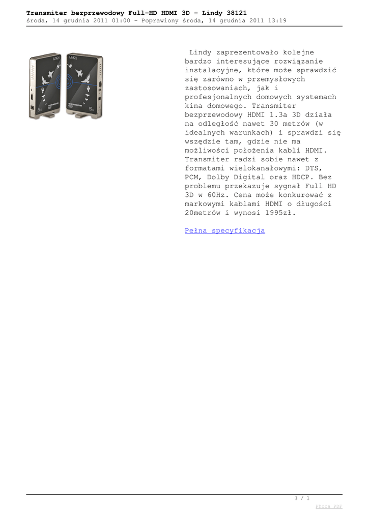 Transmiter bezprzewodowy Full-HD HDMI 3D - Lindy 38121 środa, 14 grudnia 2011 01:00 - Poprawiony środa, 14 grudnia 2011 13:19 Lindy zaprezentowało kolejne bardzo interesujące rozwiązanie instalacyjne, które może sprawdzić się zarówno w przemysłowych zastosowaniach, jak i profesjonalnych domowych systemach kina domowego. Transmiter bezprzewodowy HDMI 1.3a 3D działa na odległość nawet 30 metrów (w idealnych warunkach) i sprawdzi się wszędzie tam, gdzie nie ma możliwości położenia kabli HDMI. Transmiter radzi sobie nawet z formatami wielokanałowymi: DTS, PCM, Dolby Digital oraz HDCP. Bez problemu przekazuje sygnał Full HD 3D w 60Hz. Cena może konkurować z markowymi kablami HDMI o długości 20metrów i wynosi 1995zł. Pełna specyfikacja 1 / 1 Phoca PDF