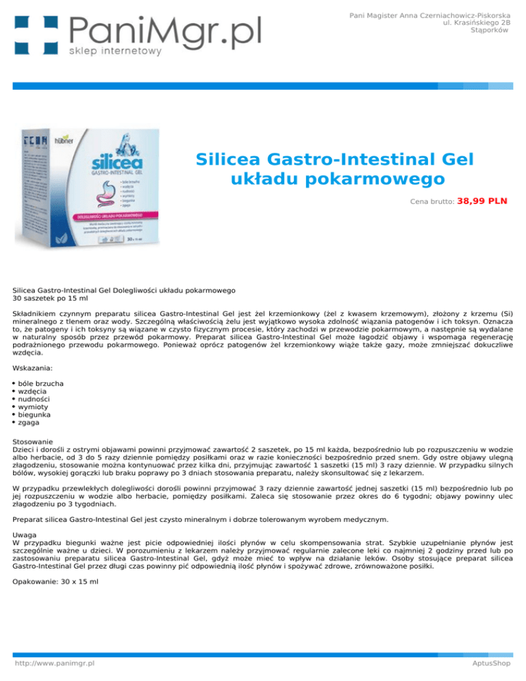 Pani Magister Anna Czerniachowicz-Piskorska ul. Krasińskiego 2B Stąporków Silicea Gastro-Intestinal Gel układu pokarmowego Cena brutto: 38,99 PLN Silicea Gastro-Intestinal Gel Dolegliwości układu pokarmowego 30 saszetek po 15 ml Składnikiem czynnym preparatu silicea Gastro-Intestinal Gel jest żel krzemionkowy (żel z kwasem krzemowym), złożony z krzemu (Si) mineralnego z tlenem oraz wody. Szczególną właściwością żelu jest wyjątkowo wysoka zdolność wiązania patogenów i ich toksyn. Oznacza to, że patogeny i ich toksyny są wiązane w czysto fizycznym procesie, który zachodzi w przewodzie pokarmowym, a następnie są wydalane w naturalny sposób przez przewód pokarmowy. Preparat silicea Gastro-Intestinal Gel może łagodzić objawy i wspomaga regenerację podrażnionego przewodu pokarmowego. Ponieważ oprócz patogenów żel krzemionkowy wiąże także gazy, może zmniejszać dokuczliwe wzdęcia. Wskazania: bóle brzucha wzdęcia nudności wymioty biegunka zgaga Stosowanie Dzieci i dorośli z ostrymi objawami powinni przyjmować zawartość 2 saszetek, po 15 ml każda, bezpośrednio lub po rozpuszczeniu w wodzie albo herbacie, od 3 do 5 razy dziennie pomiędzy posiłkami oraz w razie konieczności bezpośrednio przed snem. Gdy ostre objawy ulegną złagodzeniu, stosowanie można kontynuować przez kilka dni, przyjmując zawartość 1 saszetki (15 ml) 3 razy dziennie. W przypadku silnych bólów, wysokiej gorączki lub braku poprawy po 3 dniach stosowania preparatu, należy skonsultować się z lekarzem. W przypadku przewlekłych dolegliwości dorośli powinni przyjmować 3 razy dziennie zawartość jednej saszetki (15 ml) bezpośrednio lub po jej rozpuszczeniu w wodzie albo herbacie, pomiędzy posiłkami. Zaleca się stosowanie przez okres do 6 tygodni; objawy powinny ulec złagodzeniu po 3 tygodniach. Preparat silicea Gastro-Intestinal Gel jest czysto mineralnym i dobrze tolerowanym wyrobem medycznym. Uwaga W przypadku biegunki ważne jest picie odpowiedniej ilości płynów w celu skompensowania strat. Szybkie uzupełnianie płynów jest szczególnie ważne u dzieci. W porozumieniu z lekarzem należy przyjmować regularnie zalecone leki co najmniej 2 godziny przed lub po zastosowaniu preparatu silicea Gastro-Intestinal Gel, gdyż może mieć to wpływ na działanie leków. Osoby stosujące preparat silicea Gastro-Intestinal Gel przez długi czas powinny pić odpowiednią ilość płynów i spożywać zdrowe, zrównoważone posiłki. Opakowanie: 30 x 15 ml http://www.panimgr.pl AptusShop