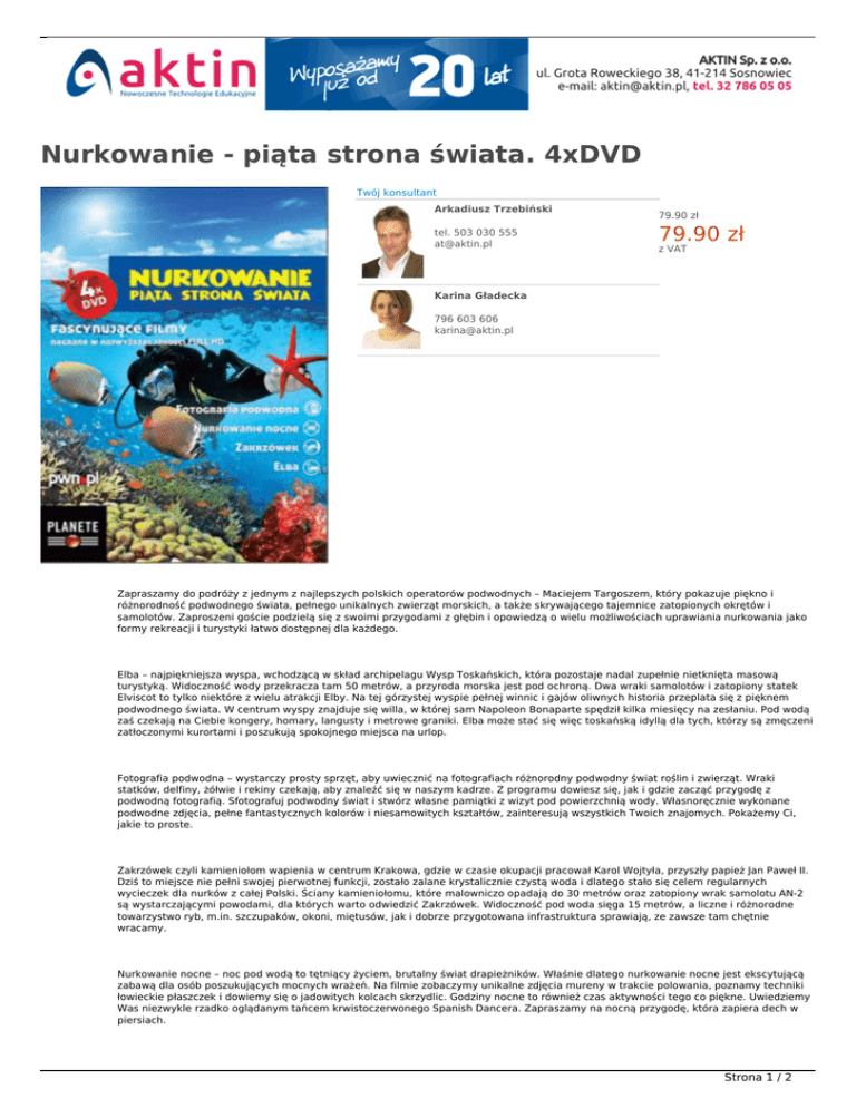 Nurkowanie - piąta strona świata. 4xDVD Twój konsultant Arkadiusz Trzebiński tel. 503 030 555 [email protected] NOWOŚĆ W OFERCIE 79.90 zł 79.90 zł z VAT Karina Gładecka 796 603 606 [email protected] Zapraszamy do podróży z jednym z najlepszych polskich operatorów podwodnych – Maciejem Targoszem, który pokazuje piękno i różnorodność podwodnego świata, pełnego unikalnych zwierząt morskich, a także skrywającego tajemnice zatopionych okrętów i samolotów. Zaproszeni goście podzielą się z swoimi przygodami z głębin i opowiedzą o wielu możliwościach uprawiania nurkowania jako formy rekreacji i turystyki łatwo dostępnej dla każdego. Elba – najpiękniejsza wyspa, wchodzącą w skład archipelagu Wysp Toskańskich, która pozostaje nadal zupełnie nietknięta masową turystyką. Widoczność wody przekracza tam 50 metrów, a przyroda morska jest pod ochroną. Dwa wraki samolotów i zatopiony statek Elviscot to tylko niektóre z wielu atrakcji Elby. Na tej górzystej wyspie pełnej winnic i gajów oliwnych historia przeplata się z pięknem podwodnego świata. W centrum wyspy znajduje się willa, w której sam Napoleon Bonaparte spędził kilka miesięcy na zesłaniu. Pod wodą zaś czekają na Ciebie kongery, homary, langusty i metrowe graniki. Elba może stać się więc toskańską idyllą dla tych, którzy są zmęczeni zatłoczonymi kurortami i poszukują spokojnego miejsca na urlop. Fotografia podwodna – wystarczy prosty sprzęt, aby uwiecznić na fotografiach różnorodny podwodny świat roślin i zwierząt. Wraki statków, delfiny, żółwie i rekiny czekają, aby znaleźć się w naszym kadrze. Z programu dowiesz się, jak i gdzie zacząć przygodę z podwodną fotografią. Sfotografuj podwodny świat i stwórz własne pamiątki z wizyt pod powierzchnią wody. Własnoręcznie wykonane podwodne zdjęcia, pełne fantastycznych kolorów i niesamowitych kształtów, zainteresują wszystkich Twoich znajomych. Pokażemy Ci, jakie to proste. Zakrzówek czyli kamieniołom wapienia w centrum Krakowa, gdzie w czasie okupacji pracował Karol Wojtyła, przyszły papież Jan Paweł II. Dziś to miejsce nie pełni swojej pierwotnej funkcji, zostało zalane krystalicznie czystą woda i dlatego stało się celem regularnych wycieczek dla nurków z całej Polski. Ściany kamieniołomu, które malowniczo opadają do 30 metrów oraz zatopiony wrak samolotu AN-2 są wystarczającymi powodami, dla których warto odwiedzić Zakrzówek. Widoczność pod woda sięga 15 metrów, a liczne i różnorodne towarzystwo ryb, m.in. szczupaków, okoni, miętusów, jak i dobrze przygotowana infrastruktura sprawiają, ze zawsze tam chętnie wracamy. Nurkowanie nocne – noc pod wodą to tętniący życiem, brutalny świat drapieżników. Właśnie dlatego nurkowanie nocne jest ekscytującą zabawą dla osób poszukujących mocnych wrażeń. Na filmie zobaczymy unikalne zdjęcia mureny w trakcie polowania, poznamy techniki łowieckie płaszczek i dowiemy się o jadowitych kolcach skrzydlic. Godziny nocne to również czas aktywności tego co piękne. Uwiedziemy Was niezwykle rzadko oglądanym tańcem krwistoczerwonego Spanish Dancera. Zapraszamy na nocną przygodę, która zapiera dech w piersiach. Strona 1 / 2 Czas: 90 minut Patronat medialny nad serią - Planete reżyseria: Maciej Targosz muzyka: Maciej Kociński, Piotr Wesołowski płyta dvd, format obrazu: 16:9 Strona 2 / 2 Powered by TCPDF (www.tcpdf.org)