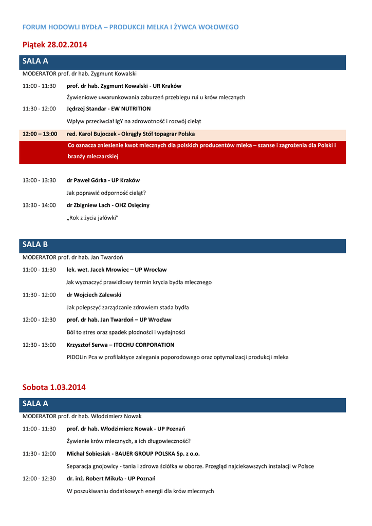 FORUM HODOWLI BYDŁA – PRODUKCJI MELKA I ŻYWCA WOŁOWEGO Piątek 28.02.2014 SALA A MODERATOR prof. dr hab. Zygmunt Kowalski 11:00 - 11:30 prof. dr hab. Zygmunt Kowalski - UR Kraków Żywieniowe uwarunkowania zaburzeń przebiegu rui u krów mlecznych 11:30 - 12:00 Jędrzej Standar - EW NUTRITION Wpływ przeciwciał IgY na zdrowotność i rozwój cieląt 12:00 – 13:00 red. Karol Bujoczek - Okrągły Stół topagrar Polska Co oznacza zniesienie kwot mlecznych dla polskich producentów mleka – szanse i zagrożenia dla Polski i branży mleczarskiej 13:00 - 13:30 dr Paweł Górka - UP Kraków Jak poprawić odporność cieląt? 13:30 - 14:00 dr Zbigniew Lach - OHZ Osięciny „Rok z życia jałówki” SALA B MODERATOR prof. dr hab. Jan Twardoń 11:00 - 11:30 lek. wet. Jacek Mrowiec – UP Wrocław Jak wyznaczyć prawidłowy termin krycia bydła mlecznego 11:30 - 12:00 dr Wojciech Zalewski Jak polepszyć zarządzanie zdrowiem stada bydła 12:00 - 12:30 prof. dr hab. Jan Twardoń – UP Wrocław Ból to stres oraz spadek płodności i wydajności 12:30 - 13:00 Krzysztof Serwa – ITOCHU CORPORATION PIDOLin Pca w profilaktyce zalegania poporodowego oraz optymalizacji produkcji mleka Sobota 1.03.2014 SALA A MODERATOR prof. dr hab. Włodzimierz Nowak 11:00 - 11:30 prof. dr hab. Włodzimierz Nowak - UP Poznań Żywienie krów mlecznych, a ich długowieczność? 11:30 - 12:00 Michał Sobiesiak - BAUER GROUP POLSKA Sp. z o.o. Separacja gnojowicy - tania i zdrowa ściółka w oborze. Przegląd najciekawszych instalacji w Polsce 12:00 - 12:30 dr. inż. Robert Mikuła - UP Poznań W poszukiwaniu dodatkowych energii dla krów mlecznych 12:30 - 13:00 prof. dr hab. Tomasz Strabel - UP Poznań Rewolucja genomowa - jakie korzyści dla hodowców bydła mlecznego? 15:00 - 16:00 Izba Rolnicza Województwa Łódzkiego i Ministerstwo Rolnictwa i Rozwoju Wsi Debata na temat nowego PROW: Polityka rolna oraz rozwój obszarów wiejskich w nowej perspektywie finansowej na lata 2014-2020 SALA B MODERATOR prof. dr hab. Piotr Goliński 11:00 - 11:30 prof. dr hab. Piotr Goliński - UP Poznań Innowacje w produkcji pasz z użytków zielonych w świetle badań krajowych i zagranicznych 11:30 - 12:00 dr Mariusz Kulik - UP Lublin Renowacja użytków zielonych w aspekcie poprawy potencjału produkcyjnego Niedziela 2.03.2014 SALA A MODERATOR SPOMLEK w Radzyniu Podlaskim 11:00 - 11:30 Monika Grzeszuk Nowatorski program Spółdzielczej Mleczarni SPOMLEK - "Zdrowa Krowa” 11:30 - 12:30 dr Marcin Gołębiewski i dr Jan Slósarz Ocena zmian wskaźników techniczno - produkcyjnych w gospodarstwach objętych programem Zdrowa Krowa 12:30 - 13:30 dr Marek Balcerak Opłacalność i koszty jednostkowe mleka w gospodarstwach objętych programem „Zdrowa krowa” w latach 2010-2013 13:30 - 14:00 Monika Grzeszuk i Michał Benet Kazeina-składnik mleka i jego znaczenie w serownictwie SALA C MODERATOR prof. dr hab. Henryk Grodzki 11:00 - 11:30 prof. dr hab. Henryk Grodzki - SGGW Warszawa Uwarunkowania i systemy produkcji wołowiny w Polsce 11:30 - 12:00 prof. dr hab. Maciej Adamski - UP Wrocław Technologie opasu młodego bydła rzeźnego FORUM HODOWLI TRZODY CHLEWNEJ Piątek 28.02.2014 SALA C MODERATOR dr Tadeusz Blicharski 11:00 – 11:30 dr inż. Tadeusz Blicharski – PZHiPTCh „POLSUS” PROW 2014-2020 dla producentów trzody chlewnej” 11:30 – 12:00 Krzysztof Serwa – ITOCHU CORPORATION Tryptofan i walina - aminokwasy limitujące w diecie trzody chlewnej 12:00 – 12:30 dr inż. Tadeusz Blicharski – PZHiPTCh „POLSUS” Unijne regulacje obowiązku etykietowania mięsa wieprzowego Sobota 1.03.2014 SALA C MODERATOR prof. dr hab. Zygmunt Pejsak 11:00 - 11:30 prof. dr hab. Zygmunt Pejsak - PIW Puławy - PIB Afrykański pomór świń - jak chronić krajowe stado świń przed chorobą 11:30 - 12:00 mgr Józef Homanowski - Pellon Sp. z o. o. Płynne żywienie świń - fakty, mity, szanse i zagrożenia 12:00 - 13:00 red. K. Bujoczek - Okrągły Stół - topagrar Polska Regulacje prawne w zakresie stosowania leków weterynaryjnych w chlewni - jak zachować zdrowy rozsądek? 13:00 - 13:30 dr Krzysztof Janeczko - UP Wrocław Konsekwencje hiper proliferacji-zasady zarządzania nadmiernie licznymi miotami 13:30 - 14:00 Krzysztof Serwa - ITOCHU CORPORATION FRAMELCO C-Line – monoglicerydy w walce z problemami zdrowotnymi trzody chlewnej 14:00 - 14:30 dr inż. Mirosław Wantuła - AMIWA E - asystent w produkcji trzody chlewnej FORUM HODOWLI DROBIU Piątek 28.02.2014 SALA D MODERATOR Barbara Ulatowsk 11:00 – 11:30 Ministerstwo Rolnictwa i Rozwoju Wsi Nowe reguły wspólnej organizacji rynków mięsa i jaj. 11:30 - 12:00 prof. dr hab. Iwona Kosieradzka SGGW Pasze z roślin GMO - znakowanie pasz i żywności pochodzenia zwierzęcego 12:00 - 12:30 Ministerstwo Ochrony Środowiska Nowy BREF dla ferm drobiu Sobota 1.03.2014 SALA D MODERATOR prof. dr hab. Andrzej Rutkowski 11:00 - 11:30 prof. dr hab. Andrzej Rutkowski - UP Poznań Perspektywy powrotu do stosowania mączek zwierzęcych w żywieniu zwierząt gospodarskich 11:30 - 12:00 prof. Jan Jankowski - UWM Olsztyn Efektywność stosowania różnych poziomów i źródeł sodu w żywieniu drobiu 12:00 - 12:30 dr Sebastian Kaczmarek - UP Poznań Metody konserwacji ziarna kukurydzy a jej wartość pokarmowa dla drobiu 12:30 - 13:00 Tomasz Wojtczak - Mechanika NAWROCKI Sp. z o. o. Sterylizacja pasz wizytówką najwyższej jakości