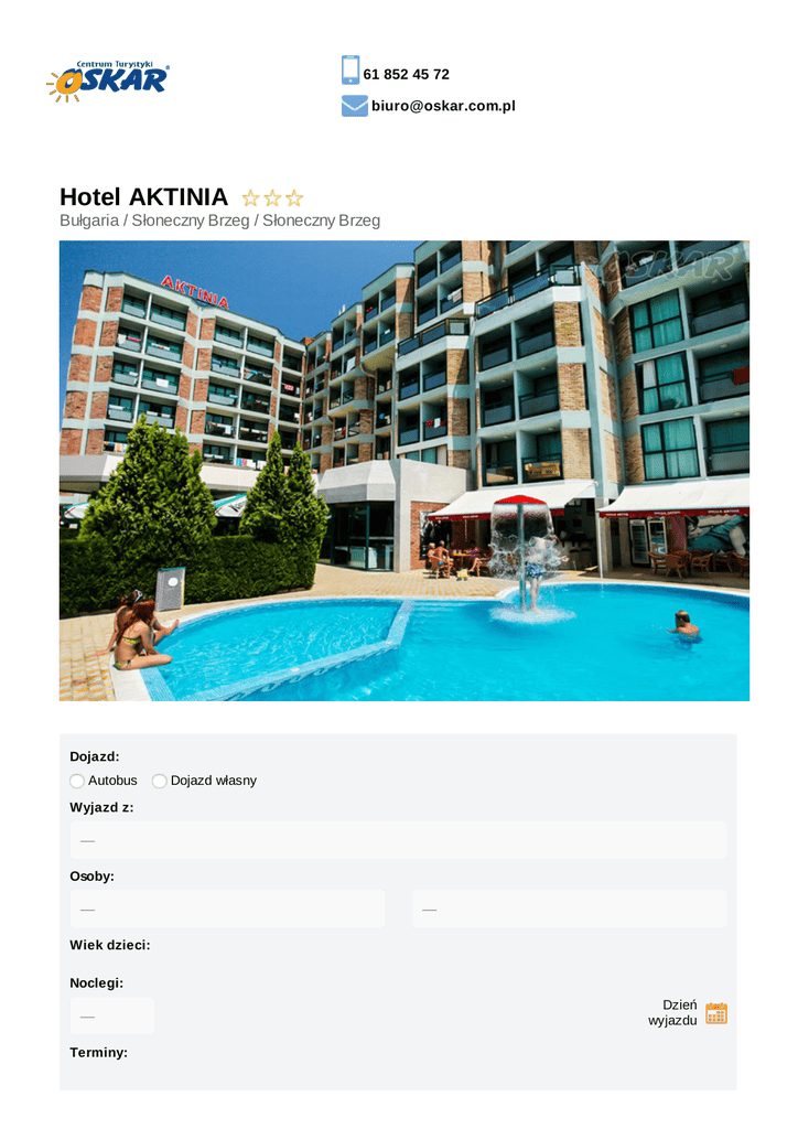 61 852 45 72 [email protected] Hotel AKTINIA Bułgaria / Słoneczny Brzeg / Słoneczny Brzeg Dojazd: Autobus Dojazd własny Wyjazd z: Osoby: Wiek dzieci: Noclegi: Dzień wyjazdu Terminy: Pokój: Wyżywienie: Najtańsza oferta Styczniowe Rabaty zniżka 20% cena katalogowa do 6 marca 2017: 2829,00 zł do 6 marca 2017: 848,70 zł do 1 sierpnia 2017: 0,00 zł do 1 sierpnia 2017: 1980,30 zł Suma: 2829,00 zł Suma: 2829,00 zł Opis oferty Miejscowość Atuty w centrum Opinie Słonecznego Brzegu 100 metrów od piaszczystej plaży basen, ogród, leżaki całodobowy market na terenie obiektu każdy pokój z balkonem, bezpłatną klimatyzacją, TV i lodówką Wi-Fi Położenie Hotel Aktinia położony jest w idealnej lokalizacji – w centrum Słonecznego Brzegu, zaledwie 100 metrów od piaszczystej plaży. Obiekt znajduje się 2 km od starożytnego miasta Nessebyr, gdzie z łatwością można dość na pieszą wycieczkę. Zakwaterowanie Zakwaterowanie w pokojach 2 i 3-osobowych z łazienkami oraz klimatyzacją. Każdy pokój jest wyposażony w balkon, lodówkę, telewizję satelitarną oraz telefon. Do dyspozycji gości jest restauracja, bar, basen zewnętrzny z częścią przeznaczoną dla dzieci oraz kantor wymiany walut. Dostępne opcje zakwaterowania pokój 2 osobowy pokój 3 osobowy Dostępne opcje wyżywienia śniadania śniadania i obiadokolacje śniadania, lunche i obiadokolacje Pakiet KOMFORT gwarancja wyboru miejsca w autokarze napoje w autokarze w cenie (6 x do wyboru: kawa, herbata, zimny napój 0,2l) cena: 50 zł/os Pakiet PRESTIGE gwarancja wyboru miejsca w autokarze napoje w autokarze w cenie (6 x do wyboru: kawa, herbata, zimny napój 0,2l) pierwszeństwo wejścia na pokład autokaru nadbagaż 5 kg w cenie suchy prowiant na drogę powrotną cena: 100 zł/os Karta Dużej Rodziny www.oskar.com.pl/zalaczniki/karta_duzej_rodziny Warunki promocji FIRST MINUTE www.oskar.com.pl/zalaczniki/warunki_promocji Ubezpieczenie Warunki ubezpieczenia Bezpieczne Podróże Signal Iduna dokument do pobrania www.oskar.com.pl/zalaczniki/owu Warunki ubezpieczenia Kosztów Imprezy Turystycznej Signal Iduna dokument do pobrania www.oskar.com.pl/zalaczniki/owurg Turystyczny Fundusz Gwarancyjny W związku z powołaniem do życia w dniu 26.11.2016 Turystycznego Funduszu Gwarancyjnego każdy klient Biura Podróży Oskar zobowiązany jest do zapłaty kwoty w wysokości 10zł/os. przy każdorazowej rezerwacji imprezy turystycznej (obowiązuje od dnia 26.11.2016). Kwota przeznaczona na Turystyczny Fundusz Gwarancyjny zostanie automatycznie doliczona do wartości rezerwacji (w momencie jej dokonania). Wyjątkiem są imprezy turystyczne odbywające się w krajach posiadających granicę z Rzeczpospolitą Polską. Składka nie jest przychodem biura. Udogodnienia Klimatyzacja Regulowane fotele Tacki Nowoczesna flota Zawodowy kierowca Pasy bezpieczeństwa Toaleta w autokarze Podnóżki Dla rodzin z dziećmi Wi-Fi Lodówka Blisko centrum Bez paszportu Blisko plaży Basen odkryty Restauracja hotelowa Region nadmorski Program ramowy Dzień 1 Wyjazd z Polski zgodnie z rozkładem jazdy autokarów. Przejazd przez Czechy, Słowację, Węgry, Serbię. Dzień 2 Przyjazd do Słonecznego Brzegu w godzinach południowych. Zakwaterowanie. Dzień 3-10 Pobyt na miejscu. Możliwość korzystania z dodatkowych wycieczek fakultatywnych. Dzień 11 Wykwaterowanie do godziny 9:00. Czas wolny. Wyjazd do Polski w godzinach popołudniowych. Przejazd przez Serbię, Węgry, Słowację, Czechy. Dzień 12 Przyjazd do Polski. Orientacyjne godziny powrotu do poszczególnych miast zgodnie z rozkładem jazdy autokarów. Cena obejmuje przejazd autokarem klasy LUX (klimatyzacja, cafe - bar, DVD, WC) zakwaterowanie: 9 noclegów w Hotelu AKTINIA*** wyżywienie wg wybranej opcji opiekę pilota opiekę rezydenta na miejscu podatek VAT ubezpieczenie KL 10000 euro, NNW 10000 zł, bagaż (utrata 500 zł) Cena nie obejmuje Dopłaty wymagane na miejscu opłata klimatyczna 10 euro/os, dzieci do 12 lat płacą 50% - płatne u pilota w autokarze Dopłaty opcjonalne ubezpieczenie od chorób przewlekłych i nowotworowych KL 20000 euro, NNW 10000 zł, bagaż (utrata 500 zł): 160 zł/os ubezpieczenie od kosztów rezygnacji: 3,5% wartości rezerwacji Informacje dodatkowe dziecko w wieku 0-5 lat (infant - bez świadczeń hotelowych) płaci 400 zł (autokar, własne oddzielne miejsce), 0 zł (dojazd własny) + ubezpieczenie dokumenty: paszport lub dowód osobisty (zgodnie z obowiązującymi przepisami) zaleca się wyrobienie karty EKUZ Chcesz wiedzieć szybciej? Polub nas na facebooku OSKAR Sp. z o.o. pl.Wolności 2/4c, 61-738 Poznań Potrzebujesz pomocy? Zadzwoń lub napisz: 61 852 45 72 [email protected] Zadzwoń Projekt i wdrożenie: Simply User