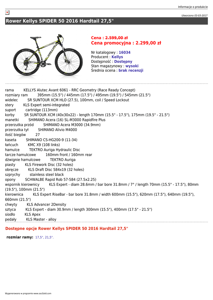 Informacje o produkcie Utworzono 03-03-2017 Rower Kellys SPIDER 50 2016 Hardtail 27,5" Cena : 2.599,00 zł Cena promocyjna : 2.299,00 zł Nr katalogowy : 16034 Producent : Kellys Dostępność : Dostępny Stan magazynowy : wysoki Średnia ocena : brak recenzji rama KELLYS Alutec Avant 6061 - RRC Geometry (Race Ready Concept) rozmiary ram 395mm (15.5") / 445mm (17.5") / 495mm (19.5") / 545mm (21.5") widelec SR SUNTOUR XCM HLO (27.5), 100mm, coil / Speed Lockout stery KLS Expert semi-integrated suport cartridge (113mm) korby SR SUNTOUR XCM (40x30x22) - length 170mm (15.5" - 17.5"), 175mm (19.5" - 21.5") manetki SHIMANO Acera (16) SL-M3000 Rapidfire Plus przerzutka przód SHIMANO Acera M3000 (34.9mm) przerzutka tył SHIMANO Alivio M4000 ilość biegów 27 kaseta SHIMANO CS-HG200-9 (11-34) łańcuch KMC X9 (108 links) hamulce TEKTRO Auriga Hydraulic Disc tarcze hamulcowe 160mm front / 160mm rear dżwignie hamulcowe TEKTRO Auriga piasty KLS Firework Disc (32 holes) obręcze KLS Draft Disc 584x19 (32 holes) szprychy stainless steel black opony SCHWALBE Rapid Rob 57-584 (27.5x2.25) wspornik kierownicy KLS Expert - diam 28.6mm / bar bore 31.8mm / 7° / length 70mm (15.5" - 17.5"), 80mm (19.5"), 100mm (21.5") kierownica KLS Expert RiseBar - bar bore 31.8mm / width 600mm (15.5"), 620mm (17.5"), 640mm (19.5"), 660mm (21.5") chwyty KLS Advancer 2Density sztyca KLS Expert - diam 30.9mm / length 300mm (15.5"), 400mm (17.5" - 21.5") siodło KLS Apex pedały KLS Master - alloy Dostępne opcje Rower Kellys SPIDER 50 2016 Hardtail 27,5" rozmiar ramy: 17,5", 21,5". Wygenerowano w programie www.oscGold.com