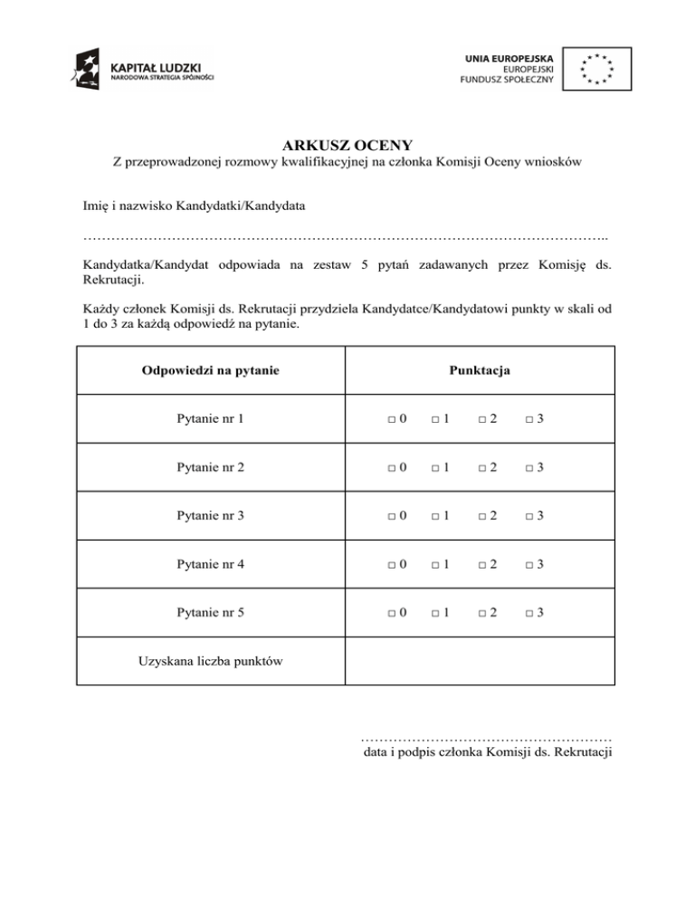 ARKUSZ OCENY Z przeprowadzonej rozmowy kwalifikacyjnej na członka Komisji Oceny wniosków Imię i nazwisko Kandydatki/Kandydata ………………………………………………………………………………………………….. Kandydatka/Kandydat odpowiada na zestaw 5 pytań zadawanych przez Komisję ds. Rekrutacji. Każdy członek Komisji ds. Rekrutacji przydziela Kandydatce/Kandydatowi punkty w skali od 1 do 3 za każdą odpowiedź na pytanie. Odpowiedzi na pytanie Punktacja Pytanie nr 1 □0 □1 □2 □3 Pytanie nr 2 □0 □1 □2 □3 Pytanie nr 3 □0 □1 □2 □3 Pytanie nr 4 □0 □1 □2 □3 Pytanie nr 5 □0 □1 □2 □3 Uzyskana liczba punktów ……………………………………………… data i podpis członka Komisji ds. Rekrutacji