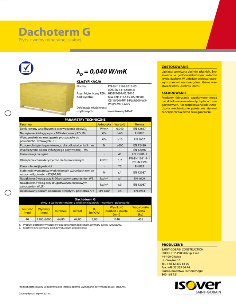 karty_produktoweVI_24.indd Dachoterm G Płyty z wełny mineralnej skalnej Zastosowanie λD = 0,040 W/mK KLASYFIKACJA Norma: PN-EN 13162:2013-05 (IDT. EN 13162:2012) Atest higieniczny PZH: HK/B/1609/02/2010 Kod wyrobu: MW-EN13162-T5-DS(70,90)CS(10/60)-TR15-PL(5)600-WSWL(P)-MU1-AFr5 Deklaracja właściwości użytkowych: www.isover.pl/DoP „Izolacja termiczna dachów płaskich. Stosowana w jednowarstwowym układzie krycia dachów. W układzie wielowarstwowym stanowi warstwę górną. Górna warstwa zestawu „Srebrny Dach”. Składowanie Produkty fabrycznie zapakowane mogą być składowane na otwartych placach magazynowych. Raz rozpakowana lub uszkodzona mechanicznie paleta nie stanowi zabezpieczenia przed zawilgoceniem. PARAMETRY TECHNICZNE Parametr Deklarowany współczynnik przewodzenia ciepła λD Naprężenie ściskające przy 10% deformacji CS(10) Wytrzymałość na rozciąganie prostopadłe do powierzchni czołowych - TR Poziom obciążenia punktowego dla odkształcenia 5 mm Współczynnik oporu dyfuzyjnego pary wodnej - MU Klasa reakcji na ogień Obciążenie charakterystyczne ciężarem własnym Klasa tolerancji grubości Stabilność wymiarowa w określonych warunkach temperatury i wilgotności – DS(70,90) Nasiąkliwość wodą przy krótkotrwałym zanurzeniu - WS Nasiąkliwość wodą przy długotrwałym częściowym zanurzeniu - WL(P) Deklarowany poziom oporności przepływu powietrza AFr Jednostka W/mK kPa Wartość 0,040 ≥60 Norma EN 12667 EN 826 kPa ≥15 EN 1607 N - ≥600 1 A1 kN/m3 1,7 - T5 EN 12430 EN 12086 EN 13501-1 PN-EN 1991-1-1 PN-EN 1990 EN 823 % ≤1 EN 12087 kg/m2 ≤1 EN 1609 kg/m2 ≤3 EN 12087 kPa s/m3 ≥5 EN 2953 Dachoterm G płyty z wełny mineralnej z włókien skalnych – wymiary i pakowanie Grubość [mm] Wymiary [mm] m2/opak. m2/pal. RD [m K/W] Wysokość produkt + paleta [mm] Waga brutto paleta [kg] 40 1200x2000 64,80 64,80 1,00 1140 435 2 1. Produkt dostępny wyłącznie w opakowaniach zbiorczych. Wymiary palety 1200x2000. 2. Możliwe inne wymiary po indywidualnym uzgodnieniu. PRODUCENT: SAINT-GOBAIN CONSTRUCTION PRODUCTS POLSKA Sp. z o.o. 44-100 Gliwice ul. Okrężna 16 Tel. +48 32 339 63 00 Fax. +48 32 339 64 44 Biuro Doradztwa Technicznego: 800 163 121 Produkt zastosowany w budynku jako izolacja spełnia wymagania certyfikacji LEED i BREEAM. Data wydania: sierpień 2014 r.