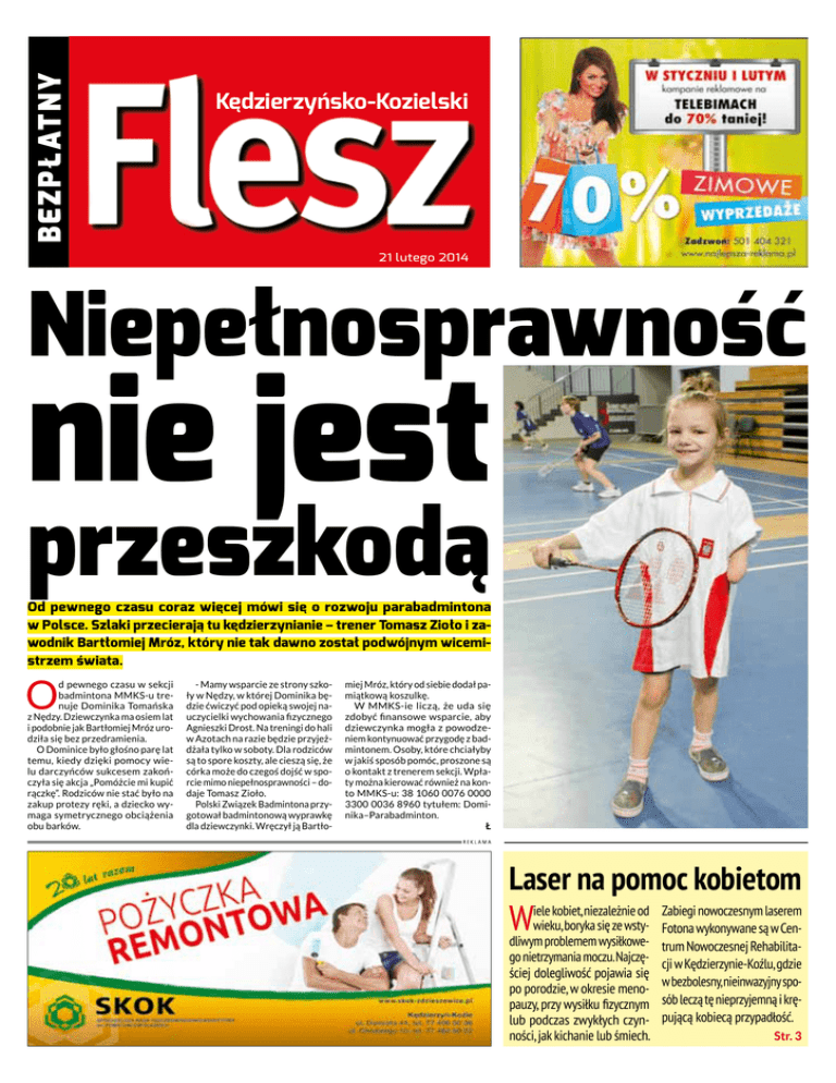 BE Z PŁATNY Kędzierzyńsko-Kozielski 21 lutego 2014 Niepełnosprawność nie jest przeszkodą Od pewnego czasu coraz więcej mówi się o rozwoju parabadmintona w Polsce. Szlaki przecierają tu kędzierzynianie – trener Tomasz Zioło i zawodnik Bartłomiej Mróz, który nie tak dawno został podwójnym wicemistrzem świata. O d pewnego czasu w sekcji badmintona MMKS-u trenuje Dominika Tomańska z Nędzy. Dziewczynka ma osiem lat i podobnie jak Bartłomiej Mróz urodziła się bez przedramienia. O Dominice było głośno parę lat temu, kiedy dzięki pomocy wielu darczyńców sukcesem zakończyła się akcja „Pomóżcie mi kupić rączkę”. Rodziców nie stać było na zakup protezy ręki, a dziecko wymaga symetrycznego obciążenia obu barków. - Mamy wsparcie ze strony szkoły w Nędzy, w której Dominika będzie ćwiczyć pod opieką swojej nauczycielki wychowania fizycznego Agnieszki Drost. Na treningi do hali w Azotach na razie będzie przyjeżdżała tylko w soboty. Dla rodziców są to spore koszty, ale cieszą się, że córka może do czegoś dojść w sporcie mimo niepełnosprawności – dodaje Tomasz Zioło. Polski Związek Badmintona przygotował badmintonową wyprawkę dla dziewczynki. Wręczył ją Bartło- miej Mróz, który od siebie dodał pamiątkową koszulkę. W MMKS-ie liczą, że uda się zdobyć finansowe wsparcie, aby dziewczynka mogła z powodzeniem kontynuować przygodę z badmintonem. Osoby, które chciałyby w jakiś sposób pomóc, proszone są o kontakt z trenerem sekcji. Wpłaty można kierować również na konto MMKS-u: 38 1060 0076 0000 3300 0036 8960 tytułem: Dominika–Parabadminton. Ł Laser na pomoc kobietom W iele kobiet, niezależnie od wieku, boryka się ze wstydliwym problemem wysiłkowego nietrzymania moczu. Najczęściej dolegliwość pojawia się po porodzie, w okresie menopauzy, przy wysiłku fizycznym lub podczas zwykłych czynności, jak kichanie lub śmiech. Zabiegi nowoczesnym laserem Fotona wykonywane są w Centrum Nowoczesnej Rehabilitacji w Kędzierzynie-Koźlu, gdzie w bezbolesny, nieinwazyjny sposób leczą tę nieprzyjemną i krępującą kobiecą przypadłość. Str. 3 2 Policyjna akcja „Bezpieczne ferie” Dla najmłodszych długo wyczekiwany czas odpoczynku od nauki, a dla mundurowych okres wytężonej pracy. 17 lutego na Opolszczyźnie rozpoczęły się ferie zimowe, a wraz z nimi wzmożone kontrole na drogach. Policyjna akcja „Bezpieczne ferie 2014” wystartowała w weekend poprzedzający pierwszy tydzień ferii. Funkcjonariusze z wydziału drogówki skontrolowali 68 autokarów w całym regionie. Efektem było zatrzymanie jednego dowodu rejestracyjnego pojazdu oraz nałożenie dwóch mandatów karnych. Policjanci zwracają się z prośbą do rodziców i opiekunów dzieci, które w czasie ferii zimowych wybierają się na wycieczki, o zgłaszanie wątpliwości co do stanu technicznego autokarów bądź innych nieprawidłowości. Każde takie zgłoszenie zostanie skontrolowane przez funkcjonariuszy z wydziału ruchu drogowego. Nie ma co ryzykować, bo tu chodzi o bezpieczeństwo najmłodszych. LP 21 lutego 2014 Kolejna trasa turystyczna „City Walk” Zobacz resztki twierdzy „Szlakiem Twierdzy Koźle” to kolejna, czwarta, trasa turystyczna funkcjonująca w systemie „City Walk”. Składa się z piętnastu oznaczonych tablicami miejsc, wskazujących pozostałości pruskiej fortecy. Przedstawiony na tablicach materiał edukacyjny jest dostępny w czterech językach. Trasa znajduje się na osiedlu Stare Miasto i jest dostępna dla zwiedzających za pomocą istniejącego systemu audioprzewodników. Aby odbyć spacer przedstawioną trasą, a także pozostałymi trzema, trzeba zajrzeć do punktów informacji turystycznej, mieszczących się w Miejskiej Bibliotece Publicznej na Rynku oraz w filii nr 5 przy ul. Damrota 32 w celu wypożyczenia audioprzewodnika. Ponadto dla zwiedzających przygotowano dwa tysiące kieszonkowych przewodników z mapką w celu ułatwienia poruszania się po szlaku. W ramach projektu „Transgraniczna edukacja historyczna – szlakiem Twierdzy Koźle” przeprowadzono badania archeologiczne oraz zorganizowano polsko-czeską konferencję, podczas której zaprezentowano wyniki badań. W celu przygotowania materiałów służących do stworzenia ścieżki W Koźlu można zobaczyć sporo pozostałości pruskiej twierdzy. odczytano i opracowano starodruki. W MBP można również wypożyczyć publikacje wydane w ramach projektu: „Dzieje miasta i twierdzy Koźle” oraz „Militarne tradycje Kędzierzyna-Koźla, Śląska i Rzeczypospolitej”. Każdą z nich wydrukowano w nakładzie 400 szt. Projekt „Transgraniczna edukacja historyczna – szlakiem Twierdzy Koźle” jest współfinansowany ze środków Europejskiego Funduszu Rozwoju Regionalnego oraz środków budżetu państwa. PRZEKRACZAMY GRANICE. Jego wartość wyniosła ponad 106 tys. zł, z czego większość pokryje zewnętrzne dofinansowanie. Projekt był realizowany od 2012 roku. PMKS Protest opóźnia wykonanie inwestycji „Flesz” – ukazuje się w Kędzierzynie-Koźlu i Powiecie Kędzierzyńsko-Kozielskim www.tygodnikflesz.pl Adres redakcji: al. Jana Pawła II 36, 47-220 Kędzierzyn-Koźle Tel./fax (77) 483-40-49 E-mail: [email protected] Redaktor naczelny: Grzegorz Łabaj Sekretarz redakcji: Grzegorz Stępień Projekt graficzny i skład: greatio.com, tel. 601-422-132; Reklama: tel. 501 404 321, (77) 481-99-76 Wydawca: Lokalna Sp. z o.o. e-mail: [email protected] Adres: al. Jana Pawła II 36, 47-220 Kędzierzyn-Koźle Tel.: (77) 483-46-59 Redakcja nie zwraca materiałów niezamówionych oraz zastrzega sobie prawo do redagowania i skracania nadesłanych tekstów. Za treść reklam i ogłoszeń redakcja nie odpowiada. Chaos przy budowie wałów cofkowych Ponad trzy miesiące temu wstrzymano prace przy budowie wału cofkowego rzeki Dzielniczki. Niezagrożona jest budowa głównego wału, który ma być gotowy jesienią tego roku.