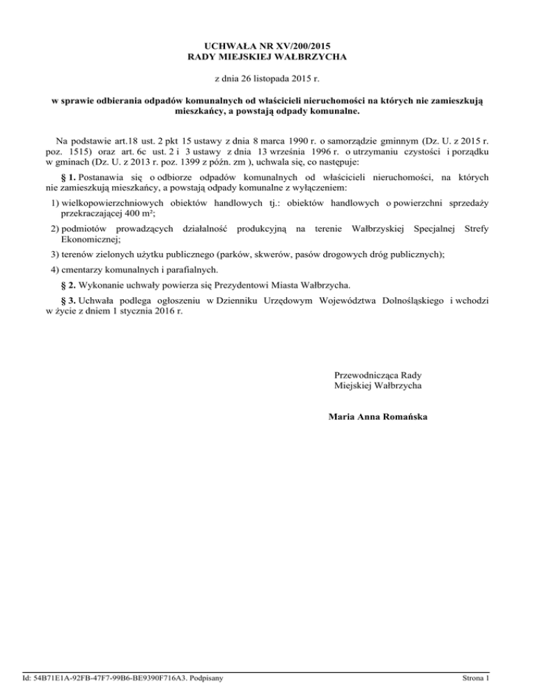 UCHWAŁA NR XV/200/2015 RADY MIEJSKIEJ WAŁBRZYCHA z dnia 26 listopada 2015 r. w sprawie odbierania odpadów komunalnych od właścicieli nieruchomości na których nie zamieszkują mieszkańcy, a powstają odpady komunalne. Na podstawie art.18 ust. 2 pkt 15 ustawy z dnia 8 marca 1990 r. o samorządzie gminnym (Dz. U. z 2015 r. poz. 1515) oraz art. 6c ust. 2 i 3 ustawy z dnia 13 września 1996 r. o utrzymaniu czystości i porządku w gminach (Dz. U. z 2013 r. poz. 1399 z późn. zm ), uchwala się, co następuje: § 1. Postanawia się o odbiorze odpadów komunalnych od właścicieli nieruchomości, na których nie zamieszkują mieszkańcy, a powstają odpady komunalne z wyłączeniem: 1) wielkopowierzchniowych obiektów handlowych tj.: obiektów handlowych o powierzchni sprzedaży przekraczającej 400 m²; 2) podmiotów prowadzących działalność produkcyjną na terenie Wałbrzyskiej Specjalnej Strefy Ekonomicznej; 3) terenów zielonych użytku publicznego (parków, skwerów, pasów drogowych dróg publicznych); 4) cmentarzy komunalnych i parafialnych. § 2. Wykonanie uchwały powierza się Prezydentowi Miasta Wałbrzycha. § 3. Uchwała podlega ogłoszeniu w Dzienniku Urzędowym Województwa Dolnośląskiego i wchodzi w życie z dniem 1 stycznia 2016 r. Przewodnicząca Rady Miejskiej Wałbrzycha Maria Anna Romańska Id: 54B71E1A-92FB-47F7-99B6-BE9390F716A3. Podpisany Strona 1 Uzasadnienie Zgodnie z art. 6 c ust. 2 ustawy z dnia 13 września 1996r. o utrzymaniu czystości i porządku w gminach (Dz. U. z 2013r. poz. 1399 z późn. zm.), rada gminy może w drodze uchwały postanowić o odbieraniu odpadów komunalnych od właścicieli nieruchomości, na których nie zamieszkują mieszańcy, a powstają odpady komunalne.Włączenie nieruchomości niezamieszkałych do gminnego systemu gospodarowania odpadami umożliwi uszczelnienie już istniejącego systemu i uzyskanie tym samym odpowiednich poziomów odzysku i recyklingu. Nowelizacja ustawy o utrzymaniu czystości i porządku w gminach, dokonana ustawą z dnia 28 listopada 2014 r. o zmianie ustawy o utrzymaniu czystości i porządku w gminach oraz niektórych innych ustaw (Dz. U. z 2015 r. poz. 87) umożliwia przy objęciu systemem gospodarowania odpadami komunalnymi, wyłączenie z tego systemu zarówno nieruchomości, na których jest prowadzony określony rodzaj działalności jak również właścicieli określonych nieruchomości. Mając powyższe na uwadze postanawia się o wyłączeniu z gminnego systemu gospodarki odpadami komunalnymi: 1) wielkopowierzchniowych obiektów handlowych tj.: obiektów handlowych o powierzchni sprzedaży przekraczającej 400 m²; 2) podmiotów prowadzących działalność produkcyjną na terenie Wałbrzyskiej Specjalnej Strefy Ekonomicznej; 3) terenów zielonych użytku publicznego (parki, skwery, pasy drogowe dróg publicznych); 4) cmentarzy komunalnych i parafialnych. Właściciele wyłączonych nieruchomości, będą zobowiązani do pozbywania się odpadów komunalnych zgodnie z zasadami określonymi w art. 6 ust. 1 ustawy o utrzymaniu czystości i porządku w gminach tj. będą zobowiązani do zawarcia umowy z podmiotem uprawnionym do odbierania odpadów komunalnych od właścicieli nieruchomości. Gmina będzie miała możliwość kontrolowania powyższych właścicieli nieruchomości w zakresie wykonania obowiązków wynikających z ustawy poprzez wezwanie do okazania zawartej umowy oraz dowodów opłaty za świadczone usługi. Ocenia się, że wyłączenie nieruchomości, objętych uchwałą nie wpłynie na szczelność systemu gospodarowania odpadami. Mając na uwadze powyższe podjęcie uchwały jest zasadne. Przewodnicząca Rady Miejskiej Wałbrzycha Maria Anna Romańska Id: 54B71E1A-92FB-47F7-99B6-BE9390F716A3. Podpisany Strona 1