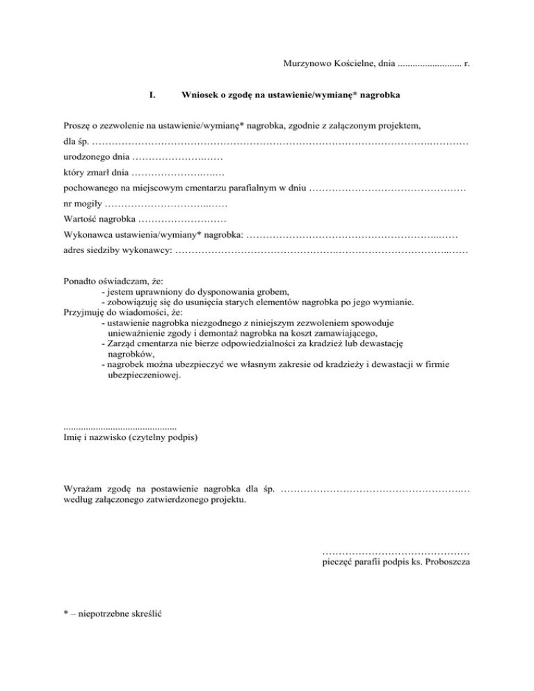 Murzynowo Kościelne, dnia .......................... r. I. Wniosek o zgodę na ustawienie/wymianę* nagrobka Proszę o zezwolenie na ustawienie/wymianę* nagrobka, zgodnie z załączonym projektem, dla śp. ………………………………………………………………………………………….………… urodzonego dnia ………………….…… który zmarł dnia ………………….….… pochowanego na miejscowym cmentarzu parafialnym w dniu ………………………………………… nr mogiły …………………………..…… Wartość nagrobka ……………………… Wykonawca ustawienia/wymiany* nagrobka: …………………………………………………..…… adres siedziby wykonawcy: ………………………………………….……………………………..…… Ponadto oświadczam, że: - jestem uprawniony do dysponowania grobem, - zobowiązuję się do usunięcia starych elementów nagrobka po jego wymianie. Przyjmuję do wiadomości, że: - ustawienie nagrobka niezgodnego z niniejszym zezwoleniem spowoduje unieważnienie zgody i demontaż nagrobka na koszt zamawiającego, - Zarząd cmentarza nie bierze odpowiedzialności za kradzież lub dewastację nagrobków, - nagrobek można ubezpieczyć we własnym zakresie od kradzieży i dewastacji w firmie ubezpieczeniowej. .............................................. Imię i nazwisko (czytelny podpis) Wyrażam zgodę na postawienie nagrobka dla śp. ……………………………………………….… według załączonego zatwierdzonego projektu. ……………………………………… pieczęć parafii podpis ks. Proboszcza * – niepotrzebne skreślić II. Oświadczenie Wykonawcy Niniejszym jako Wykonawca zobowiązuję się: 1. Do wykonania nagrobku według projektu zatwierdzonego przez Zarządcę cmentarza, 2. Do zgłoszenia terminu rozpoczęcia prac oraz ich zakończenia, a także do uczestniczenia wraz z Zarządcą cmentarza w odbiorze technicznym powykonawczym, 3. Do zgłoszenia Zarządcy cmentarza zauważonych uszkodzeń grobów sąsiednich przed rozpoczęciem wykonania zlecenia ustawienia/wymiany* nagrobka, 4. Do korekty wszelkich prac wykonanych niezgodnie z zatwierdzonym projektem, 5. Do naprawienia szkód powstałych na cmentarzu podczas stawiania nagrobka lub wobec osób trzecich w trakcie realizacji zlecenia. Przyjmuję do wiadomości, że niedopełnienie przez Wykonawcę obowiązku zgłoszenia zakończenia prac i uczestniczenia w odbiorze technicznym może skutkować zakazem realizacji innych zleceń na terenie cmentarza parafialnego oraz powstaniem odpowiedzialności na zasadach przewidzianych przepisami prawa. Załączniki nr: 1. Rysunek nagrobka. ………………………………… podpis i pieczątka wykonawcy III . Odbiór techniczny W dniu …………………… dokonano odbioru technicznego wykonania nagrobka wg w/w zlecenia. Zlecenie wykonano (nie)* zgodnie z zatwierdzonym projektem. Uwagi: …………………………………………………………………………………………………………… ………………………………….……………………………………………………………………… ……………………………….. ……………………………….. podpis i pieczątka Wykonawcy podpis ks. proboszcza i pieczęć parafii * – niepotrzebne skreślić
