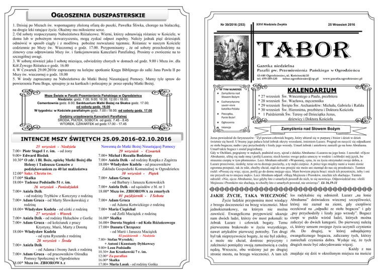 OGŁOSZENIA DUSZPASTERSKIE 1. Dzisiaj po Mszach w. wspomagamy zło oną ofiarą do puszki, Pawełka liwka, chorego na białaczkę, na drogie leki ratujące ycie. Oka my mu miłosierne serce. 2. Od soboty rozpoczynamy Nabo eństwa Ró ańcowe. Wierni, którzy odmawiają ró aniec w Ko ciele, w domu lub w pobo nym stowarzyszeniu, mogą zyskać odpust zupełny. Nale y jednak pięć dziesiątek odmówić w sposób ciągły i z modlitwą pobo ne rozwa anie tajemnic. Ró aniec w naszym Ko ciele codziennie po Mszy w. Wieczornej o godz. 17.00. Przypominamy , e od soboty przechodzimy na zimowy czas odprawiania Mszy w. i funkcjonowania Kancelarii Parafialnej. Prosimy o zwrócenie na to szczególnej uwagi. 3. W sobotę równie jako I sobotę miesiąca, odwiedziny chorych w domach od godz. 9.00 i Msza w. dla Kół ywego Ró ańca o godz. 16.00 4. W Czwartek 29.09.2016r zapraszamy na kolejne spotkanie Kręgu Biblijnego do salki Jana Pawła II po Mszy w. wieczornej o godz. 18.00 5. W rody zapraszamy na Nabo eństwa do Matki Bo ej Nieustającej Pomocy. Mamy tyle spraw do powierzenia Panu Bogu, spisujmy je na kartkach i polecajmy je przez opiekę Matki Bo ej. Nr 39/2016 (253) W tym numerze Msze więte w Parafii Przemienienia Pańskiego w Ogrodzieńcu NiedzielaŚ godz. 7.00; 9.00; 10.30; 12.00 i 18.00; Cementownia godz. 8.00; Sanktuarium Matki Bożej na Skałce godz. 17.00; od soboty godz. 16.00 W tygodniuŚ w Ko ciele parafialnym godz. 7.00 i 18.00; od soboty godz. 17.00 *** Godziny urzędowania Kancelarii Parafialnej ŚRODA, PIĄTEK, SOBOTA od godz. 7.45 - 8.45 WTOREK, CZWARTEK od godz.17.00 - 17.45 INTENCJE MSZY WIĘTYCH 25.09.2016-02.10.2016 25 wrzesień - Niedziela 7.00+ Piotr Stąpel 1 r. m. - od ony 9.00+ Edward Biedak 10.30* O zdr. i Bł. Bo e, opiekę Matki Bo ej dla Heleny i Tadeusza żemzów z podziękowaniem za 40 lat mał eństwa 12.00* Sakr. Chrztu w. 17.00* Skałka 18.00+ Tadeusz Podsiadło 51 r. m. 26 wrzesień - Poniedziałek 7.00+ Aniela Dzik - od rodziny Trybków z Korczyny z rodziną 7.00+ Adam żruca - od Marty Słowikowskiej z rodziną 18.00+ Władysław Kudela - od córki z rodziną 27 wrzesień - Wtorek 7.00+ Aniela Dzik - od rodziny Haluchów z żorlic 7.00+ Adam żruca - od kole anek z pracy Krystyny, Marii, Marty z Dorotą 18.00+ Władysław Kudela - od syna Ryszarda z rodziną 28 wrzesień - Środa 7.00+ Aniela Dzik - od Adama i Iwony Jurek z rodziną 7.00+ Adam żruca - od pracowników O rodka Pomocy Społecznej w Ogrodzieńcu 18.00* Msza w. ZBIOROWA z Nowenną do Matki Bo ej Nieustającej Pomocy 29 wrzesień - Czwartek 7.00+ Michał i Rozalia Bodziony 7.00+ Aniela Dzik - od rodziny Rzepka z Zagórza 18.00+ Władysław Kudela - od pracowników Zakładu żospodarki Komunalnej w Ogrodzieńcu 30 wrzesień - Piątek 7.00+ Adam żruca - od Barbary i Janusza Kotowskich 7.00+ Aniela Dzik - od sąsiadów z bl. nr 1 18.00* Msza w. ZBIOROWA za zmarłych 01 październik - I Sobota 7.00+ Adam żruca - od Adama Kotwickiego z rodziną 7.00+ Maria Ciepichał - od Zofii Macią ek z rodziną 16.00* Skałka 16.00+ Dorota Stępień - od Koła Ró ańcowego 17.00+ Danuta Chrząszcz - od Marii i Janusza Macią ek 02 październik - Niedziela 7.00+ Stefan Wyrodekś + Antoni i Konstanty Dybkowscy 9.00+ Leon Podsiadło 10.30+ Jan Krankowski 7 r. m. 12.00* Za parafian 16.00* Skałka 17.00+ Maria Lasak - od rodziny żońka Za yśle ia ad Sło e Boży Eucharystycz y sa oir- i re katolika-Polaka Pieczątka, Pa ie Boże! Ogłosze ia I te cje XXVI Niedziela Zwykła 25 Wrzesień 2016 KALENDARIUM * 27 wrzesień w. Wincentego a Paulo, prezbitera * 28 wrzesień w. Wacława, męczennika * 29 wrzesień więto w. ArchaniołówŚ Michała, żabriela i Rafała * 30 wrzesień w. Hieronima, prezbitera i Doktora Ko cioła * 1 Pa dziernik w. Teresy od Dzieciątka Jezus, dziewicy i Doktora Ko cioła Zamy lenia nad Słowem Bożym Jezus powiedział do faryzeuszówŚ ” ył pewien człowiek bogaty, który ubierał się w purpurę i bisior i dzień w dzień wietnie się bawił. U bramy jego pałacu le ał ebrak okryty wrzodami, imieniem Łazarz. Pragnął on nasycić się odpadkami ze stołu bogaczaś nadto i psy przychodziły i lizały jego wrzody. Umarł ebrak i aniołowie zanie li go na łono Abrahama. Umarł tak e bogacz i został pogrzebany. żdy w Otchłani, pogrą ony w mękach, podniósł oczy, ujrzał z daleka Abrahama i Łazarza na jego łonie. I zawołałŚ »Ojcze Abrahamie, ulituj się nade mną i po lij Łazarzaś niech koniec swego palca umoczy w wodzie i ochłodzi mój język, bo strasznie cierpię w tym płomieniu«. Lecz Abraham odrzekłŚ »Wspomnij, synu, e za ycia otrzymałe swoje dobra, a Łazarz przeciwnie, niedolęś teraz on tu doznaje pociechy, a ty męki cierpisz. A prócz tego między nami a wami zionie ogromna przepa ć, tak e nikt, choćby chciał, stąd do was przej ć nie mo e ani stamtąd do nas się przedostać«. Tamten rzekłŚ »Proszę cię więc, ojcze, po lij go do domu mojego ojca. Mam bowiem pięciu braciŚ niech ich przestrze e, eby i oni nie przyszli na to miejsce męki«. Lecz Abraham odparłŚ »Mają Moj esza i Proroków, niech e ich słuchają«. Tamten odrzekłŚ »Nie, ojcze Abrahamie, lecz gdyby kto z umarłych poszedł do nich, to się nawrócą«. Odpowiedział muŚ »Je li Moj esza i Proroków nie słuchają, to choćby kto z umarłych powstał, nie uwierzą«”. Łk 16,19-31 JAKIE YCIE, TAKA WIECZNO Ć los radykalnie się odmienił. Łazarz „na łonie ycie ludzkie przypomina most wiodący z brzegu doczesno ci na brzeg wieczno ci. Most jednokierunkowy, na którym nie mo na zawrócić. źwangeliczna przypowie ć ukazuje nam dwóch ludzi, którzy ów most pokonaliŚ to ebrak Łazarz i człowiek bogaty. Temu pierwszemu brakowało w yciu wszystkiego, nawet artykułów pierwszej potrzeby. Ten drugi był tak nieprzyzwoicie bogaty, e nie był zdolny, a mo e nie chciał, dostrzec przyczyny i zale no ci pomiędzy swoją zamo no cią a cudzą nędzą. Wreszcie, obu widzimy ju 