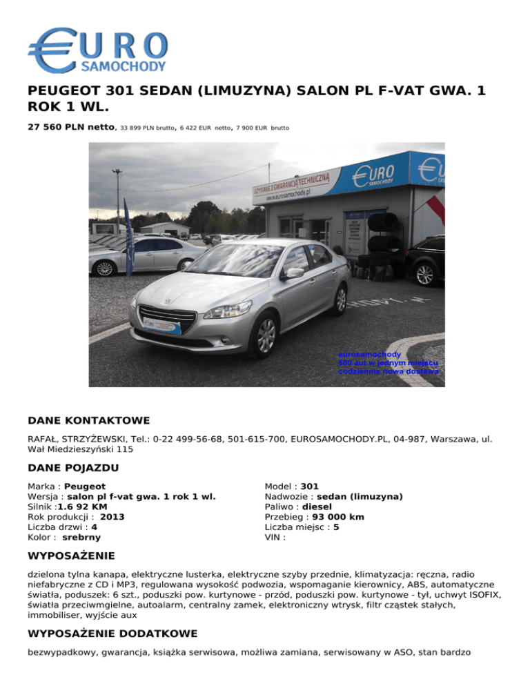 PEUGEOT 301 SEDAN (LIMUZYNA) SALON PL F-VAT GWA. 1 ROK 1 WL. 27 560 PLN netto, 33 899 PLN brutto, 6 422 EUR netto, 7 900 EUR brutto DANE KONTAKTOWE RAFAŁ, STRZYŻEWSKI, Tel.: 0-22 499-56-68, 501-615-700, EUROSAMOCHODY.PL, 04-987, Warszawa, ul. Wał Miedzieszyński 115 DANE POJAZDU Marka : Peugeot Wersja : salon pl f-vat gwa. 1 rok 1 wl. Silnik :1.6 92 KM Rok produkcji : 2013 Liczba drzwi : 4 Kolor : srebrny Model : 301 Nadwozie : sedan (limuzyna) Paliwo : diesel Przebieg : 93 000 km Liczba miejsc : 5 VIN : WYPOSAŻENIE dzielona tylna kanapa, elektryczne lusterka, elektryczne szyby przednie, klimatyzacja: ręczna, radio niefabryczne z CD i MP3, regulowana wysokość podwozia, wspomaganie kierownicy, ABS, automatyczne światła, poduszek: 6 szt., poduszki pow. kurtynowe - przód, poduszki pow. kurtynowe - tył, uchwyt ISOFIX, światła przeciwmgielne, autoalarm, centralny zamek, elektroniczny wtrysk, filtr cząstek stałych, immobiliser, wyjście aux WYPOSAŻENIE DODATKOWE bezwypadkowy, gwarancja, książka serwisowa, możliwa zamiana, serwisowany w ASO, stan bardzo dobry, właściciel niepalący OPIS POJAZDU Peugeot 301 2012r WITAMY W NAJWIĘKSZYM W POLSCE SALONIE SAMOCHODÓW UŻYWANYCH SUPER PROMOCJA GWARANCJA TECHNICZNA NA 12 MIESIĘCY lub KOMPLET OPON ZIMOWYCH lub LETNICH GRATIS*(do wyczerpania zapasów, możliwość rozszerzenia gwarancji do 36 miesięcy) - 500 AUT Z GWARANCJĄ w jednym miejscu / różne marki , modele , wersje wyposażenia/ - 8 dni na zamianę auta - Sprawdzone pochodzenie pojazdów - bezwypadkowe - Gwarancja przebiegu - Gwarancja pełnej historii serwisowej - Samochody od I właściciela - dla klientów zamiejscowych rezerwacja auta do czasu przyjazdu - udzielamy 12-miesięcznej gwarancji technicznej, możliwość przedłużenia do 36-miesięcy /bez limitu kilometrów, ważna na terenie całej Polski + assistance- darmowe holowanie , potwierdzenie certyfikatem / Kupującemu oferujemy: 1. Jazdę próbną 2. Bezpłatny przegląd przedsprzedażowy obejmujący: - kontrolę amortyzatorów - hamulców - podwozia samochodu - pomiar geometrii - diagnoza komputerowa - pomiar grubości powłoki lakierniczej - możliwość sprawdzenia przed zakupem w serwisie lub stacji diagnostycznej lub za pośrednictwem niezależnego rzeczoznawcy na zlecenie kupującego /dla klientów zamiejscowych bez konieczności przyjazdu/. - wszystkie nasze samochody posiadają komplet dokumentów wymaganych do zarejestrowania bądź przerejestrowania samochodu - przyjmujemy auta w rozliczeniu oraz kupujemy /bez ograniczeń wiekowych/ - Zajmujemy się sprzedażą detaliczną oraz hurtową / zapraszamy do współpracy osoby prywatne, firmy również z branży i instytucje / -Kupujący otrzymuje fakturę VAT 23% /nie ponosi opłaty PCC w wysokości 2%/ -kredyt 0% wpłaty własnej,raty dopasowane do własnych potrzeb -leasing bez zaświadczeń ,również dla widniejących w BIK szybka obsługa na miejscu "Niniejsze ogłoszenia są wyłącznie informacją handlową i nie stanowią oferty w myśl art. 66, § 1. Kodeksu Cywilnego. Sprzedający nie odpowiada za ewentualne błędy lub nieaktualność ogłoszenia." Zapis ten został zamieszczony ze względu na możliwość niezamierzonych pomyłek. Jeżeli zauważysz nieścisłość napisz do nas. Szukasz pewnego używanego auta ? Tylko u nas sprawdzone samochody z polskich salonów To nie komis to salon aut używanych z wieloletnim doświadczeniem Więcej informacji na eurosamochody . pl ZADZWOŃ TERAZ!!! Rafał 501 615 700 Tomasz 512 345 150 Marcin 505 416 300 Piotr 501 087 038 Mariusz 500 130 727 QR CODE DLA OGŁOSZENIA Powered by TCPDF (www.tcpdf.org)