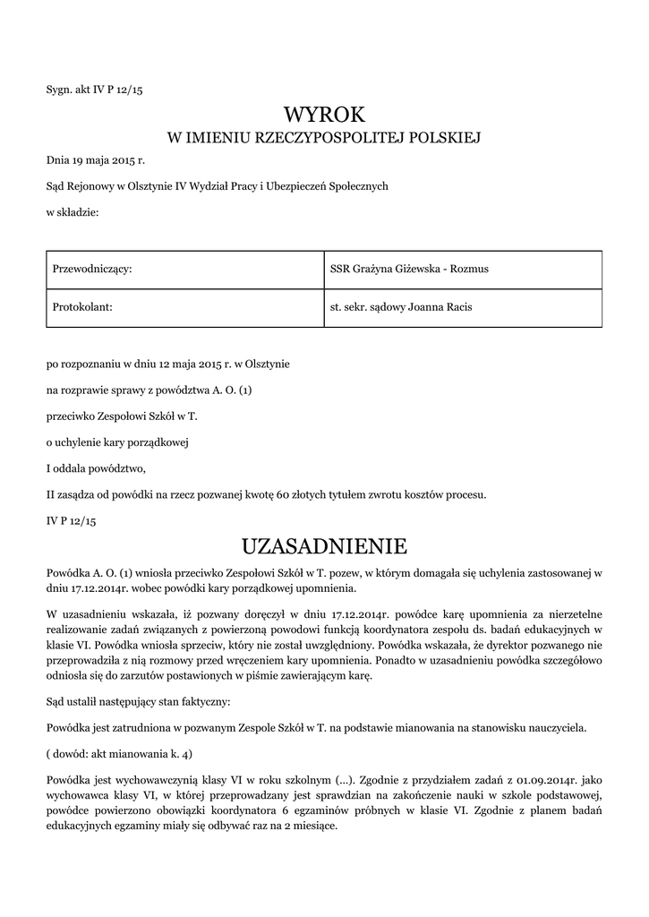 Sygn. akt IV P 12/15 WYROK W IMIENIU RZECZYPOSPOLITEJ POLSKIEJ Dnia 19 maja 2015 r. Sąd Rejonowy w Olsztynie IV Wydział Pracy i Ubezpieczeń Społecznych w składzie: Przewodniczący: SSR Grażyna Giżewska - Rozmus Protokolant: st. sekr. sądowy Joanna Racis po rozpoznaniu w dniu 12 maja 2015 r. w Olsztynie na rozprawie sprawy z powództwa A. O. (1) przeciwko Zespołowi Szkół w T. o uchylenie kary porządkowej I oddala powództwo, II zasądza od powódki na rzecz pozwanej kwotę 60 złotych tytułem zwrotu kosztów procesu. IV P 12/15 UZASADNIENIE Powódka A. O. (1) wniosła przeciwko Zespołowi Szkół w T. pozew, w którym domagała się uchylenia zastosowanej w dniu 17.12.2014r. wobec powódki kary porządkowej upomnienia. W uzasadnieniu wskazała, iż pozwany doręczył w dniu 17.12.2014r. powódce karę upomnienia za nierzetelne realizowanie zadań związanych z powierzoną powodowi funkcją koordynatora zespołu ds. badań edukacyjnych w klasie VI. Powódka wniosła sprzeciw, który nie został uwzględniony. Powódka wskazała, że dyrektor pozwanego nie przeprowadziła z nią rozmowy przed wręczeniem kary upomnienia. Ponadto w uzasadnieniu powódka szczegółowo odniosła się do zarzutów postawionych w piśmie zawierającym karę. Sąd ustalił następujący stan faktyczny: Powódka jest zatrudniona w pozwanym Zespole Szkół w T. na podstawie mianowania na stanowisku nauczyciela. ( dowód: akt mianowania k. 4) Powódka jest wychowawczynią klasy VI w roku szkolnym (...). Zgodnie z przydziałem zadań z 01.09.2014r. jako wychowawca klasy VI, w której przeprowadzany jest sprawdzian na zakończenie nauki w szkole podstawowej, powódce powierzono obowiązki koordynatora 6 egzaminów próbnych w klasie VI. Zgodnie z planem badań edukacyjnych egzaminy miały się odbywać raz na 2 miesiące. Powódka jako koordynator miała nadzorować i odpowiadać za prawidłowy przebieg sprawdzianów próbnych. W tym zakresie miała m.in. obowiązek powiadomienia uczniów o terminach egzaminów i zasadach obowiązujących przy pisaniu sprawdzianu, przygotować salę do egzaminu poprzez ustawienie stołów, zainstalowanie zegara , przyklejenie na stołach numerów P. uczniów, zdjęcie gazetek szkolnych. ( dowód: przydział zadań k. 16, plan badań k. 17, zeznania E. P. k. 46v-47, przesłuchanie M. S.-C. k. 49-50v) O próbnym sprawdzianie z dnia 17.12.2014r. powódka została poinformowana przez dyrektor pozwanego Zespołu w dniu 07.11.2014r. ( dowód: mail k. 18, przesłuchanie M. S.-C. k. 49-50v) W dniu 17.12.2014r. dyrektor pozwanego M. C. po przyjściu rano do pracy stwierdziła brak należytego przygotowania przez powódkę sali do sprawdzianu próbnego klasy VI. Powódka, która w tym dniu pełniła dyżur na parterze szkoły od godz. 7:30 zeszła z tego dyżuru bez informowania i uzgodnienia z dyrekcją lub znalezienia na swoje miejsce zastępstwa ( pozostał tylko 1 nauczyciel dyżurujący podczas gdy powinno być ich dwóch) i udała się na I piętro w celu przygotowania sali. Powódka przychodząc w tym dniu do szkoły nie pamiętała o zaplanowanym sprawdzianie próbnym. Około godz. 8:00 do sali przyszła dyrektor pozwanego dowiadując się od powódki co robi i nakazując jej udanie się na dyżur , który opuściła. Następnie, około godz. 9:00, dyrektor przyszła ponownie do sali donosząc wydrukowane arkusze, które nie zostały zabrane przez powódkę, i stwierdziła, że A. O. nie zdjęła wszystkich gazetek szklonych i mapy. Pozostały gazetki dotyczące historii prochu . Nie powiesiła także w sali zegara ponieważ nie zdążyła tego zrobić. Uczniowie przystępując do egzaminu posiadali długopisy z niebieskim wkładem podczas gdy powinni pisać długopisami z czarnym wkładem ponieważ takie są wymogi na egzaminie. Dyrektor przyniosła długopisy z odpowiednimi wkładami. Powódka dzień wcześniej nie była w pracy z powodu opieki nad dzieckiem. tym samym nie mogła powiadomić uczniów o egzaminie. W poprzedzającym ten dzień dniu również nie powiadomiła uczniów o egzaminie. Uczniowie klasy VI około tygodnia wcześniej zapisali się na wycieczkę szkolną- wyjazd do kina , który miał się odbyć właśnie 17.12.2014r. Zapisało się 9 uczniów z klasy VI ( która liczy 13 osób), a 7 wpłaciło na wyjazd. ( dowód: zeznania świadka E. P. (2) k. 46v-47) W dniu 17.12.2014r. dyrektor pozwanego wręczył powódce pismo zawierające karę upomnienia. Wskazano, iż kara jest udzielana za nierzetelne realizowanie zadań związanych z powierzeniem jej funkcji koordynatora zespołu ds. badań edukacyjnych w klasie VI. Z przeprowadzonej w dniu 17.12.2014r. rozmowy wynika, że powódka nie wywiązała się z powierzonych obowiązków: - nie poinformowała klasy, której jest wychowawczynią, o sprawdzianie próbnym, - nie przygotowała materiałów do przeprowadzenia testu próbnego z (...), - nie przygotowała sali do przeprowadzenia testu m.in. brak zegara, wiszące na ścianach gazetki, - nie zapoznała z procedurami sprawdzianu uczniów, - nie pełniła rzetelnie dyżuru śródlekcyjnego w tym dniu. ( dowód: kara upomnienia k. 6) Przed nałożeniem kary dyrektor pozwanego Zespołu przeprowadziła z powódką rozmowę zwracając się o wyjaśnienie stawianych zarzutów. ( dowód: notatka k. 14, zeznania M. D. k. 45-46, przesłuchanie M. S.-C. k. 49-50v) Powódka wniosła sprzeciw od nałożonej na nią kary. Pismem z dnia 22.12.2014r. odrzucono sprzeciw wniesiony przez powódkę . ( dowód: pismo k. 5,7) Nauczyciele przeprowadzający sprawdzian VI-tych klas przechodzą kursy w zakresie przygotowania tych egzaminów. Odbywają się także szkoleniowe rady pedagogiczne, na których dyrektor wyjaśnia obowiązki komisji egzaminacyjnej i nauczycieli. Wyjaśniane jest m.in., iż do zadań nauczyciela należy przygotowanie sali tj. tak aby uczniowie nie ściągali, przygotowanie zegara , zdjęcie tablic informacyjnych i gazetek ze ścian, oznaczenie stolików. 