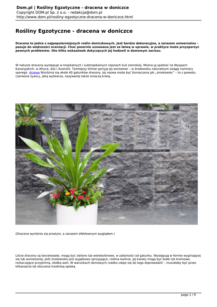 Dom.pl | Rośliny Egzotyczne - dracena w doniczce Copyright DOM.pl Sp. z o.o. - [email protected] http://www.dom.pl/rosliny-egzotyczne-dracena-w-doniczce.html Rośliny Egzotyczne - dracena w doniczce Dracena to jedna z najpopularniejszych roślin doniczkowych. Jest bardzo dekoracyjna, a zarazem uniwersalna – pasuje do większości aranżacji. Choć pozornie uznawana jest za łatwą w uprawie, w praktyce może przysporzyć pewnych problemów. Oto kilka wskazówek dotyczących jej hodowli w domowym zaciszu. W naturze dracena występuje w tropikalnych i subtropikalnych rejonach kuli ziemskiej. Można ją spotkać na Wyspach Kanaryjskich, w Afryce, Azji i Australii. Tamtejszy klimat sprzyja jej wzrostowi – w środowisku naturalnym osiąga rozmiary sporego drzewa. Wyróżnia się około 40 gatunków draceny. Jej nazwa może być tłumaczona jak „smokowiec” – to z powodu czerwone żywicy, jaką wytwarza, nazywanej także smoczą krwią. (Dracena wyróżnia się prostym, a zarazem efektownym wyglądem.) Liście draceny są lancetowate, mogą być zielone lub wielokolorowe, w zależności od gatunku. Występują w formie wyginającej się lub wzniesionej. Jeśli środowisko jest wyjątkowo sprzyjające, roślina kwitnie. Jej kwiaty mogą być białe lub kremowe, roztaczające przyjemną, słodką woń. W warunkach domowych rzadko udaje się do tego doprowadzić – musiałaby być przez kilkanaście lat otoczona troskliwą opieką. page 1 / 9 Dom.pl | Rośliny Egzotyczne - dracena w doniczce Copyright DOM.pl Sp. z o.o. - [email protected] http://www.dom.pl/rosliny-egzotyczne-dracena-w-doniczce.html (Poszczególne gatunki różnią się od siebie kształtem liści.) Dla draceny najlepiej przygotować jasne, dobrze oświetlone stanowisko. Najlepiej wybrać parapet okna po wschodniej lub zachodniej stronie domu. Do doniczki najlepiej wybierać lekką, próchniczą ziemię. Latem warto utrzymać ziemię w doniczce na stałym poziomie wilgotności, zimą natomiast podlewanie powinno się odbywać tylko wtedy, gdy ziemia całkowicie wyschnie. Nadmiar wody jest niewskazany, dlatego dobrym rozwiązaniem jest drenaż na dnie doniczki. page 2 / 9 Dom.pl | Rośliny Egzotyczne - dracena w doniczce Copyright DOM.pl Sp. z o.o. - [email protected] http://www.dom.pl/rosliny-egzotyczne-dracena-w-doniczce.html Mniej więcej co 2-3 lata wskazane jest przesadzanie rośliny. Jeśli chodzi o nawożenie, najlepiej sprawdzi się wieloskładnikowy nawóz do roślin egzotycznych. Podajemy go od wiosny do jesieni co kilka tygodni. W niektórych sklepach ogrodniczych można znaleźć także odżywki przeznaczone specjalnie dla dracen. Pamiętajmy o częstym zraszaniu liści wodą, gdyż suche powietrze zdecydowanie szkodzi roślinie – jej liście mogą zacząć schnąć i brunatnieć. Uschnięte fragmenty delikatnie obcinamy nożyczkami. page 3 / 9 Dom.pl | Rośliny Egzotyczne - dracena w doniczce Copyright DOM.pl Sp. z o.o. - [email protected] http://www.dom.pl/rosliny-egzotyczne-dracena-w-doniczce.html (Pielęgnacja draceny nie jest trudna, należy jednak ścśle przetrzegać jej zasad.) Znakiem, że pielęgnacja draceny nie jest prowadzona prawidłowo może być pojawienie się szkodników. Bardzo często zdarza się, że atakują ją przędziorki, czerwce i wciornastki. Jeśli zauważymy, ze pędy nagle się wydłużają i zmieniają barwę na ciemniejszą (lub przeciwnie – tracą kolor), może to być sygnałem, ze roślina ma zbyt mało światła. Zobacz także: page 4 / 9 Dom.pl | Rośliny Egzotyczne - dracena w doniczce Copyright DOM.pl Sp. z o.o. - [email protected] http://www.dom.pl/rosliny-egzotyczne-dracena-w-doniczce.html Rośliny Egzotyczne w domu - juka (Wyróżniamy około 40 gatunków draceny, różnią się od siebie między innymi rozmiarami.) Juka to jedna z najbardziej znanych i lubianych roślin doniczkowych. Jej charakterystyczny wygląd sprawia, że świetnie wpasowuje się w nowoczesne aranżacje wnętrz. Ponadto jest niedroga i łatwa w pielęgnacji, stosunkowo łatwe jest też jej rozmnażanie. Oto kilka porad dotyczących uprawy juki w doniczce Rośliny Egzotyczne – męczennica, czyli passiflora Męczennica to roślina, która swą wielką popularność zawdzięcza nietypowym i efektownym kształtom kwiatów. W domu możemy ją uprawiać przez cały rok, jeśli zatem szukamy oryginalnej ozdoby wnętrza, warto się na nią zdecydować. Rośliny Egzotyczne – niedośpian Niedośpian to roślina dosyć niewielka i mało kłopotliwa – to właśnie sprawiło, że uzyskała olbrzymią popularność w uprawie doniczkowej. Zazwyczaj umieszcza się ją w witrynach oraz zamkniętych oknach kwiatowych. page 5 / 9 Dom.pl | Rośliny Egzotyczne - dracena w doniczce Copyright DOM.pl Sp. z o.o. - [email protected] http://www.dom.pl/rosliny-egzotyczne-dracena-w-doniczce.html page 6 / 9 Dom.pl | Rośliny Egzotyczne - dracena w doniczce Copyright DOM.pl Sp. z o.o. - [email protected] http://www.dom.pl/rosliny-egzotyczne-dracena-w-doniczce.html page 7 / 9 Dom.pl | Rośliny Egzotyczne - dracena w doniczce Copyright DOM.pl Sp. z o.o. - [email protected] http://www.dom.pl/rosliny-egzotyczne-dracena-w-doniczce.html Dekoracja łazienki: jakie kwiaty doniczkowe wybrać do łazienki? Dekoracja łazienki to nie tylko atrakcyjne akcesoria łazienkowe i kolorowe ręczniki. Warto zdecydować się również na kwiaty w łazience, które nie tylko staną się piękną ozdobą wnętrza, ale również ocieplą jego sterylny charakter. page 8 / 9 Dom.pl | Rośliny Egzotyczne - dracena w doniczce Copyright DOM.pl Sp. z o.o. - [email protected] http://www.dom.pl/rosliny-egzotyczne-dracena-w-doniczce.html