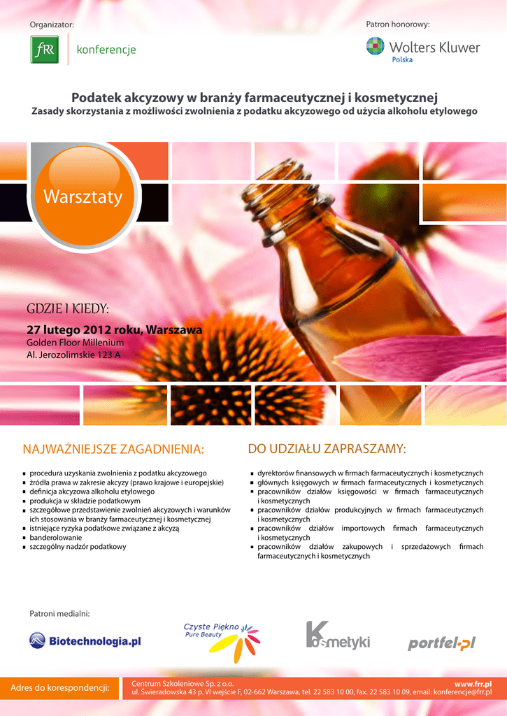 Patron honorowy: Organizator: konferencje Podatek akcyzowy w branży farmaceutycznej i kosmetycznej Zasady skorzystania z możliwości zwolnienia z podatku akcyzowego od użycia alkoholu etylowego Warsztaty GDZIE I KIEDY: 27 lutego 2012 roku, Warszawa Golden Floor Millenium Al. Jerozolimskie 123 A NAJWAŻNIEJSZE ZAGADNIENIA: procedura uzyskania zwolnienia z podatku akcyzowego źródła prawa w zakresie akcyzy (prawo krajowe i europejskie) definicja akcyzowa alkoholu etylowego produkcja w składzie podatkowym szczegółowe przedstawienie zwolnień akcyzowych i warunków ich stosowania w branży farmaceutycznej i kosmetycznej istniejące ryzyka podatkowe związane z akcyzą banderolowanie szczególny nadzór podatkowy DO UDZIAŁU ZAPRASZAMY: dyrektorów finansowych w firmach farmaceutycznych i kosmetycznych głównych księgowych w firmach farmaceutycznych i kosmetycznych pracowników działów księgowości w firmach farmaceutycznych i kosmetycznych pracowników działów produkcyjnych w firmach farmaceutycznych i kosmetycznych pracowników działów importowych firmach farmaceutycznych i kosmetycznych pracowników działów zakupowych i sprzedażowych firmach farmaceutycznych i kosmetycznych Patroni medialni: Adres do korespondencji: Centrum Szkoleniowe Sp. z o.o. www.frr.pl ul. Świeradowska 43 p. VI wejście F, 02-662 Warszawa, tel. 22 583 10 00, fax. 22 583 10 09, email: [email protected] konferencje Podatek akcyzowy w branży farmaceutycznej i kosmetycznej Zasady skorzystania z możliwości zwolnienia z podatku akcyzowego od użycia alkoholu etylowego Warsztaty Warszawa 27.02.2012 r. Szanowni Państwo, Alkohole są nie tylko używane jako surowiec, lecz również do celów okołoprodukcyjnych, np. do czyszczenia i dezynfekcji linii i pomieszczeń. Możliwość zastosowania wyłączenia spod opodatkowania – zwolnienia od akcyzy – zużywanych w powyższych celach alkoholi może więc w znacznym stopniu przyczynić się do ograniczenia kosztów produkcyjnych. W wielu jednak przypadkach, aby akcyza nie była płacona, konieczne jest spełnienie określonych warunków formalnych. Dlatego też Centrum Szkoleniowe Sp. z o.o. – firma należąca do Grupy Fundacji Rozwoju Rachunkowości w Polsce, organizuje warsztat „Podatek akcyzowy w branży farmaceutycznej i kosmetycznej. Zasady skorzystania z możliwości zwolnienia z podatku akcyzowego od użycia alkoholu etylowego”. Warsztat odbędzie się 27 lutego 2012 roku w Warszawie w Golden Floor Millenium, Al. Jerozolimskie 123 A. Udział w warsztacie pomoże Państwu zapoznać się z warunkami korzystania z możliwych do zastosowania w Państwa działalności zwolnień akcyzowych oraz wskaże sposoby uniknięcia istniejących ryzyk podatkowych. Korzyści z udziału w warsztacie: pogłębienie wiedzy w zakresie procedur uzyskiwania zwolnienia z podatku akcyzowego od użycia alkoholu etylowego w branży farmaceutycznej i kosmetycznej poznanie zasad, które przyspieszają uzyskanie zwolnienia z podatku akcyzowego od użycia alkoholu etylowego w branży farmaceutycznej i kosmetycznej usprawnienie procesu kompletowania wymaganej dokumentacji okazja do wymiany doświadczeń z przedstawicielami z branży farmaceutycznej i kosmetycznej możliwość uzyskania pomocy w wyjaśnieniu wątpliwości proceduralnych Liczymy, iż zaprezentowana podczas warsztatu tematyka ułatwi przygotowanie Państwa przedsiębiorstw do skorzystania ze zwolnień od podatku akcyzowego, wpływając tym samym na ograniczenie kosztów produkcyjnych i prężny rozwój Państwa działalności. Adres do korespondencji: Z poważaniem, Emilia Nurzyńska Menedżer Projektu [email protected] Centrum Szkoleniowe Sp. z o.o. www.frr.pl ul. Świeradowska 43 p. VI wejście F, 02-662 Warszawa, tel. 22 583 10 00, fax. 22 583 10 09, email: [email protected] konferencje Podatek akcyzowy w branży farmaceutycznej i kosmetycznej Zasady skorzystania z możliwości zwolnienia z podatku akcyzowego od użycia alkoholu etylowego Warsztaty Warszawa 27.02.2012 r. Program: 08:45-09:15 Rejestracja, powitalna kawa 09:15-10:30 Wprowadzenie do kwestii akcyzowych Źródła prawa w zakresie akcyzy (prawo krajowe i europejskie) Cechy charakterystyczne opodatkowania akcyzą: jednokrotność wąski zakres przedmiotowy procedura zawieszonego poboru podatku akcyzowego Definiowanie alkoholu przez przepisy akcyzowe Definicja krajowa Definicja europejska 10:30-10:45 Przerwa kawowa 10:45-12:15 Produkcja w składzie podatkowym Instytucja składu podatkowego – możliwość czy obowiązek Zużycie alkoholu do produkcji w składzie podatkowym Prawo do obniżenia należnej akcyzy Katalog zwolnień akcyzowych Przedstawienie wszystkich zwolnień jakie mogą być stosowane w branży farmaceutycznej i kosmetycznej Omówienie warunków koniecznych do skutecznego stosowania zwolnień Wskazanie ryzyk podatkowych związanych ze stosowaniem poszczególnych zwolnień 12:15-12:30 Przerwa kawowa Pozostałe kwestie Banderolowanie Szczególny nadzór podatkowy Panel dyskusyjny 13:00 Zakończenie warsztatów, rozdanie certyfikatów uczestnictwa 13:15 Lunch Adres do korespondencji: Centrum Szkoleniowe Sp. z o.o. www.frr.pl ul. Świeradowska 43 p. VI wejście F, 02-662 Warszawa, tel. 22 583 10 00, fax. 22 583 10 09, email: [email protected] konferencje Podatek akcyzowy w branży farmaceutycznej i kosmetycznej Zasady skorzystania z możliwości zwolnienia z podatku akcyzowego od użycia alkoholu etylowego Warsztaty Warszawa 27.02.2012 r. Warsztat poprowadzi: Teresa Sławińska-Choryło Prawnik, doradca podatkowy, Tax manager w firmie PETROLOT Sp. z o.o.. Ukończyła z wyróżnieniem Wydział Prawa i Administracji Uniwersytetu Warszawskiego a także Podyplomowe Studium Podatków i Prawa Podatkowego na Uniwersytecie Warszawskim. Specjalizuje się w opodatkowaniu VAT i akcyzą, w szczególności w branży alkoholowej, paliwowej, energetycznej. Ma ponad 10-letnie doświadczenie w doradztwie podatkowym. Realizowała liczne projekty związ
