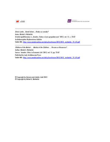 Dzieci rynku... Rynek dzieci... Osoby czy zasoby? Autor: Michał A. Michalski Artykuł opublikowany w „Annales. Etyka w życiu gospodarczym” 2012, vol. 15, s. 73-87 Archidiecezjalne Wydawnictwo Łódzkie Stable URL: http://www.annalesonline.uni.lodz.pl/archiwum/2012/2012_michalski_73_87.pdf Children of the Market… Market of the Children… Persons or Resources? Author: Michał A. Michalski Source: ‘Annales. Ethics in Economic Life’ 2012, vol. 15, pp. 73-87 Published by Lodz Archdiocesan Press Stable URL: http://www.annalesonline.uni.lodz.pl/archiwum/2012/2012_michalski_73_87.pdf © Copyright by Uniwersytet Łódzki, Łódź 2012 © Copyright by Michał A. Michalski Michał A. Michalski Uniwersytet im. A. Mickiewicza w Poznaniu e-mail: [email protected] Dzieci rynku... Rynek dzieci... Osoby czy zasoby? 1. Wprowadzenie W artykule niniejszym zostaje podjęta refleksja nad statusem dziecka w kontekście aktualnych zjawisk obecnych w kulturze i społeczeństwie, które znajdują także swe odbicie w jednej ze sfer społecznego działania, jaką jest rynek. Wydawać by się mogło, że nie jest to obszar, którego istotnymi uczestnikami są dzieci, gdyż działania rynkowe, takie jak praca, produkcja, dystrybucja i konsumpcja dotyczą przede wszystkim i bezpośrednio ludzi dorosłych. Chociaż zwraca się uwagę na takie kwestie jak wpływ reklamy na dzieci oraz ich udział w podejmowaniu decyzji o zakupie określonych towarów, to zakres problemów dotyczących relacji pomiędzy funkcjonowaniem rynku a ludźmi będącymi w fazie dzieciństwa jest o wiele szerszy. Problemy podjęte w niniejszym artykule – jak sugeruje jego tytuł - dotyczą dwóch grup problemów. Pierwsza to wpływ funkcjonowania rynku na dzieci jako członków rodzin i społeczeństwa ogółem. Należy tu postawić pytanie o to, czy dziecko może – i powinno – być traktowane tak, jak każdy inny konsument, wobec którego współczesna praktyka marketingowa podejmuje rozmaite – nierzadko kontrowersyjne – działania. Druga część problemów związana jest z traktowaniem dzieci w sposób uprzedmiotawiający, czego wyrazem jest zawarte w tytule sformułowanie „rynek dzieci”. Zarówno pierwsza, jak i druga grupa zagadnień stanowi bodziec do przeanalizowania sposobu rozumienia oraz pozycji jaką zajmuje w społeczeństwie dziecko, czyli człowiek w szczególnej – pod wieloma względami – fazie swego rozwoju. 2. Małżeństwo – Rodzina – Dzieciństwo Rozpoczynając refleksję nad sytuacją dziecka w kontekście systemu rynkowego należy spojrzeć na kontekst, w którym dziecko przychodzi na świat. Co więcej, nie można podejmować refleksji nad człowiekiem jako dzieckiem tak, jakby było ono bytem niezależnym i samowystarczalnym. Jest ono – jak każda osoba ludzka – ograniczone. Wydaje się, że dziś ograniczenia coraz częściej bywają traktowane jako zło, z którego należy się wyzwolić. Ten punkt widzenia – charakterystyczny dla myślenia ponowoczesnego – bardzo trafnie demaskuje Chantal Delsol. Pisze ona, że to „utopie opierały się na micie samokreacji, samougruntowania, samowystarczalności człowieka, który może stworzyć MICHAŁ A. MICHALSKI 74 siebie od nowa, usunąwszy wszelkie dziedzictwo. Twierdziły one, że o człowieku nie można niczego powiedzieć”1. Autorka ta wskazuje, że granice potrzebne są człowiekowi, gdyż nadają mu imię i określają jego tożsamość – „imieniem jestestwa jest to, co je wyróżnia, a tym samym ogranicza”2. Rodzina – która ma swe granice – stanowi naturalne środowisko dla dziecka, współokreślając jego tożsamość i wyznaczając zarazem bezpieczną przestrzeń dla jego rozwoju. żaden z członków rodziny nie bierze się znikąd, a to oznacza, że w osobowość każdego człowieka wpisana jest niepowtarzalna historia jego przyjścia na świat. Życie rodzinne jest więc ludzkim sposobem egzystowania, który ma swoje określone prawa. Oznacza to, że tak, jak nie ma dziecka bez matki, tak też nie ma dziecka bez ojca. Tu niejako jedno wynika z drugiego. Analogicznie też można powiedzieć, że nie ma ojca bez dziecka, i nie ma matki bez dziecka. Widać tu wzajemne oddziaływanie rodziców i dzieci na siebie. To rodzice powołują dziecko do życia – choć tego życia mu nie dają, a nikt inny, jak właśnie dziecko czyni kobietę matką, a mężczyznę ojcem3. Życie rodzinne toczy się równocześnie we wszystkich wymiarach ludzkiego życia. Jest doświadczeniem zarówno cielesnym, psychicznym, jak i duchowym. Co więcej, na każdym z tych poziomów rodzina, i żyjący w niej człowiek, napotyka rozmaite ograniczenia, które zawsze – choć zapewne z różnym nasileniem – stanowiły przedmiot dyskusji: dla jednych były przedmiotem afirmacji, przez drugich – kontestacji. Wydaje się jednak, że aż do tzw. nowoczesności w kulturze Zachodu dominował szacunek dla obiektywnych praw życia ludzkiego, któremu towarzyszyło przekonanie, że sam człowiek nie jest architektem swej natury, i z tego względu nie może jej projektować, a więc także z nią eksperymentować. Fundamentalną częścią natury każdej osoby ludzkiej są jej narodziny, będące wyraźnym znakiem tego, że nowy człowiek przyszedł na świat. W swej pracy Przyszłość natury ludzkiej. Czy zmierzamy do eugeniki liberalnej? Jürgen Habermas rozważa związane z tym kwestie. Stwierdzając, że „własną wolność przeżywa się w odniesieniu do czegoś, czym z natury nie można rozporządzać”4, zwraca uwagę, że urodzenie się – będące dla każdego człowieka swoistym początkiem – jest takim właśnie faktem5. Fakt niepowtarzalności ludzkiego życia, który Habermas określa mianem „bycia sobą” „wymaga jakiegoś punktu odniesienia poza wątkami tradycji i układami interakcji, przynależnymi do procesu edukacji, w którym dopiero formuje się osobowa tożsamość biograficzna”6. We współczesnych próbach ek