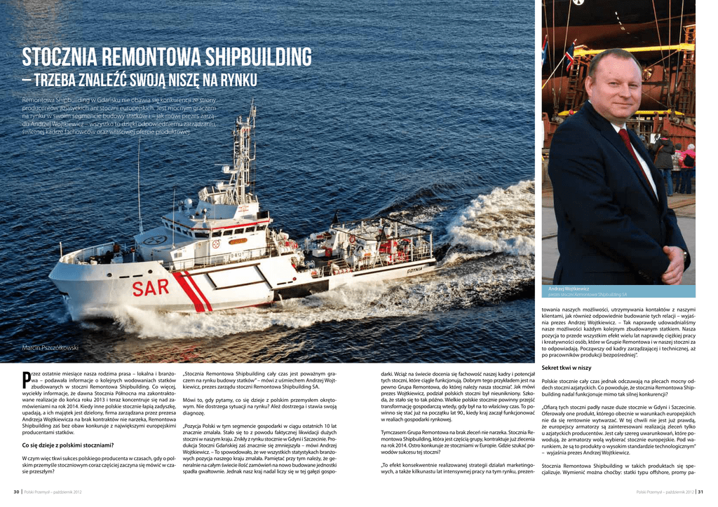 Stocznia Remontowa Shipbuilding – trzeba znaleźć swoją niszę na rynku Remontowa Shipbuilding w Gdańsku nie obawia się konkurencji ze strony producentów azjatyckich ani stoczni europejskich. Jest mocnym graczem na rynku w swoim segmencie budowy statków i – jak mówi prezes zarządu Andrzej Wojtkiewicz – wszystko to dzięki odpowiedniemu zarządzaniu, świetnej kadrze fachowców oraz właściwej ofercie produktowej. Andrzej Wojtkiewicz prezes stoczni Remontowa Shipbuilding SA towania naszych możliwości, utrzymywania kontaktów z naszymi klientami, jak również odpowiednie budowanie tych relacji – wyjaśnia prezes Andrzej Wojtkiewicz. – Tak naprawdę udowadnialiśmy nasze możliwości każdym kolejnym zbudowanym statkiem. Nasza pozycja to przede wszystkim efekt wielu lat naprawdę ciężkiej pracy i kreatywności osób, które w Grupie Remontowa i w naszej stoczni za to odpowiadają. Począwszy od kadry zarządzającej i technicznej, aż po pracowników produkcji bezpośredniej”. Marcin Pszczółkowski P rzez ostatnie miesiące nasza rodzima prasa – lokalna i branżowa – podawała informacje o kolejnych wodowaniach statków zbudowanych w stoczni Remontowa Shipbuilding. Co więcej, wyciekły informacje, że dawna Stocznia Północna ma zakontraktowane realizacje do końca roku 2013 i teraz koncentruje się nad zamówieniami na rok 2014. Kiedy inne polskie stocznie łapią zadyszkę, upadają, a ich majątek jest dzielony, firma zarządzana przez prezesa Andrzeja Wojtkiewicza na brak kontraktów nie narzeka, Remontowa Shipbuilding zaś bez obaw konkuruje z największymi europejskimi producentami statków. Co się dzieje z polskimi stoczniami? W czym więc tkwi sukces polskiego producenta w czasach, gdy o polskim przemyśle stoczniowym coraz częściej zaczyna się mówić w czasie przeszłym? 30 | Polski Przemysł – październik 2012 „Stocznia Remontowa Shipbuilding cały czas jest poważnym graczem na rynku budowy statków” – mówi z uśmiechem Andrzej Wojtkiewicz, prezes zarządu stoczni Remontowa Shipbuilding SA. Mówi to, gdy pytamy, co się dzieje z polskim przemysłem okrętowym. Nie dostrzega sytuacji na rynku? Ależ dostrzega i stawia swoją diagnozę. „Pozycja Polski w tym segmencie gospodarki w ciągu ostatnich 10 lat znacznie zmalała. Stało się to z powodu faktycznej likwidacji dużych stoczni w naszym kraju. Znikły z rynku stocznie w Gdyni i Szczecinie. Produkcja Stoczni Gdańskiej zaś znacznie się zmniejszyła – mówi Andrzej Wojtkiewicz. – To spowodowało, że we wszystkich statystykach branżowych pozycja naszego kraju zmalała. Pamiętać przy tym należy, że generalnie na całym świecie ilość zamówień na nowo budowane jednostki spadła gwałtownie. Jednak nasz kraj nadal liczy się w tej gałęzi gospo- darki. Wciąż na świecie docenia się fachowość naszej kadry i potencjał tych stoczni, które ciągle funkcjonują. Dobrym tego przykładem jest na pewno Grupa Remontowa, do której należy nasza stocznia”. Jak mówi prezes Wojtkiewicz, podział polskich stoczni był nieunikniony. Szkoda, że stało się to tak późno. Wielkie polskie stocznie powinny przejść transformację gospodarczą wtedy, gdy był na to właściwy czas. To powinno się stać już na początku lat 90., kiedy kraj zaczął funkcjonować w realiach gospodarki rynkowej. Sekret tkwi w niszy Polskie stocznie cały czas jednak odczuwają na plecach mocny oddech stoczni azjatyckich. Co powoduje, że stocznia Remontowa Shipbuilding nadal funkcjonuje mimo tak silnej konkurencji? Tymczasem Grupa Remontowa na brak zleceń nie narzeka. Stocznia Remontowa Shipbuilding, która jest częścią grupy, kontraktuje już zlecenia na rok 2014. Ostro konkuruje ze stoczniami w Europie. Gdzie szukać powodów sukcesu tej stoczni? „Ofiarą tych stoczni padły nasze duże stocznie w Gdyni i Szczecinie. Oferowały one produkt, którego obecnie w warunkach europejskich nie da się rentownie wytwarzać. W tej chwili nie jest już prawdą, że europejscy armatorzy są zainteresowani realizacją zleceń tylko u azjatyckich producentów. Jest cały szereg uwarunkowań, które powodują, że armatorzy wolą wybierać stocznie europejskie. Pod warunkiem, że są to produkty o wysokim standardzie technologicznym” – wyjaśnia prezes Andrzej Wojtkiewicz. „To efekt konsekwentnie realizowanej strategii działań marketingowych, a także kilkunastu lat intensywnej pracy na tym rynku, prezen- Stocznia Remontowa Shipbuilding w takich produktach się specjalizuje. Wymienić można choćby: statki typu offshore, promy paPolski Przemysł – październik 2012 | 31 PBUCH S.A. 81-963 Gdynia, Hutnicza 4 Tel. (58)669 57 32 E-mail: [email protected] www.pbuch.com.pl Oferta produkcyjna PBUCH S.A.: • Urządzenia chłodnicze • Wymienniki ciepła • Zbiorniki ciśnieniowe do: ◦ dwutlenku węgla, ◦ ropy, ◦ gazów, ◦ czynników chłodniczych, ◦ amoniaku • Komory hiperbaryczne • Aparatura procesowa • Zespoły hydroforowe • Systemy do przesyłu materiałów sypkich sażersko-samochodowe, holowniki portowe i pełnomorskie, statki towarowe (do transportu gazu LNG/LPG/LEG, kontenerowce), statki specjalistyczne i wojskowe (wielofunkcyjne stawiacze boi, łodzie patrolowe, statki hydrograficzne oraz naukowo-badawcze). Statki i okręty zbudowane w stoczni pływają pod banderami: Danii, Finlandii, Gibraltaru, Niemiec, Norwegii, Vanuatu, Wielkiej Brytanii, Włoch oraz Polski. Za sukcesem stoczni Remontowa Shipbuilding stoi jednak ciężka, mozolna i długoletnia praca zatrudnionych w niej ludzi. „To przede wszystkim zasługa naszych wieloletnich kontaktów handlowych, efekt naszej obecności na rynku. Jesteśmy firmą znaną w Europie. Nasi przedstawiciele są w stałym kontakcie z wieloma armatorami i cały czas rozmawiamy o kolejnych zleceniach” – mówi prezes Wojtkiewicz. Dobra marka Remontowa Stoczni kierowanej przez prezesa Andrzeja Wojtkiewicza niewątpliwie pomogł