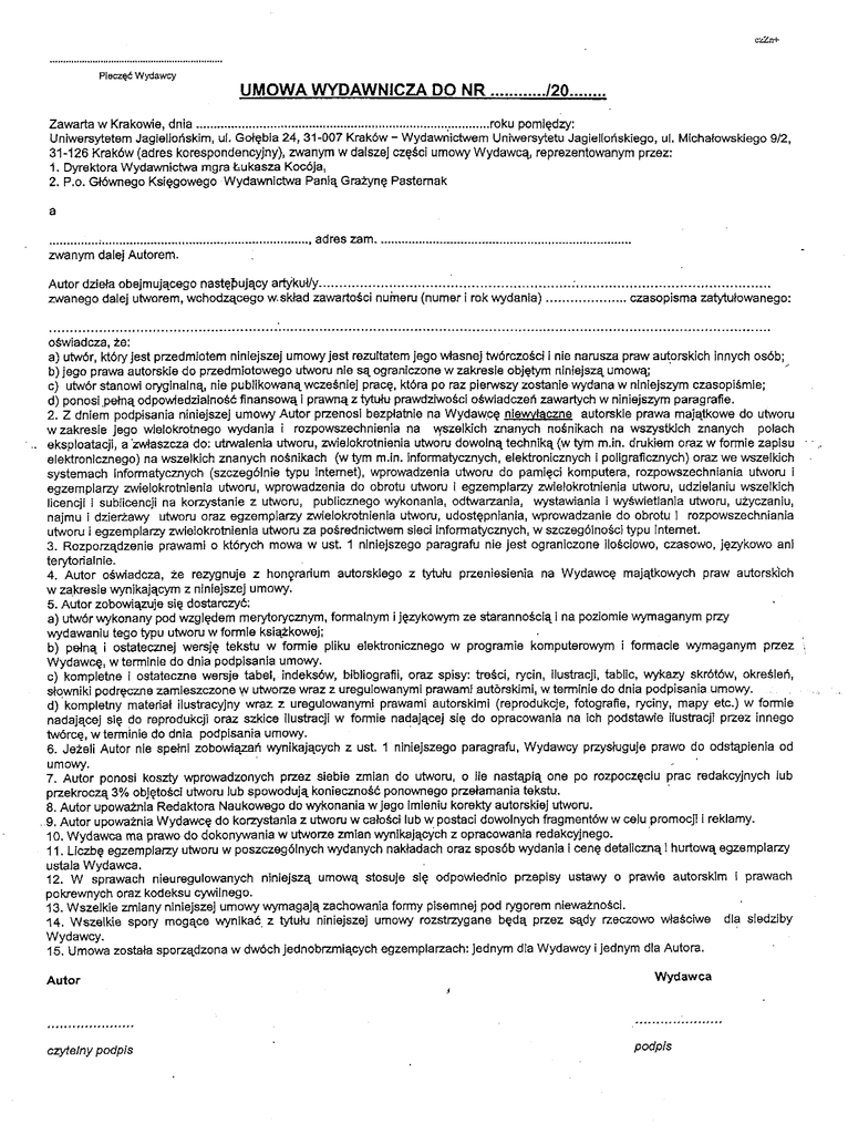 15. Umowa zostate sporza.dzona w dwdch jednobrzmia.cych egzemplarzach: jednym dla Wydawcy i jednym dla Autora,