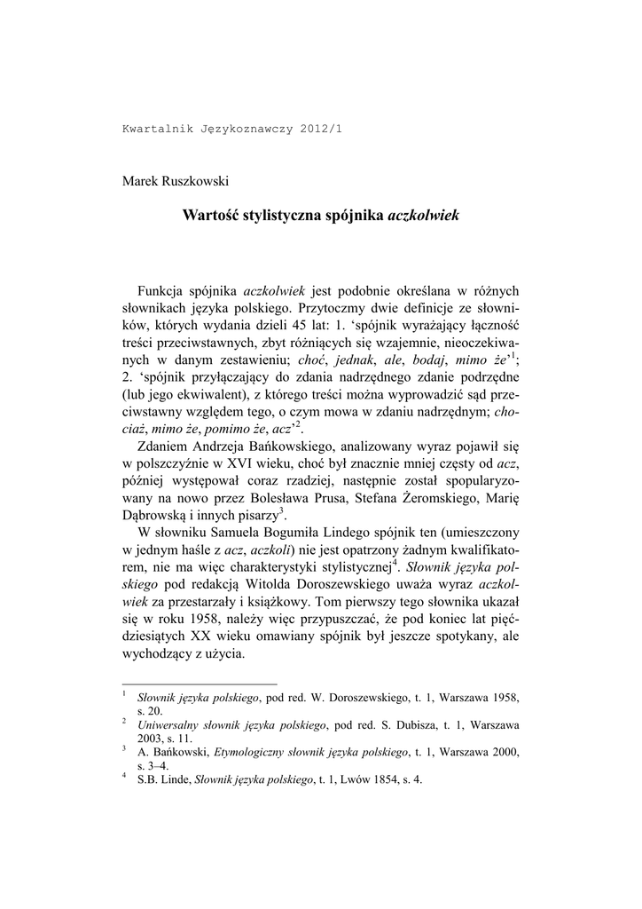 Kwartalnik Językoznawczy 2012/1 Marek Ruszkowski Wartość stylistyczna spójnika aczkolwiek Funkcja spójnika aczkolwiek jest podobnie określana w różnych słownikach języka polskiego. Przytoczmy dwie definicje ze słowników, których wydania dzieli 45 lat: 1. ‘spójnik wyrażający łączność treści przeciwstawnych, zbyt różniących się wzajemnie, nieoczekiwanych w danym zestawieniu; choć, jednak, ale, bodaj, mimo że’1; 2. ‘spójnik przyłączający do zdania nadrzędnego zdanie podrzędne (lub jego ekwiwalent), z którego treści można wyprowadzić sąd przeciwstawny względem tego, o czym mowa w zdaniu nadrzędnym; chociaż, mimo że, pomimo że, acz’2. Zdaniem Andrzeja Bańkowskiego, analizowany wyraz pojawił się w polszczyźnie w XVI wieku, choć był znacznie mniej częsty od acz, później występował coraz rzadziej, następnie został spopularyzowany na nowo przez Bolesława Prusa, Stefana Żeromskiego, Marię Dąbrowską i innych pisarzy3. W słowniku Samuela Bogumiła Lindego spójnik ten (umieszczony w jednym haśle z acz, aczkoli) nie jest opatrzony żadnym kwalifikatorem, nie ma więc charakterystyki stylistycznej4. Słownik języka polskiego pod redakcją Witolda Doroszewskiego uważa wyraz aczkolwiek za przestarzały i książkowy. Tom pierwszy tego słownika ukazał się w roku 1958, należy więc przypuszczać, że pod koniec lat pięćdziesiątych XX wieku omawiany spójnik był jeszcze spotykany, ale wychodzący z użycia. 1 2 3 4 Słownik języka polskiego, pod red. W. Doroszewskiego, t. 1, Warszawa 1958, s. 20. Uniwersalny słownik języka polskiego, pod red. S. Dubisza, t. 1, Warszawa 2003, s. 11. A. Bańkowski, Etymologiczny słownik języka polskiego, t. 1, Warszawa 2000, s. 3–4. S.B. Linde, Słownik języka polskiego, t. 1, Lwów 1854, s. 4. Marek Ruszkowski, Wartość stylistyczna spójnika aczkolwiek 94 W słownikach języka polskiego pod redakcją Mieczysława Szymczaka, Mirosława Bańki, Stanisława Dubisza nie jest traktowany jako przestarzały, tylko książkowy5. Podobnie w niektórych słownikach synonimów6 oraz ortoepicznych7. Jednak kwalifikator książkowy nie jest jednakowo rozumiany: 1) kwalifikator książk. odnosi się do wyrazów „używanych w pisemnictwie a nabierających zabarwienia nieco patetycznego w mowie potocznej”8; 2) „jako książkowe kwalifikowane są jednostki dość zróżnicowane, których cechą wspólną jest to, że występują zwykle w pisanej odmianie języka lub w starannych wypowiedziach mówionych”9; 3) kwalifikator ten dotyczy „jednostek słownikowych, których rozumienie i stosowanie wymaga przygotowania intelektualnego i kompetencji językowej większych niż te, które stanowią motywację używania słownictwa podstawowego. Można zatem przyjąć, że kwalifikator książk. odnosi się do tego podzbioru słownictwa, które charakteryzuje wypowiedzi osób należących do warstwy inteligencji humanistycznej”10. Tak więc według jednych językoznawców wyraz książkowy to taki, który występuje tylko w tekstach pisanych, według innych – również w starannych wypowiedziach mówionych, jeszcze inni odnoszą kwalifikator książkowy do jednostek językowych używanych przez inteli- 5 6 7 8 9 10 Słownik języka polskiego, pod red. M. Szymczaka, wyd. 9, t. 1, Warszawa 1994, s. 7; Inny słownik języka polskiego, pod red. M. Bańki, t. 1, Warszawa 2000, s. 5; Uniwersalny słownik języka polskiego, t. 1, op.cit., s. 11. Np. G. Dąbkowski, M. Marcjanik, Popularny słownik synonimów i antonimów, Warszawa 2002, s. 2. Słownik poprawnej polszczyzny, pod red. W. Doroszewskiego, Warszawa 1973, s. 3; Wielki słownik poprawnej polszczyzny PWN, pod red. A. Markowskiego, Warszawa 2010, s. 4. Słownik języka polskiego, pod red. W. Doroszewskiego, t. 1, op.cit., s. XL. Inny słownik języka polskiego, t. 1, op.cit., s. XXV. Uniwersalny słownik języka polskiego, t. 1, op.cit., s. XL–XLI. Marek Ruszkowski, Wartość stylistyczna spójnika aczkolwiek 95 gencję humanistyczną. Ostatnia interpretacja nie ma związku z podziałem tekstów na mówione i pisane. W słowniku pod redakcją Bogusława Dunaja analizowany spójnik jest traktowany jako oficjalny11. Należy przyjąć, że zgodnie z charakterystyką leksykograficzną aczkolwiek nie jest obecnie spójnikiem przestarzałym (jak go kwalifikował słownik Doroszewskiego), tylko książkowym i oficjalnym, czyli takim, którego zakres występowania ogranicza się do niepotocznych tekstów pisanych oraz do oficjalnych mówionych. Przynależy zatem do stylu intelektualnego. Nic więc dziwnego, że jego występowanie w codziennej komunikacji językowej budzi zastrzeżenia językoznawców: Dziś szerzy się manierycznie, także w mowie potocznej (znamionując styl lichy a pretensjonalny)12. Wyraz używany w języku oficjalnym, niepotrzebny w języku codziennym13. Spójnik aczkolwiek raczej nie powinien pojawiać się w sytuacjach potocznych, jest bowiem charakterystyczny dla wypowiedzi oficjalnych czy podniosłych14. Niektórzy badacze zwracają uwagę na jego zbyt dużą frekwencję w stylu dziennikarskim: „Wyraz nadużywany w stylu dziennikarskim, używany niepotrzebnie zamiast neutralnych: chociaż, mimo że, jednak”15. Do spójników synonimicznych wobec aczkolwiek, oprócz wymienionych, należy zaliczyć: wprawdzie, choć, jakkolwiek, wszakże, skądinąd, mimo wszystko, pomimo że, pomimo iż oraz przestarzałe acz i atoli16. Mają one jednak różną wartość stylistyczną. 11 12 13 14 15 16 Słownik współczesnego języka polskiego, pod red. B. Dunaja, t. 1, Warszawa 1998, s. 2. A. Bańkowski, op.cit., s. 4. A. Markowski, Popularny słownik poprawnej polszczyzny, Warszawa 2001, s. 2. J. Miodek, Słownik ojczyzny polszczyzny, oprac. M. Zaśko-Zielińska, T. Piekot, Wrocław 2005, s. 19. Wielki słownik poprawnej polszczyzny PWN, op.cit., s. 4. W. Broniarek, Gdy Ci słowa zabraknie. Słownik synonimów, Warszawa 2005, s. 8. Marek 