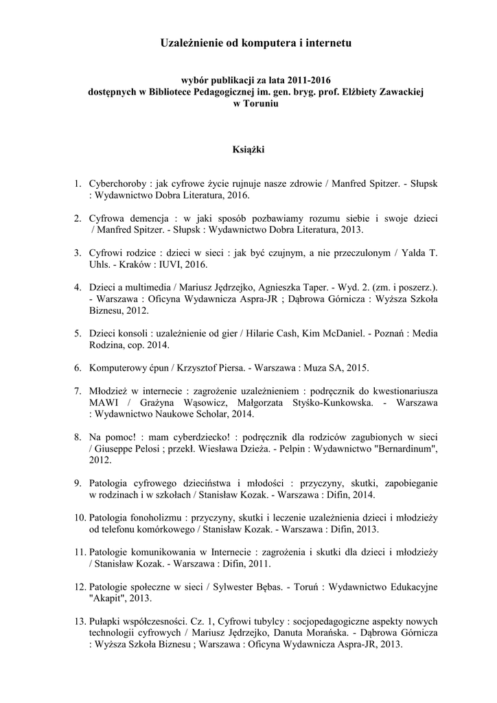 Uzależnienie od komputera i internetu wybór publikacji za lata 2011-2016 dostępnych w Bibliotece Pedagogicznej im. gen. bryg. prof. Elżbiety Zawackiej w Toruniu Książki 1. Cyberchoroby : jak cyfrowe życie rujnuje nasze zdrowie / Manfred Spitzer. - Słupsk : Wydawnictwo Dobra Literatura, 2016. 2. Cyfrowa demencja : w jaki sposób pozbawiamy rozumu siebie i swoje dzieci / Manfred Spitzer. - Słupsk : Wydawnictwo Dobra Literatura, 2013. 3. Cyfrowi rodzice : dzieci w sieci : jak być czujnym, a nie przeczulonym / Yalda T. Uhls. - Kraków : IUVI, 2016. 4. Dzieci a multimedia / Mariusz Jędrzejko, Agnieszka Taper. - Wyd. 2. (zm. i poszerz.). - Warszawa : Oficyna Wydawnicza Aspra-JR ; Dąbrowa Górnicza : Wyższa Szkoła Biznesu, 2012. 5. Dzieci konsoli : uzależnienie od gier / Hilarie Cash, Kim McDaniel. - Poznań : Media Rodzina, cop. 2014. 6. Komputerowy ćpun / Krzysztof Piersa. - Warszawa : Muza SA, 2015. 7. Młodzież w internecie : zagrożenie uzależnieniem : podręcznik do kwestionariusza MAWI / Grażyna Wąsowicz, Małgorzata Styśko-Kunkowska. - Warszawa : Wydawnictwo Naukowe Scholar, 2014. 8. Na pomoc! : mam cyberdziecko! : podręcznik dla rodziców zagubionych w sieci / Giuseppe Pelosi ; przekł. Wiesława Dzieża. - Pelpin : Wydawnictwo "Bernardinum", 2012. 9. Patologia cyfrowego dzieciństwa i młodości : przyczyny, skutki, zapobieganie w rodzinach i w szkołach / Stanisław Kozak. - Warszawa : Difin, 2014. 10. Patologia fonoholizmu : przyczyny, skutki i leczenie uzależnienia dzieci i młodzieży od telefonu komórkowego / Stanisław Kozak. - Warszawa : Difin, 2013. 11. Patologie komunikowania w Internecie : zagrożenia i skutki dla dzieci i młodzieży / Stanisław Kozak. - Warszawa : Difin, 2011. 12. Patologie społeczne w sieci / Sylwester Bębas. - Toruń : Wydawnictwo Edukacyjne "Akapit", 2013. 13. Pułapki współczesności. Cz. 1, Cyfrowi tubylcy : socjopedagogiczne aspekty nowych technologii cyfrowych / Mariusz Jędrzejko, Danuta Morańska. - Dąbrowa Górnicza : Wyższa Szkoła Biznesu ; Warszawa : Oficyna Wydawnicza Aspra-JR, 2013. 14. Rodzina w mediach, media w rodzinie / red nauk. Małgorzata Sitarczyk. - Warszawa : Difin, 2013. 15. Technopłynność : człowiek w epoce internetu: technopłynny umysł / Tonino Cantelmi. - Kraków : Wydawnictwo oo. Franciszkanów "Bratni Zew", 2015. 16. Wyłącz, zanim będzie za późno : uzależnienie od komputera i internetu / Petra Schuhler, Monika Vogelgesang. - Kraków : Wydawnictwo WAM, 2014. Artykuły z czasopism 1. "Pan Google" nie zastąpi rodzica / Witold Salański.// Głos Nauczycielski. - 2013, nr 16, s.14 2. „Pornografizacja kultury” / Hilarie Cash.// Terapia Uzależnienia i Współuzależnienia. - 2013, nr 4, s. 28-29 3. Analfabeci kultury / Rafał Ryszka.// Wychowawca. - 2014, nr 12, s. 18-19 4. Arkusz do autodiagnozy dzieci i młodzieży "Uzależnienie od gier komputerowych?" / Magdalena Alenowicz.// Głos Pedagogiczny. - 2012, nr 44, s. 38-39 5. Bajka terapeutyczna w pracy z przedszkolakami / Lidia Ippoldt.// Biblioterapeuta. - 2011, nr 4, s. 4-6 6. Blaski i mroki Netu / Maria Halińska.// Psychologia w Szkole. - 2013, nr 3, s. 12-17 7. Brutalność i destrukcja w grach komputerowych / Dominika Przybyszewska. // Problemy Opiekuńczo-Wychowawcze. - 2015, nr 2, s. 25-31 8. Ciemna strona monitora/ Barbara Trzos.//Wychowawca. - 2016, nr 11, s. 12-13 9. Cyberprzestrzeń : między fascynacją a uzależnieniem / Kinga Kaczmarek, Karolina Van Laere.// Remedium. - 2012, nr 7/8, s. 4 10. Czy Internet może działać jak narkotyk? / Andrzej Cudo, Mateusz Dobosz. // Katecheta. - 2015, nr 11, s. 93-102 11. Czy jest coś złego w przesadnie długim przesiadywaniu przed komputerem? Czy Internet uzależnia? / Michał Wyrostkiewicz.// Katecheta. - 2012, nr 7/8, s. 66-68 12. Dysfunkcjonalne korzystanie z internetu - przegląd badań / Agata Błachnio, Aneta Przepiórka, Tomasz Rowiński.// Psychologia Społeczna. - 2014, nr 4, s. 378-395 13. Dzieci i młodzież w sieci / Katarzyna Kaliszewska-Czeremska.// Remedium. - 2012, nr 7/8, s. 6-7 14. Dzieci sieci, czyli do czego prowadzi patologiczne używanie internetu / Agnieszka Ogonowska.// Świat Problemów. - 2015, nr 3, s. 28-31 15. Dzieci w komputerowym nałogu / Mariusz Jędrzejka ; rozm. przepr. Ewa Jurkiewicz. // Emocje. - 2011, nr 6, s. 13 16. Dzieci w komputerowym nałogu / Mariusz Jędrzejko; rozm. przepr. Ewa Jurkiewicz. // Magazyn Dyrektora Szkoły : sedno. - 2011, nr 10, s. 32-35 17. Dzieci zagubione w sieci / Halina Drachal.//Głos Nauczycielski. - 2017, nr 2, s. 12 18. Dziecko przed ekranem / Edyta Gruszczyk-Kolczyńska.// Matematyka. - 2014, nr 2, s. 3-10 19. Dziecko w świecie mediów : rozmowa z psycholog Dorotą Kalinowską o wpływie mediów na psychikę dzieci / rozm. przepr. Marta Łyskawińska.// Doradca Nauczyciela Przedszkola . - 2013, nr 15, s. 12-16 20. Edukacyjny i społeczny wymiar cyberzagrożeń / Józef Andrzejewska.// Hejnał Oświatowy. - 2016, nr 10, s. 20-25 Bednarek, Anna 21. Edukacyjny projekt "Informuję, ostrzegam" / Bożena Tomaszek.// Remedium. - 2011, nr 2, s. 28-29 22. eMłodzież / Jolanta Kalka.// Świat Problemów. - 2014, nr 2, s. 28-32 23. Era FoMO sapiens / Magda Brzezińska.// Charaktery. - 2013, nr 9, s. 18-[27] 24. Gdzie się podziali mężczyźni / Philip G. Zimbardo ; rozm. przepr. Agnieszka Chrzanowska.// Charaktery. - 2015, nr 9, s. 68-72 25. Gry komputerowe - złe czy dobre? / Iwona Ulfik-Jaworska.// Wychowawca. - 2011, nr 7/8, s. 28-31 26. Gry komputerowe a zdrowie dziecka w młodszym wieku szkolnym / Ryszard Błaszkiewicz.// Nauczanie Początkowe. - 2010/2011, nr 1, s. 34-43 27. Gry komputerowe i siecioholizm / Karolina Karbownik.// Wychowawca. - 2013, nr 7/8, s. 16-17 28. Gry online - korzystanie i nadużywanie wśród młodzieży : wyniki badania EU NET ADB / Szymon Wójcik.// Dziecko Krzywdzone. - 2013, nr 1, s. 81-98 29. Hilarie Cash i uzależnieni od internetu : refleksje z pobytu w Ośrodku "reSTART" / Ryszard R