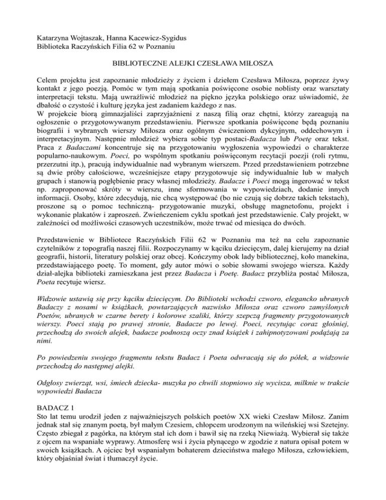 Katarzyna Wojtaszak, Hanna Kacewicz-Sygidus Biblioteka Raczyńskich Filia 62 w Poznaniu BIBLIOTECZNE ALEJKI CZESŁAWA MIŁOSZA Celem projektu jest zapoznanie młodzieży z życiem i dziełem Czesława Miłosza, poprzez żywy kontakt z jego poezją. Pomóc w tym mają spotkania poświęcone osobie noblisty oraz warsztaty interpretacji tekstu. Mają uwrażliwić młodzież na piękno języka polskiego oraz uświadomić, że dbałość o czystość i kulturę języka jest zadaniem każdego z nas. W projekcie biorą gimnazjaliści zaprzyjaźnieni z naszą filią oraz chętni, którzy zareagują na ogłoszenie o przygotowywanym przedstawieniu. Pierwsze spotkania poświęcone będą poznaniu biografii i wybranych wierszy Miłosza oraz ogólnym ćwiczeniom dykcyjnym, oddechowym i interpretacyjnym. Następnie młodzież wybiera sobie typ postaci-Badacza lub Poetę oraz tekst. Praca z Badaczami koncentruje się na przygotowaniu wygłoszenia wypowiedzi o charakterze popularno-naukowym. Poeci, po wspólnym spotkaniu poświęconym recytacji poezji (roli rytmu, przerzutni itp.), pracują indywidualnie nad wybranym wierszem. Przed przedstawieniem potrzebne są dwie próby całościowe, wcześniejsze etapy przygotowuje się indywidualnie lub w małych grupach i stanowią pogłębienie pracy własnej młodzieży. Badacze i Poeci mogą ingerować w tekst np. zaproponować skróty w wierszu, inne sformowania w wypowiedziach, dodanie innych informacji. Osoby, które zdecydują, nie chcą występować (bo nie czują się dobrze takich tekstach), proszone są o pomoc techniczną- przygotowanie muzyki, obsługę magnetofonu, projekt i wykonanie plakatów i zaproszeń. Zwieńczeniem cyklu spotkań jest przedstawienie. Cały projekt, w zależności od możliwości czasowych uczestników, może trwać od miesiąca do dwóch. Przedstawienie w Bibliotece Raczyńskich Filii 62 w Poznaniu ma też na celu zapoznanie czytelników z topografią naszej filii. Rozpoczynamy w kąciku dziecięcym, dalej kierujemy na dział geografii, historii, literatury polskiej oraz obcej. Kończymy obok lady bibliotecznej, koło manekina, przedstawiającego poetę. To moment, gdy autor mówi o sobie słowami swojego wiersza. Każdy dział-alejka biblioteki zamieszkana jest przez Badacza i Poetę. Badacz przybliża postać Miłosza, Poeta recytuje wiersz. Widzowie ustawią się przy kąciku dziecięcym. Do Biblioteki wchodzi czworo, elegancko ubranych Badaczy z nosami w książkach, powtarzających nazwisko Miłosza oraz czworo zamyślonych Poetów, ubranych w czarne berety i kolorowe szaliki, którzy szepczą fragmenty przygotowanych wierszy. Poeci stają po prawej stronie, Badacze po lewej. Poeci, recytując coraz głośniej, przechodzą do swoich alejek, badacze podnoszą oczy znad książek i zahipnotyzowani podążają za nimi. Po powiedzeniu swojego fragmentu tekstu Badacz i Poeta odwracają się do półek, a widzowie przechodzą do następnej alejki. Odgłosy zwierząt, wsi, śmiech dziecka- muzyka po chwili stopniowo się wycisza, milknie w trakcie wypowiedzi Badacza BADACZ 1 Sto lat temu urodził jeden z najważniejszych polskich poetów XX wieki Czesław Miłosz. Zanim jednak stał się znanym poetą, był małym Czesiem, chłopcem urodzonym na wileńskiej wsi Szetejny. Często zbiegał z pagórka, na którym stał ich dom i bawił się na rzeką Niewiażą. Wybierał się także z ojcem na wspaniałe wyprawy. Atmosferę wsi i życia płynącego w zgodzie z natura opisał potem w swoich książkach. A ojciec był wspaniałym bohaterem dzieciństwa małego Miłosza, człowiekiem, który objaśniał świat i tłumaczył życie. POETA 1 (najmłodszy z występujących) Z OKNA Za polem, lasem i za drugim polem Ogromna woda białym lustrem lśni się. A na niej ziemia złotawym podolem Nurza się w morzu jak tulipan w misie. Ojciec powiada, że to Europa. W dnie jasne całą widać jak na dłoni, Dymiącą jeszcze po wielu potopach, Mieszkanie ludzi, psów, kotów i koni. Miast kolorowych iskrzą się tam wieże, Jak nitki srebra plotą się strumienie I gór księżyce, niby gęsie pierze To tu, to ówdzie zaściełają ziemię. Odgłosy morza,wiatru. BADACZ 2 Życie jest podróżą...Jeszcze jako mały chłopiec odbył Miłosz wiele niezwykłych wojaży, razem z rodzicami pojechał między innymi do Krasnojarska i Moskwy. W końcu rodzina powróciła do swojego majątku, ale i stamtąd musiał wkrótce wyjechać do Wilna by uczyć się w gimnazjum, a potem studiować na Uniwersytecie im. Stefana Batorego. W 1930 roku opublikował w piśmie uniwersyteckim swoje pierwsze wiersze. W tym samym roku jedzie odwiedzić Paryż. Do Paryża powróci, by tu kontynuować naukę i rozwijać się artystycznie. W swoim życiu Czesław Miłosz wielokrotnie podróżował. Był we Włoszech, Francji, USA i to w Stanach mieszkał najdłużej, pracując na amerykańskich uczelniach, gdzie wykładał literaturę. Odgłosy wojny, wyburzy, samoloty Na całym życiu poety piętno odcisnęła wojna okupacja. Miłosz miał 28 lat gdy wybuchła II wojna światowa. Nad Polską i światem zaczęło krążyć to, co sam autor nazwał Duchem, Dziejów. Podczas wojny Miłosz uczestniczył w podziemnym życiu literackim Warszawy, zebrały także wiersze patriotyczne, krążące po wojennej Warszawie. Po zakończeniu wojny, poeta osiadł w Krajowie i wspominał ruiny stolicy, były to ruiny domów, ruiny ludzkich istnień, znajomych poetów, którzy stracili życie podczas wojny i tych, którzy nigdy nie otrząsną się okropieństwa okupacji. A on chciał o tym wszystkim pisać. I pisać mimo wszystko. POETA 2 W WARSZAWIE Co czynisz na gruzach katedry Świętego Jana, poeto, W ten ciepły, wiosenny dzień? Co myślisz tutaj, gdzie wiatr Od Wisły wiejąc rozwiewa Czerwony pył rumowiska? Przysięgałeś, że nigdy nie będziesz Płaczką żałobną. Przysięgałeś, że nigdy nie dotkniesz Ran wielkich swego narodu, Aby nie zmienić ich w świętość, Przeklęt
