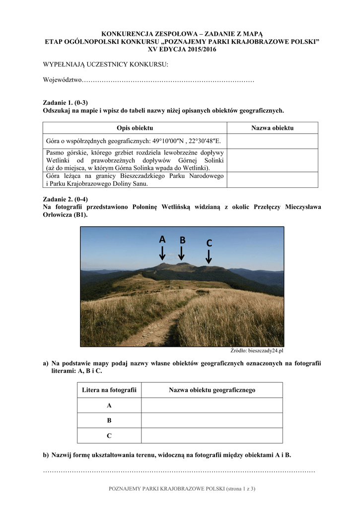 KONKURENCJA ZESPOŁOWA – ZADANIE Z MAPĄ ETAP OGÓLNOPOLSKI KONKURSU „POZNAJEMY PARKI KRAJOBRAZOWE POLSKI” XV EDYCJA 2015/2016 WYPEŁNIAJĄ UCZESTNICY KONKURSU: Województwo…………………………………………………………………… Zadanie 1. (0-3) Odszukaj na mapie i wpisz do tabeli nazwy niżej opisanych obiektów geograficznych. Opis obiektu Nazwa obiektu Góra o współrzędnych geograficznych: 49°10ʹ00ʺN , 22°30ʹ48ʺE. Pasmo górskie, którego grzbiet rozdziela lewobrzeżne dopływy Wetlinki od prawobrzeżnych dopływów Górnej Solinki (aż do miejsca, w którym Górna Solinka wpada do Wetlinki). Góra leżąca na granicy Bieszczadzkiego Parku Narodowego i Parku Krajobrazowego Doliny Sanu. Zadanie 2. (0-4) Na fotografii przedstawiono Połoninę Wetlińską widzianą z okolic Przełęczy Mieczysława Orłowicza (B1). A B C Źródło: bieszczady24.pl a) Na podstawie mapy podaj nazwy własne obiektów geograficznych oznaczonych na fotografii literami: A, B i C. Litera na fotografii Nazwa obiektu geograficznego A B C b) Nazwij formę ukształtowania terenu, widoczną na fotografii między obiektami A i B. …………………………………………………………………………………………………………… POZNAJEMY PARKI KRAJOBRAZOWE POLSKI (strona 1 z 3) Zadanie 3. (0-2) Fotografia przedstawia wierzchołek góry położonej na terenie Bieszczadzkiego Parku Narodowego. Zlokalizuj górę na mapie. Wpisz pod fotorgafią nazwę góry oraz jej wysokość bezwzględną. Źródło: bieszczady24.pl Nazwa góry ………………………………………………………………………. Wysokość bezwzględna ………………………………………………………….. Zadanie 4. (0-2) Z Przełęczy M. Orłowicza (B1) ruszasz czarnym szlakiem turystycznym na Wysokie Berdo. a) Podaj wysokość względną jaką pokonasz w czasie swojej wędrówki. Miejsce na obliczenia: Wysokość względna: ………………………………………………………… b) Oblicz czas przejścia z Przełęczy M. Orłowicza na Wysokie Berdo wiedząc, że długość tej trasy na mapie wynosi 6 cm. Przyjmij, że średnia prędkość pieszego turysty na szlaku wynosi 4 km/h, zaś każde 100 m podejścia pod górę wymaga doliczenia 10 minut. Miejsce na obliczenia: Czas przejścia: ……………………………………………………………….. POZNAJEMY PARKI KRAJOBRAZOWE POLSKI (strona 2 z 3) Zadanie 5. (0-6) Odszukaj na mapie szlaki turystyczne: - czerwony na odcinku od skrzyżowania dróg w Brzegach Górnych (E2) do Srebrzystej Przełęczy, - żółty na odcinku od Starego Sioła (A2) do schroniska ZHP Ostoja. Przyporządkuj każdemu ze szlaków po trzy charakterystyczne cechy, wpisując w tabeli odpowiednie litery przy właściwym szlaku. A. B. C. D. E. F. G. H. w większości przebiega przez teren zalesiony wzdłuż szlaku prowadzi ścieżka rowerowa przebiega w kierunku SE – NW na niewielkim odcinku trasa szlaku pokrywa się z drugim szlakiem turystycznym prowadzi przez szczytowe partie Połoniny Wetlińskiej w całości znajduje się poza terenem Bieszczadzkiego Parku Narodowego na znacznym odcinku prowadzi drogą gruntową składa się z dwóch odcinków o podobnej długości – jednego stromego, drugiego prawie płaskiego Szlak turystyczny Cecha przebiegu szlaku szlak czerwony szlak żółty Zadanie 6. (0-1) Wybierając się na wędrówkę Głównym Szlakiem Beskidzkim (czerwonym) postanowiłeś zdobyć „Koronę Wetlińską”, czyli wejść na Osadzki Wierch, Roh i Hnatowe Berdo. Wędrujący z tobą kolega uprzedził cię, że to będzie niemożliwe. Z niedowierzaniem zacząłeś studiować mapę i po chwili przyznałeś mu rację. Uzasadnij, dlaczego nie możesz zdobyć „Korony Wetlińskiej”. …………………………………………………………………………………………………………… …………………………………………………………………………………………………………… …………………………………………………………………………………………………………… POZNAJEMY PARKI KRAJOBRAZOWE POLSKI (strona 3 z 3)