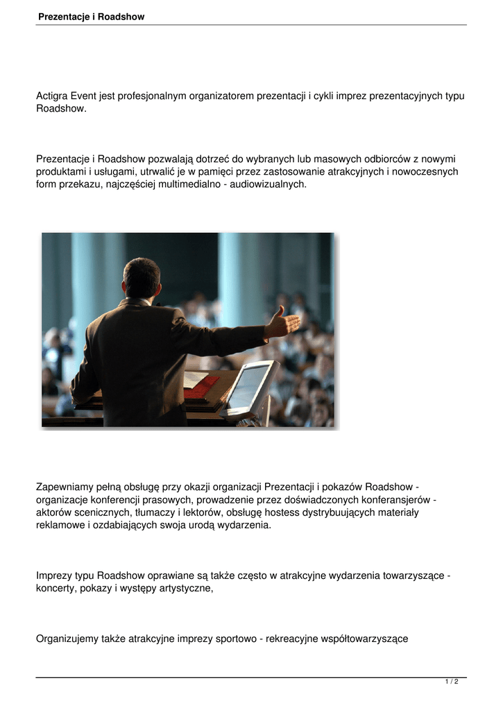 Prezentacje i Roadshow Actigra Event jest profesjonalnym organizatorem prezentacji i cykli imprez prezentacyjnych typu Roadshow. Prezentacje i Roadshow pozwalają dotrzeć do wybranych lub masowych odbiorców z nowymi produktami i usługami, utrwalić je w pamięci przez zastosowanie atrakcyjnych i nowoczesnych form przekazu, najczęściej multimedialno - audiowizualnych. Zapewniamy pełną obsługę przy okazji organizacji Prezentacji i pokazów Roadshow organizacje konferencji prasowych, prowadzenie przez doświadczonych konferansjerów aktorów scenicznych, tłumaczy i lektorów, obsługę hostess dystrybuujących materiały reklamowe i ozdabiających swoja urodą wydarzenia. Imprezy typu Roadshow oprawiane są także często w atrakcyjne wydarzenia towarzyszące koncerty, pokazy i występy artystyczne, Organizujemy także atrakcyjne imprezy sportowo - rekreacyjne współtowarzyszące 1/2 Prezentacje i Roadshow prezentacjom i imprezom roadshow - zawody w niecodziennych i nietypowych, szczególnie widowiskowych konkurencjach ekstremalnych z udziałem czołówki zawodników z kraju i zagranicy. Wydarzenia te pozwalają skoncentrować maksymalną uwagę uczestników i zwrócić na siebie uwagę mediów, zacierając przy tym granice typowego przekazu reklamowego, utrwalając w ten sposób w świadomości wizerunek prezentowanych produktów lub usług. 2/2