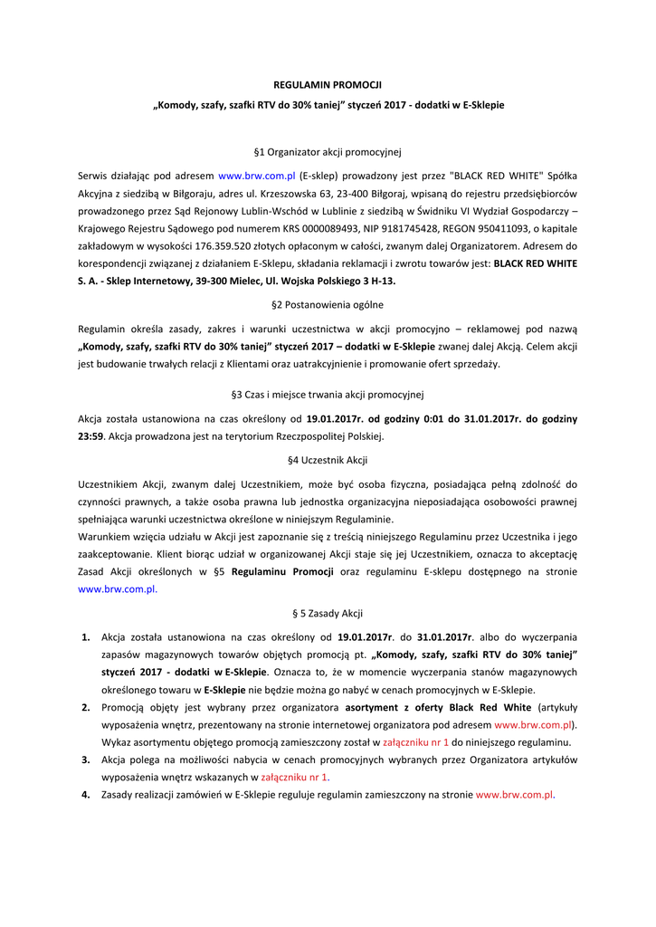 REGULAMIN PROMOCJI „Komody, szafy, szafki RTV do 30% taniej” styczeń 2017 - dodatki w E-Sklepie §1 Organizator akcji promocyjnej Serwis działając pod adresem www.brw.com.pl (E-sklep) prowadzony jest przez "BLACK RED WHITE" Spółka Akcyjna z siedzibą w Biłgoraju, adres ul. Krzeszowska 63, 23-400 Biłgoraj, wpisaną do rejestru przedsiębiorców prowadzonego przez Sąd Rejonowy Lublin-Wschód w Lublinie z siedzibą w Świdniku VI Wydział Gospodarczy – Krajowego Rejestru Sądowego pod numerem KRS 0000089493, NIP 9181745428, REGON 950411093, o kapitale zakładowym w wysokości 176.359.520 złotych opłaconym w całości, zwanym dalej Organizatorem. Adresem do korespondencji związanej z działaniem E-Sklepu, składania reklamacji i zwrotu towarów jest: BLACK RED WHITE S. A. - Sklep Internetowy, 39-300 Mielec, Ul. Wojska Polskiego 3 H-13. §2 Postanowienia ogólne Regulamin określa zasady, zakres i warunki uczestnictwa w akcji promocyjno – reklamowej pod nazwą „Komody, szafy, szafki RTV do 30% taniej” styczeń 2017 – dodatki w E-Sklepie zwanej dalej Akcją. Celem akcji jest budowanie trwałych relacji z Klientami oraz uatrakcyjnienie i promowanie ofert sprzedaży. §3 Czas i miejsce trwania akcji promocyjnej Akcja została ustanowiona na czas określony od 19.01.2017r. od godziny 0:01 do 31.01.2017r. do godziny 23:59. Akcja prowadzona jest na terytorium Rzeczpospolitej Polskiej. §4 Uczestnik Akcji Uczestnikiem Akcji, zwanym dalej Uczestnikiem, może być osoba fizyczna, posiadająca pełną zdolność do czynności prawnych, a także osoba prawna lub jednostka organizacyjna nieposiadająca osobowości prawnej spełniająca warunki uczestnictwa określone w niniejszym Regulaminie. Warunkiem wzięcia udziału w Akcji jest zapoznanie się z treścią niniejszego Regulaminu przez Uczestnika i jego zaakceptowanie. Klient biorąc udział w organizowanej Akcji staje się jej Uczestnikiem, oznacza to akceptację Zasad Akcji określonych w §5 Regulaminu Promocji oraz regulaminu E-sklepu dostępnego na stronie www.brw.com.pl. § 5 Zasady Akcji 1. Akcja została ustanowiona na czas określony od 19.01.2017r. do 31.01.2017r. albo do wyczerpania zapasów magazynowych towarów objętych promocją pt. „Komody, szafy, szafki RTV do 30% taniej” styczeń 2017 - dodatki w E-Sklepie. Oznacza to, że w momencie wyczerpania stanów magazynowych określonego towaru w E-Sklepie nie będzie można go nabyć w cenach promocyjnych w E-Sklepie. 2. Promocją objęty jest wybrany przez organizatora asortyment z oferty Black Red White (artykuły wyposażenia wnętrz, prezentowany na stronie internetowej organizatora pod adresem www.brw.com.pl). Wykaz asortymentu objętego promocją zamieszczony został w załączniku nr 1 do niniejszego regulaminu. 3. Akcja polega na możliwości nabycia w cenach promocyjnych wybranych przez Organizatora artykułów wyposażenia wnętrz wskazanych w załączniku nr 1. 4. Zasady realizacji zamówień w E-Sklepie reguluje regulamin zamieszczony na stronie www.brw.com.pl. § 6 Postanowienia końcowe 1. Regulamin wchodzi w życie z dniem 19.01.2017r. od godziny 0:01 i obowiązuje do dnia 31.01.2017r. do godziny 23:59, a jego treść dostępna jest w siedzibie spółki ”BLACK RED WHITE” S.A., oraz na stronie www.brw.com.pl. 2. We wszystkich sprawach nieuregulowanych w niniejszym Regulaminie zastosowanie mają odpowiednie przepisy Kodeksu Cywilnego.