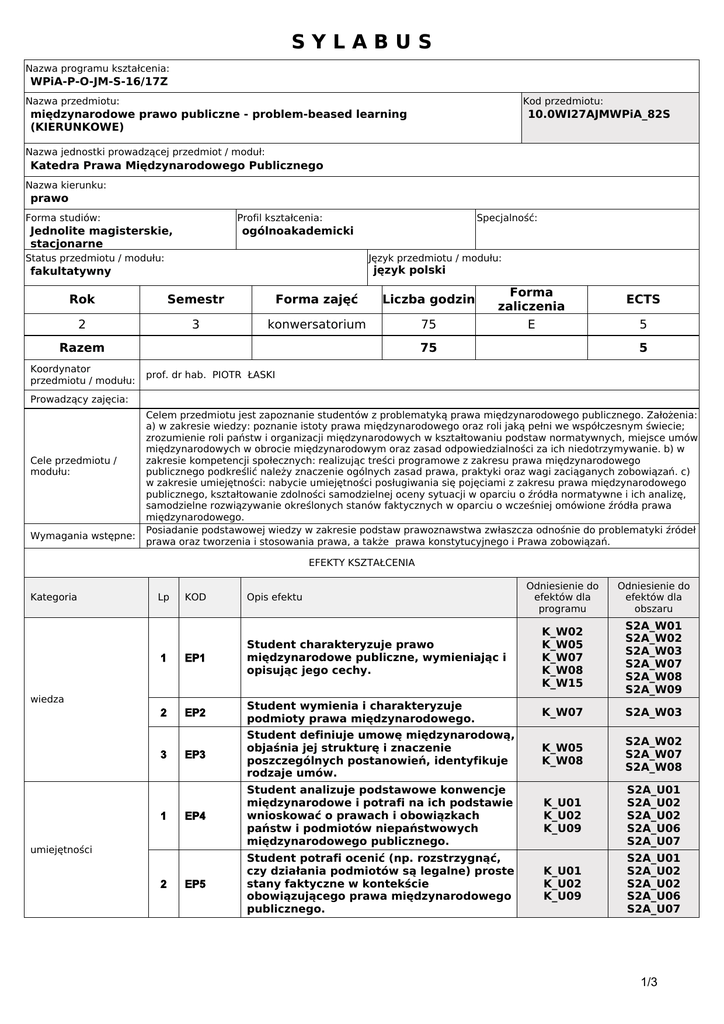 SYLABUS Nazwa programu kształcenia: WPiA-P-O-JM-S-16/17Z Nazwa przedmiotu: Kod przedmiotu: międzynarodowe prawo publiczne - problem-beased learning (KIERUNKOWE) 10.0WI27AJMWPiA_82S Nazwa jednostki prowadzącej przedmiot / moduł: Katedra Prawa Międzynarodowego Publicznego Nazwa kierunku: prawo Forma studiów: Profil kształcenia: Jednolite magisterskie, stacjonarne Specjalność: ogólnoakademicki Status przedmiotu / modułu: Język przedmiotu / modułu: język polski fakultatywny Rok Semestr Forma zajęć Liczba godzin 2 3 konwersatorium 75 Razem Koordynator przedmiotu / modułu: Forma zaliczenia E 75 ECTS 5 5 prof. dr hab. PIOTR ŁASKI Prowadzący zajęcia: Cele przedmiotu / modułu: Wymagania wstępne: Celem przedmiotu jest zapoznanie studentów z problematyką prawa międzynarodowego publicznego. Założenia: a) w zakresie wiedzy: poznanie istoty prawa międzynarodowego oraz roli jaką pełni we współczesnym świecie; zrozumienie roli państw i organizacji międzynarodowych w kształtowaniu podstaw normatywnych, miejsce umów międzynarodowych w obrocie międzynarodowym oraz zasad odpowiedzialności za ich niedotrzymywanie. b) w zakresie kompetencji społecznych: realizując treści programowe z zakresu prawa międzynarodowego publicznego podkreślić należy znaczenie ogólnych zasad prawa, praktyki oraz wagi zaciąganych zobowiązań. c) w zakresie umiejętności: nabycie umiejętności posługiwania się pojęciami z zakresu prawa międzynarodowego publicznego, kształtowanie zdolności samodzielnej oceny sytuacji w oparciu o źródła normatywne i ich analizę, samodzielne rozwiązywanie określonych stanów faktycznych w oparciu o wcześniej omówione źródła prawa międzynarodowego. Posiadanie podstawowej wiedzy w zakresie podstaw prawoznawstwa zwłaszcza odnośnie do problematyki źródeł prawa oraz tworzenia i stosowania prawa, a także prawa konstytucyjnego i Prawa zobowiązań. EFEKTY KSZTAŁCENIA Kategoria Lp KOD Opis efektu Odniesienie do efektów dla programu Odniesienie do efektów dla obszaru S2A_W01 S2A_W02 S2A_W03 S2A_W07 S2A_W08 S2A_W09 1 EP1 Student charakteryzuje prawo międzynarodowe publiczne, wymieniając i opisując jego cechy. K_W02 K_W05 K_W07 K_W08 K_W15 2 EP2 Student wymienia i charakteryzuje podmioty prawa międzynarodowego. K_W07 S2A_W03 EP3 Student definiuje umowę międzynarodową, objaśnia jej strukturę i znaczenie poszczególnych postanowień, identyfikuje rodzaje umów. K_W05 K_W08 S2A_W02 S2A_W07 S2A_W08 EP4 Student analizuje podstawowe konwencje międzynarodowe i potrafi na ich podstawie wnioskować o prawach i obowiązkach państw i podmiotów niepaństwowych międzynarodowego publicznego. K_U01 K_U02 K_U09 S2A_U01 S2A_U02 S2A_U02 S2A_U06 S2A_U07 EP5 Student potrafi ocenić (np. rozstrzygnąć, czy działania podmiotów są legalne) proste stany faktyczne w kontekście obowiązującego prawa międzynarodowego publicznego. K_U01 K_U02 K_U09 S2A_U01 S2A_U02 S2A_U02 S2A_U06 S2A_U07 wiedza 3 1 umiejętności 2 1/3 1 EP6 Student zachowuje krytyczny stosunek do prezentowanych w literaturze przedmiotu poglądów. K_K03 S2A_K06 EP7 Student pracuje w zespole w trakcie ćwiczeń nad rozstrzygnięciem prostych stanów faktycznych w oparciu o obowiązujące normy prawa międzynarodowego. K_K05 K_K06 S2A_K03 S2A_K04 S2A_K05 S2A_K07 Semestr Liczba godzin kompetencje społeczne 2 TREŚCI PROGRAMOWE Przedmiot: międzynarodowe prawo publiczne - problem-beased learning Forma zajęć: konwersatorium 1. Prawo międzynarodowe - definicja i zagadnienia wprowadzające Cechy charakterystyczne prawa międzynarodowego publicznego. Charakterystyka międzynarodowego sądownictwa 3 5 2. Relacje między prawem krajowym a prawem międzynarodowym. 3 2 3. Źródła prawa międzynarodowego publicznego: - zwyczaj, - umowy międzynarodowe, - uchwały organizacji międzynarodowych, - ogólne zasady prawa. Środki pomocnicze do ustalenia źródeł prawa międzynarodowego: - doktryna, - judykatura. 3 9 4. Zasady współdziałania i ponoszenia odpowiedzialności przez państwa. 3 5 3 10 3 10 7. Prawo traktatowe - budowa umowy międzynarodowej 3 6 8. Charakterystyka międzynarodowego sądownictwa. 3 5 9. Postępowanie przed sądami międzynarodowymi wraz z przykładami orzecznictwa. 3 6 10. Międzynarodowy system ochrony praw człowieka: - uniwersalny system ochrony praw człowieka - europejski system ochrony praw człowieka (Rada Europy, Unia Europejska, OBWE), pozaeuropejskie systemy ochrony praw człowieka. 3 5 11. Międzynarodowy system ochrony praw człowieka - wybrane stany faktyczne. 3 6 12. Prawo Konfliktów zbrojnych 3 6 5. Problematyka podmiotowości w prawie międzynarodowym. Klasyfikacja podmiotów prawa międzynarodowego. Katalog podmiotów w prawie międzynarodowym publicznym: - państwa, organizacje międzynarodowe, - Stolica Apostolska, - Zakon Kawalerów Maltańskich, - powstańcy i strony wojujące, - osoby fizyczne i prawne. 6. Prawo traktatowe: - zagadnienia wprowadzające, - etapy zawiewania umowy międzynarodowej, - nieważność a wygaśnięcie umowy międzynarodowej, - interpretacja umów międzynarodowych. Metody kształcenia praca w grupach,, rozwiązywanie kazusów,, burza mózgów,, dyskusja, Analiza tekstów prawnych, Nr efektu kształcenia z sylabusa Metody weryfikacji efektów kształcenia PRACA PISEMNA/ ESEJ/ RECENZJA EP1,EP2,EP3,EP4,E P5 PREZENTACJA EP2,EP5 PROJEKT EP3,EP4 ZAJĘCIA PRAKTYCZNE (WERYFIKACJA POPRZEZ OBSERWACJE) EP6,EP7 Zaliczenie z przedmiotu obejmuje pracę pisemną podsumowującą zdobytą przez studenta wiedzę oraz umiejętności w trakcie konwersatorium. Ocenę ustala się wg poniższego progu procentowego: 100% - 90% - bdb, 89% - 85% -db+, 84% - 75% - db, 74% - 69% dst+, 68%-51% - dst, 50 % i mniej - ndst. Forma i warunki zaliczenia 5.0 bardzo dobry (bdb) - wybitne osiągnięcia - wyniki z dopuszczeniem jedynie drugorzędnych błędów 4.5 dobry plus (db+) - powyżej średniego standardu - z pewnymi błędami 4.0 dobry (db) 
