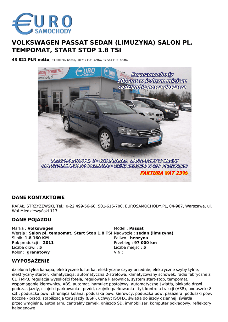 VOLKSWAGEN PASSAT SEDAN (LIMUZYNA) SALON PL. TEMPOMAT, START STOP 1.8 TSI 43 821 PLN netto, 53 900 PLN brutto, 10 212 EUR netto, 12 561 EUR brutto DANE KONTAKTOWE RAFAŁ, STRZYŻEWSKI, Tel.: 0-22 499-56-68, 501-615-700, EUROSAMOCHODY.PL, 04-987, Warszawa, ul. Wał Miedzieszyński 117 DANE POJAZDU Marka : Volkswagen Model : Passat Wersja : Salon pl. tempomat, Start Stop 1.8 TSI Nadwozie : sedan (limuzyna) Silnik :1.8 160 KM Paliwo : benzyna Rok produkcji : 2011 Przebieg : 97 000 km Liczba drzwi : 5 Liczba miejsc : 5 Kolor : granatowy VIN : WYPOSAŻENIE dzielona tylna kanapa, elektryczne lusterka, elektryczne szyby przednie, elektryczne szyby tylne, elektryczny starter, klimatyzacja: automatyczna 2-strefowa, klimatyzowany schowek, radio fabryczne z CD i MP3, regulacja wysokości fotela, regulowana kierownica, system start-stop, tempomat, wspomaganie kierownicy, ABS, automat. hamulec postojowy, automatyczne światła, blokada drzwi podczas jazdy, czujniki parkowania - przód, czujniki parkowania - tył, kontrola trakcji (ASR), poduszek: 8 szt., poduszka pow. chroniąca kolana, poduszka pow. kierowcy, poduszka pow. pasażera, poduszki pow. boczne - przód, stabilizacja toru jazdy (ESP), uchwyt ISOFIX, światła do jazdy dziennej, światła przeciwmgielne, autoalarm, centralny zamek, gniazdo SD, immobiliser, komputer pokładowy, reflektory halogenowe WYPOSAŻENIE DODATKOWE bezwypadkowy, gwarancja, książka serwisowa, możliwa zamiana, serwisowany w ASO, stan bardzo dobry OPIS POJAZDU Salon Polska WITAMY W NAJWIĘKSZYM W POLSCE SALONIE SAMOCHODÓW UŻYWANYCH ZADZWOŃ TERAZ!!! Rafał 501 615 700 Tomasz 512 345 150 Marcin 505 416 300 Piotr 501 087 038 Mariusz 500 130 727 SUPER PROMOCJA GWARANCJA TECHNICZNA NA 12 MIESIĘCY lub KOMPLET OPON ZIMOWYCH lub LETNICH GRATIS*(do wyczerpania zapasów, możliwość rozszerzenia gwarancji do 36 miesięcy) - 500 AUT Z GWARANCJĄ w jednym miejscu / różne marki , modele , wersje wyposażenia/ - 8 dni na zamianę auta - Sprawdzone pochodzenie pojazdów - bezwypadkowe - Gwarancja przebiegu - Gwarancja pełnej historii serwisowej - Samochody od I właściciela - dla klientów zamiejscowych rezerwacja auta do czasu przyjazdu - udzielamy 12-miesięcznej gwarancji technicznej, możliwość przedłużenia do 36-miesięcy /bez limitu kilometrów, ważna na terenie całej Polski + assistance- darmowe holowanie , potwierdzenie certyfikatem / Kupującemu oferujemy: 1. Jazdę próbną 2. Bezpłatny przegląd przedsprzedażowy obejmujący: - kontrolę amortyzatorów - hamulców - podwozia samochodu - pomiar geometrii - diagnoza komputerowa - pomiar grubości powłoki lakierniczej - możliwość sprawdzenia przed zakupem w serwisie lub stacji diagnostycznej lub za pośrednictwem niezależnego rzeczoznawcy na zlecenie kupującego /dla klientów zamiejscowych bez konieczności przyjazdu/. - wszystkie nasze samochody posiadają komplet dokumentów wymaganych do zarejestrowania bądź przerejestrowania samochodu - przyjmujemy auta w rozliczeniu oraz kupujemy /bez ograniczeń wiekowych/ - Zajmujemy się sprzedażą detaliczną oraz hurtową / zapraszamy do współpracy osoby prywatne, firmy również z branży i instytucje / -Kupujący otrzymuje fakturę VAT 23% /nie ponosi opłaty PCC w wysokości 2%/ -kredyt 0% wpłaty własnej,raty dopasowane do własnych potrzeb -leasing bez zaświadczeń ,również dla widniejących w BIK szybka obsługa na miejscu "Niniejsze ogłoszenia są wyłącznie informacją handlową i nie stanowią oferty w myśl art. 66, § 1. Kodeksu Cywilnego. Sprzedający nie odpowiada za ewentualne błędy lub nieaktualność ogłoszenia." Zapis ten został zamieszczony ze względu na możliwość niezamierzonych pomyłek. Jeżeli zauważysz nieścisłość napisz do nas. Szukasz pewnego używanego auta ? Tylko u nas sprawdzone samochody z polskich salonów To nie komis to salon aut używanych z wieloletnim doświadczeniem Więcej informacji na eurosamochody . pl ZADZWOŃ TERAZ!!! Rafał 501 615 700 Tomasz 512 345 150 Marcin 505 416 300 Piotr 501 087 038 Mariusz 500 130 727 QR CODE DLA OGŁOSZENIA Powered by TCPDF (www.tcpdf.org)