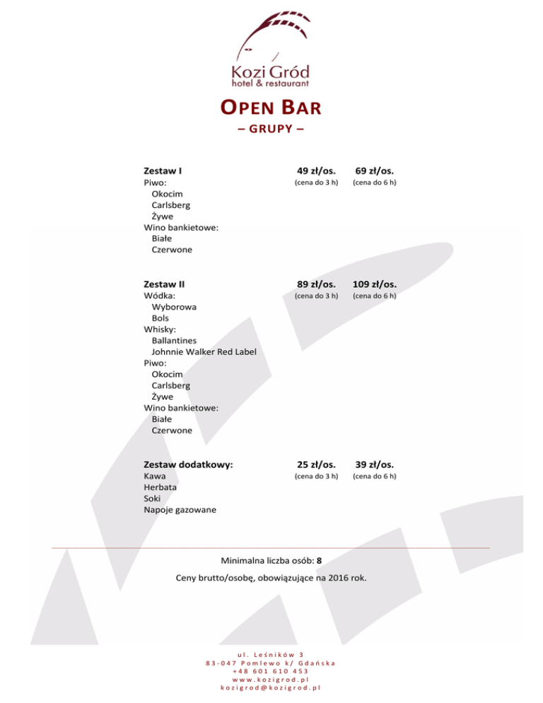 O PEN B AR – GRUPY – Zestaw I 49 zł/os. 69 zł/os. Piwo: Okocim Carlsberg Żywe Wino bankietowe: Białe Czerwone (cena do 3 h) (cena do 6 h) Zestaw II 89 zł/os. 109 zł/os. Wódka: Wyborowa Bols Whisky: Ballantines Johnnie Walker Red Label Piwo: Okocim Carlsberg Żywe Wino bankietowe: Białe Czerwone (cena do 3 h) (cena do 6 h) Zestaw dodatkowy: 25 zł/os. 39 zł/os. Kawa Herbata Soki Napoje gazowane (cena do 3 h) (cena do 6 h) _________________________________________________________________________________________________________________________________________________________________________________________________ Minimalna liczba osób: 8 Ceny brutto/osobę, obowiązujące na 2016 rok. ul. Leśników 3 83-047 Pomlewo k/ Gdańska +48 601 610 453 www.kozigrod.pl [email protected]