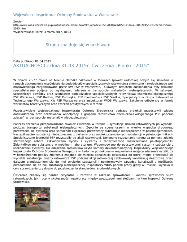 Wojewódzki Inspektorat Ochrony Środowiska w Warszawie Źródło: http://www.wios.warszawa.pl/pl/aktualnosci-i-komunika/aktualnosci/1059,AKTUALNOSCI-z-dnia-31032015r-Cwiczenia-Pionki2015.html Wygenerowano: Piątek, 3 marca 2017, 18:24 Strona znajduje się w archiwum. Data publikacji 01.04.2015 AKTUALNOŚCI z dnia 31.03.2015r. Ćwiczenia „Pionki - 2015” W dniach 26-27 marca na terenie Ośrodka Szkolenia w Pionkach (powiat radomski) odbyło się szkolenie w ramach doskonalenia współdziałania pododdziałów specjalistycznych ratownictwa chemiczno – ekologicznego woj. mazowieckiego zorganizowane przez KW PSP w Warszawie. Głównym tematem doskonalenia były działania specjalistyczne podjęte po wystąpieniu zdarzeń w transporcie materiałów niebezpiecznych. W szkoleniu uczestniczyli dowódcy oraz członkowie pododdziałów specjalistycznych ratownictwa chemiczno-ekologicznego PSP Warszawa, PSP Radom, PSP Ostrołęka, PSP Ciechanów i PSP Siedlce, Specjalistyczna Grupa Ratownictwa Technicznego Warszawa, KW PSP Warszawa oraz inspektorzy WIOŚ Warszawa. Szkolenie odbyło się w formie warsztatów teoretycznych oraz ćwiczeń praktycznych w terenie. Przedstawiciele Wojewódzkiego Inspektoratu Ochrony Środowiska podczas prelekcji przedstawili własne doświadczenia oraz oczekiwania współpracy z grupami ratownictwa chemiczno-ekologicznego PSP podczas zdarzeń w transporcie materiałów niebezpiecznych. Podczas szkolenia przeprowadzono również ćwiczenia w terenie – symulacje działań ratowniczych po wypadku podczas transportu substancji niebezpiecznych. Zgodnie ze scenariuszem w wyniku wypadku drogowego przewróciła się cysterna oraz samochód ciężarowy przewożący substancje niebezpieczne w paletopojemnikach. Nastąpił wyciek substancji niebezpiecznej z cysterny oraz wyciek przewożonych substancji w paletopojemnikach. Specjalistyczne jednostki PSP przystąpiły do akcji ratowniczej. Dokonano rozpoznania terenu za pomocą zdalnie sterowanego robota, zlikwidowano wyciek z cysterny i zabezpieczono rozszczelnione paletopojemniki. Zidentyfikowano substancje w mobilnym laboratorium. Wypompowano do podstawionej cysterny substancje z uszkodzonej cysterny. Do odkażenia ratowników użyto komory dekontaminacyjnej. Inspektorzy Wojewódzkiego Inspektoratu Ochrony Środowiska Delegatura w Radomiu po dokonaniu rozpoznania miejsca zdarzenia ustalili, że w bezpośrednim pobliżu zdarzenia znajduje się miejska kanalizacja deszczowa do której mogła przedostać się wyciekła substancja. Służby ratownicze PSP podczas akcji ratowniczej zablokowały kanalizację deszczową przed dalszym przedostaniem się do niej wyciekłej substancji i poinformowały zarządcę kanalizacji o możliwości przedostania się do niej substancji niebezpiecznej. Inspektorzy WIOŚ pobrali próby gleby w miejscu wycieku w celu sprawdzenia czy doszło do przekroczenia standardów środowiskowych. Ćwiczenia okazały się bardzo przydatne – zarówno w zakresie sprawdzenia i kontroli sprawności służb ratowniczych, jak i oceny skuteczności współpracy między poszczególnymi służbami, w tym Inspekcji Ochrony Środowiska. Data publikacji 01.04.2015 Rejestr zmian Liczba wizyt: 758 Autor: Iwona Kalinowska-Witowska Opublikowane przez Ewa Pacholska