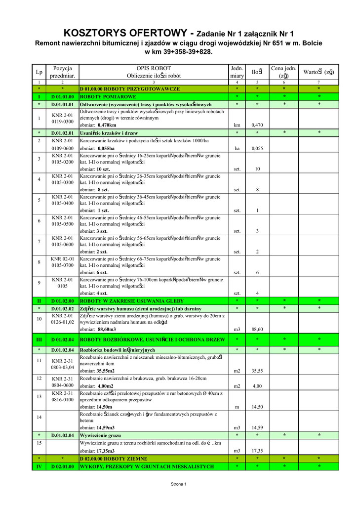 KOSZTORYS OFERTOWY - Zadanie Nr 1 załącznik Nr 1