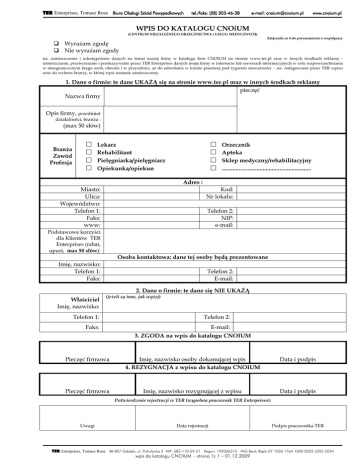 TER Enterprises, Tomasz Rosa Biuro Obsługi Obsługi Szkód Powypadkowych tel./faks tel./faks: ks: (58) 303303-4646-38 e-mail: cnoium@ [email protected] cnoium.pl www www.cnoium.pl cnoium.pl WPIS DO KATALOGU CNOiUM (CENTRUM NIEZALEśNEGO ORZECZNICTWA i USŁUG MEDYCZNYCH) Załącznik nr 4 do porozumienia o współpracy WyraŜam zgodę Nie wyraŜam zgody na: zamieszczenie i udostępnienie danych na temat naszej firmy w katalogu firm CNOIUM na stronie www.ter.pl oraz w innych środkach reklamy umieszczanie, przetwarzanie i przekazywanie przez TER Enterprises danych mojej firmy w internecie lub serwisach informacyjnych w celu rozpowszechniania w nieograniczonym kręgu osób, obecnie i w przyszłości, aŜ do odwołania w formie pisemnej pod rygorem niewaŜności - na redagowanie przez TER wpisu oraz do wyboru branŜy, w której wpis zostanie zamieszczony. 1. Dane o firmie: te dane UKAśĄ się na stronie www.ter.pl oraz w innych środkach reklamy pieczęć Nazwa firmy Opis firmy, przedmiot działalności, branŜa : (max 50 słów) BranŜa Zawód Profesja □ □ □ □ □ □ □ □ Lekarz Rehabilitant Pielęgniarka/pielęgniarz Opiekunka/opiekun Orzecznik Apteka Sklep medyczny/rehabilitacyjny ........................................................... Adres : Miasto: Ulica: Województwo: Telefon 1: Faks: www: Kod: Nr lokalu: Telefon 2: NIP: e-mail: Podstawowe korzyści dla Klientów TER Enterprises (rabat, upust, max 50 słów): Osoba kontaktowa: dane tej osoby będą prezentowane Imię, nazwisko: Telefon 1: Faks: Telefon 2: E-mail: 2. Dane o firmie: te dane się NIE UKAśĄ Właściciel Imię, nazwisko: (jeŜeli są inne, jak wyŜej) Telefon 1: Telefon 2: Faks: E-mail: 3. ZGODA na wpis do katalogu CNOIUM Pieczęć firmowa Imię, nazwisko osoby dokonującej wpis 4. REZYGNACJA z wpisu do katalogu CNOIUM Data i podpis Pieczęć firmowa Imię, nazwisko rezygnującej z wpisu Data i podpis Potwierdzenie rejestracji w TER (wypełnia pracownik TER Enterprises): Uwagi Data rejestracji Podpis pracownika TER TER Enterprises, Tomasz Rosa 80-807 Gdańsk, ul. Pohulanka 2 NIP: 583-110-59-51 Regon: 192006315 ING Bank Śląski 07 1050 1764 1000 0022 3395 5034 wpis do katalogu CNOIUM - strona 1z 1 – 01.12.2009