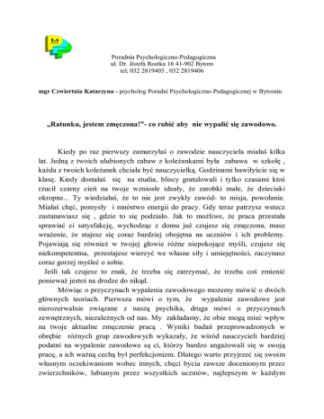 Poradnia Psychologiczno-Pedagogiczna ul. Dr. Józefa Rostka 16 41-902 Bytom tel; 032 2819405 , 032 2819406 mgr Czwiertnia Katarzyna - psycholog Poradni Psychologiczno-Pedagogicznej w Bytomiu „Ratunku, jestem zmęczona!”- co robić aby nie wypalić się zawodowo. Kiedy po raz pierwszy zamarzyłaś o zawodzie nauczyciela miałaś kilka lat. Jedną z twoich ulubionych zabaw z koleżankami była zabawa w szkołę , każda z twoich koleżanek chciała być nauczycielką. Godzinami bawiłyście się w klasę. Kiedy dostałaś się na studia, bliscy gratulowali i tylko czasami ktoś rzucił czarny cień na twoje wzniosłe ideały, że zarobki małe, że dzieciaki okropne... Ty wiedziałaś, że to nie jest zwykły zawód- to misja, powołanie. Miałaś chęć, pomysły i mnóstwo energii do pracy. Gdy teraz patrzysz wstecz zastanawiasz się , gdzie to się podziało. Jak to możliwe, że praca przestała sprawiać ci satysfakcję, wychodząc z domu już czujesz się zmęczona, masz wrażenie, że stajesz się coraz bardziej obojętna na uczniów i ich problemy. Pojawiają się również w twojej głowie różne niepokojące myśli, czujesz się niekompetentna, przestajesz wierzyć we własne siły i umiejętności, zaczynasz coraz gorzej myśleć o sobie. Jeśli tak czujesz to znak, że trzeba się zatrzymać, że trzeba coś zmienić ponieważ jesteś na drodze do nikąd. Mówiąc o przyczynach wypalenia zawodowego możemy mówić o dwóch głównych teoriach. Pierwsza mówi o tym, że wypalenie zawodowe jest nierozerwalnie związane z naszą psychika, druga mówi o przyczynach zewnętrznych, niezależnych od nas. My zakładamy, że obie mogą mieć wpływ na twoje aktualne zmęczenie pracą . Wyniki badań przeprowadzonych w obrębie różnych grup zawodowych wykazały, że wśród nauczycieli bardziej podatni na wypalenie zawodowe są ci, którzy bardzo angażowali się w swoją pracę, a ich ważną cechą był perfekcjonizm. Dlatego warto przyjrzeć się swoim własnym oczekiwaniom wobec innych, chęci bycia zawsze docenionym przez zwierzchników, lubianym przez wszystkich uczniów, najlepszym w każdym podejmowanym działaniu. Codzienne sytuacje brutalnie konfrontują nas z rzeczywistością. Pytanie: czy to czego oczekuję jest w ogóle możliwe? Czy nie postawiłam sobie zbyt wysoko poprzeczki? Każdego dnia w szkole spotykasz kilkudziesięciu, kilkuset uczniów, borykasz się co najmniej z kilkoma trudnymi sytuacjami, robisz wiele rzeczy na raz, żeby ze wszystkim zdążyć. Wiele sytuacji i problemów jest dla ciebie nowych, nie miałaś możliwości przygotować się ... A teraz przyjrzymy się jak wygląda twój tzw. system wsparcia? Rozejrzyj się dookoła i odpowiedz sobie na pytanie co robię kiedy mam kłopoty: konfrontuję się z nimi, próbuję je rozwiązać , czy unikam i udaję że nic się nie dzieje? Czy masz osoby, które rozumieją cię i mogą pomóc zdystansować się, wesprą cię mądrą radą kiedy spotykają cię trudności? Kolejne ważne pytanie: czy potrafię prosić o pomoc oraz korzystać z pomocy, którą ktoś mi oferuje? Jeśli zakładasz, że prosząc o pomoc pokazujesz swoja bezradność i brak kompetencji to skazujesz siebie na samotność i brak wsparcia. Odbierasz sobie w ten sposób możliwość uzyskania informacji zwrotnych, zobaczenia „z boku’ co tak naprawdę się dzieje. Ktoś kiedyś powiedział ” błędów nie popełnia tylko ten, kto nic nie robi”. Jeśli pracujesz, podejmujesz różne decyzje, działania, nie ma możliwości, abyś nigdy się nie mylił, a to co robisz zawsze było idealne. Pytanie: czy dajesz sobie przyzwolenie na popełnianie błędów ? Jak pokazują statystyki częściej wypaleniem zagrożeni są ci, którzy każdy zamiast wyciągać konstruktywne wnioski ze swoich błędów- godzinami je analizują, przeżywają, czują się winni, coraz bardziej winni... Kolejny aspekt wypalenia zawodowego wiąże się z realna oceną własnych możliwości. Czasami zdarza się tak, że kierowani ambicja (będę lepszy niż inni, zrobię więcej i lepiej niż inni) lub brakiem umiejętności odmawiania bierzemy sobie zbyt dużo obowiązków na głowę. Na początku nawet sobie radzimy, jakoś łapiemy koniec z końcem, ale z czasem czujemy, że obowiązki nas przerastają i wszystko zaczyna wymykać się spod kontroli. Efekty wypalenia zawodowego przekładają się również na nasze zdrowie: bezsenność, nadciśnienie, choroba wrzodowa- to tylko niektóre skutki wyczerpania emocjonalnego. Oto w skrócie symptomy wypalenia zawodowego: 1. Wyczerpanie fizycznę (chroniczne zmęczenie, brak apetytu, utrata wagi). 2. Efekty psychosomatyczne (migrenowe bóle głowy oraz inne bóle bez wyraźnej przyczyny, niestrawność, ciągła potrzeba snu lub bezsenność, drżenia na tle nerwowym). 3. Labilność emocjonalna (niecierpliwość, wybuchy złości, szybka irytacja, utrata radości życia, wyładowywanie agresji na innych, oskarżanie innych za niepowodzenia). 4. Używki- nadmierne sięganie po środki uspakajające i przeciwbólowe, sięganie po alkohol, papierosy, objadanie się słodyczami. 5. Trudności w podejmowaniu decyzji, problemy z koncentracją, poczcie winy oraz izolowanie się od bliskich A oto kilka ważnych wskazówek, które pozwolą ci zawodowego. ustrzec się wypalenia Po pierwsze– Zadbaj o siebie! Często zdarza się że zajmując się na co dzień innymi zapominamy o samych sobie. Warto pomyśleć o sobie: własnych potrzebach i możliwościach. Sprawić sobie od czasu do czasu małą przyjemność, wybrać się do kina, kupić sobie jakiś drobiazg, po męczącym dniu wziąć długą kąpiel, zapisać się na jogę lub pilateskażdy z nas lubi coś innego. Po drugie- Nie traktuj wszystkiego zbyt osobiście! Pułapka, którą sami na siebie ustawiamy jest myślenie, że inni robią nam na złość (uczniowie, współpracownicy, szefowie). Lubimy gdy wszystko idzie po naszej myśli, a gdy tak się nie dziej