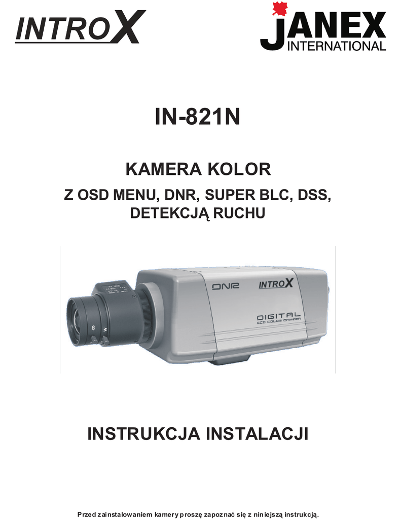 IN-821N KAMERA KOLOR Z OSD MENU, DNR, SUPER BLC, DSS, DETEKCJĄ RUCHU INSTRUKCJA INSTALACJI Przed z ainstalowaniem kamer y p roszę zapoz nać się z nin iejszą instrukcją. Właściwości SONY 1/3” Super HAD Kolor CCD Rozdzielczość 560 linii TV Czułość 0.002Lux Wbudowana funkcja Dynamicznej Redukcji Szumów DNR Super BLC Wbudowana Detekcja Ruchu i Maski Prywatności Wbudowane Menu OSD Szeroki zakres AWB Wbudowana funkcja zwolnienia migawki DSS Zasilanie 12VDC Wymiary 54 129 118 64 2 Funkcje podstawowe Przyciski Menu OSD VIDEO OUT SETUP SETUP POWER DC LENS AUTO IRIS VIDEO AC 12V / DC 12V LENS SHUTTER WHITE BAL BACKLIGHT AGC DNR DSS SPECIAL EXIT DC ATW MIDDLE MIDDLE MIDDLE AUTO Przyciski OSD Menu SETUP KEY - Używane do wejścia w Menu oraz do zatwierdzenia ustawień. UP / DOWN KEY - Używane do wyboru żądanego parametru. LEFT / RIGHT KEY - Używane do zmiany wartości wybranego parametru. Wejście do Menu / Wyjście z Menu OSD A. Aby wejść do OSD MENU należy wcisnąć przycisk SETUP B. Aby wyjść z OSD MENU należy wybrać w Menu EXIT i wcisnąć SETUP Wybór rodzaju sterowania przesłoną obiektywu DC / VIDEO W tym miejscu należy wybrać sposób sterowania przesłoną obiektywu odpowiednio do zastosowanego obiektywu. A. W przypadku zastosowania obiektywu ze sterowaniem VIDEO, jasność obrazu (stopień otwarcia przesłony) należy ustawić pokrętłem na obiektywie. B. Przy zastosowaniu obiektywu ze sterowaniem DC, należy wybrać w Menu LENS -> DC, wcisnąć przycisk SETUP i ustawić poziom otwarcia przesłony. 3 Funkcje podstawowe INSTALACJA OBIEKTYWU ZE STEROWANIEM VIDEO/DC IRIS Stosując obiektyw z automatycznie sterowaną przesłoną, należy: 1. Wybrać o dpowiedni rodzaj obiektywu w Menu kamery (DC / VIDEO) 2. Jeżeli zachodzi taka potrzeba, przylutować wtyczkę do obiektywu, (poniżej pokazano opis pinów złącza dla obiektywów DC i VIDEO) Nr Pinu Obiektyw DC 1 Damp- Power 2 Damp+ N.C 3 Drive+ VIDEO Signal 4 Drive- GND Obiektyw VIDEO Pin 2 Pin 1 Pin 4 Pin 3 3. Podłącz wtyczkę obiektywu do gniazda w kamerze. 4. Podłącz zasilanie kamery. 4 Menu kamery LENS DC / VIDEO BRIGHTNESS 1-70(30) MANUAL SHUTTER NONE FLK WHITE BALANCE ESC BRIGHTNESS 1-70(30) MANUAL SHUTTER x128~1/60(50)~1/120,000 sec. ATW MODE NORMAL SPECIAL RED 0-256(32) BLUE 0-256(39) OFF BRIGHTNESS 1-70 (30) LOW BRIGHTNESS 1-70 (30) MIDDLE BRIGHTNESS 1-70 (30) LIMIT x2 - x128(x8) MANUAL AWC BACKLIGHT OFF LOW MIDDLE HIGH AGC HIGH DNR OFF LOW MIDDLE HIGH DSS OFF AUTO 5 Menu kamery CAMERA ID OFF ON COLOR(Available in SD Series Only) COLOR AUTO BW SYNC INT, LL(Optional) MOTION DET OFF ON AREA SEL AREA1,2,3, or 4 AREA STATE ON/OFF TOP DOWN LEFT RIGHT PRIVACY OFF ON AREA SEL AREA1,2,3, or 4 AREA STATE ON/OFF TOP DOWN LEFT RIGHT MIRROR OFF ON SHARPNESS ON OFF RESET RETURN 6 LEVEL 0-31(8) Menu kamery Menu główne A. LENS (OBIEKTYW) Wybierz rodzaj obiektywu, którego używasz. - DC/VIDEO : Wybierz, gdy używasz obiektywu z automatyczną przesłoną . - MANUAL : Obiektyw z przesłoną ustawianą ręcznie. B. SHUTTER (MIGAWKA) Wybór trybu pracy migawki: . - FLK : Wybierz tryb ‘FLK’ jeśli obraz na ekranie miga wskutek oświetlenia jarzeniowego. - ESC : Wybierz ‘ESC’ aby włączyć automatyczną elektroniczną migawkę. Szybkość migawki jest wówczas odpowiednio dostosowywana do jasności obserwowanej sceny. - MANUAL : Wyberz MANUAL i ręcznie ustaw szybkość migawki. C. WHITE BALANCE (BALANS BIELI) Funkcja równoważenia bieli umożliwia prawidłowe oddawanie kolorów - ATW (Auto Tracking White Balance): Wybierz ‘ATW’ kiedy używasz kamery w zakresie temperatury barwowej od 1800˚K do 10500˚K (np.. światło fluorescencyjne, słońce na zewnątrz, światło sodowe w tunelu, itp..). - AWC (Auto White Balance Control): Wciśnij przycisk SETUP przy kamerze skierowanej na białą kartkę papieru, aby otrzymać optymalny stan przy bieżącym oświetleniu. Gdy oświetlenie sceny się zmieni, procedurę tę należy wykonać ponownie. - MANUAL Wybierz ATW lub AWC zanim wybierzesz tryb MANUAL. Nastęnie aby Do ręcznej regulacji wciśnij przycisk SETUP. Ustaw odpowiednią temperaturę barwową, a następnie ustaw wartości składowych czerwonej i niebieskiej sprawdzając obraz na ekranie monitora. 7 Menu kamery D. KOMPENSACJA ŚWIATŁA ZZA OBIEKTU (Backlight compensation) Ta funkcja jest używana, gdy tło obiektu jest silnie oświetlone.. - OFF : Komensacja jest wyłączona. - LOW : Wybierz, gdy występuje lekkie oświetlenie w tle. - MIDDLE : Wybierz, gdy występuje umiarkowane oświetlenie w tle. - HIGH : Wybierz, gdy występuje silne oświetlenie w tle za obiektem. E.AUTOMAT. REGULACJA WZMOCNIENIA (AGC - Auto Gain control) Ta funkcja jest używana do ustawienia poziomu wzmocnienia. Zwiększenie poziomu powoduje rozjaśnienie obrazu i jednoczesny wzrost poziomu szumów . - OFF : Stałe wzmocnienie 6dB. - LOW : wzmocnienie zmienia się automatycznie w zakresie od 6dB do 18dB. - MIDDLE : Wzmocnienie zmienia się automatycznie w zakresie 6dB do 30dB. - HIGH : Wzmocnienie zmienia się automatycznie w zakresie 6dB do 42dB. F. CYFROWA REDUKCJA SZUMÓW (DNR - Digital Noise Reduction) Ta funkcja jest używana do zmniejszenia szumów w oglądanym obrazie. - OFF : Redukcja poziomu szumów wyłączona. - LOW : Mała redukcja szumów, brak odbić w obrazie. - MIDDLE : Najbardziej efektywny tryb pracy. Dostateczna redukcja szumów bez powodowania dużej ilości odbić w obrazie. - HIGH : Poziom szumów jest znacznie zredukowany. Następuje wzrost ilości odbić w obrazie. *Funkcja DNR nie działa przy wyłączonej automat. regulacji wzmocnienia AGC. G. CYFROWE ZWOLNIENIE MIGAWKI (DSS - Digital Slow Shutter) Ta funkcja pomaga zachować jasny, wyraźny obraz dzięki automatycznemu wykrywaniu zmian w poziomie oświetlenia w warunkach złego oświetlenia. - OFF : Funkcja DSS wyłączona. - AUTO : Tryb pracy automatycznej. * Funkcja DSS nie działa, jeśłi migawka ( SHUTTER) jest ustawiona na MANUAL lub funkcja AGC